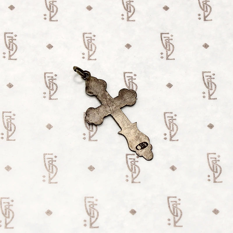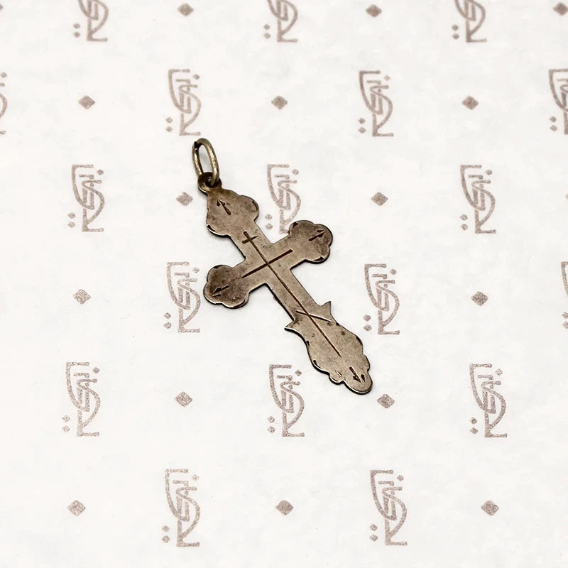 This antique Russian cross looks as though it has a storied history. It dates to circa 1910, just before the Bolshevik Revolution began. The budded 9k gold cross is engraved with a second cross that features the distinctive slanted crossbeam of the Russian Orthodox Church. The Russian Orthodox cross originated in the Byzantine Empire during the 6th century; in the modern era it is an important feature of Russia's cultural landscape. This cross will look beautiful worn on a slim ribbon, a historically accurate style.