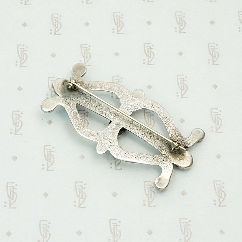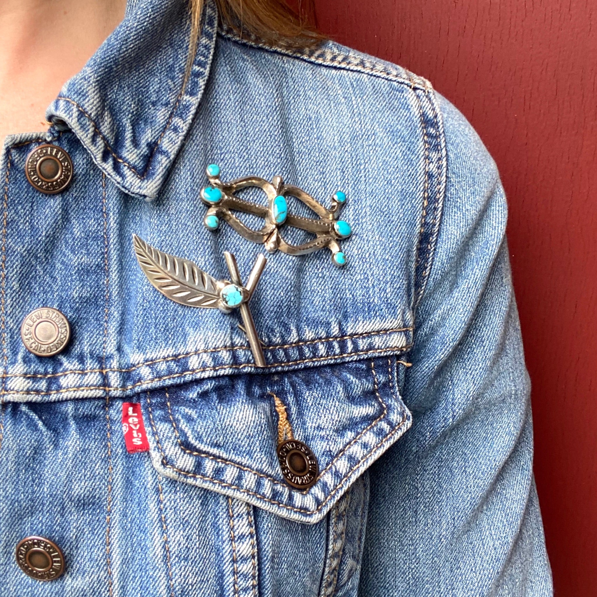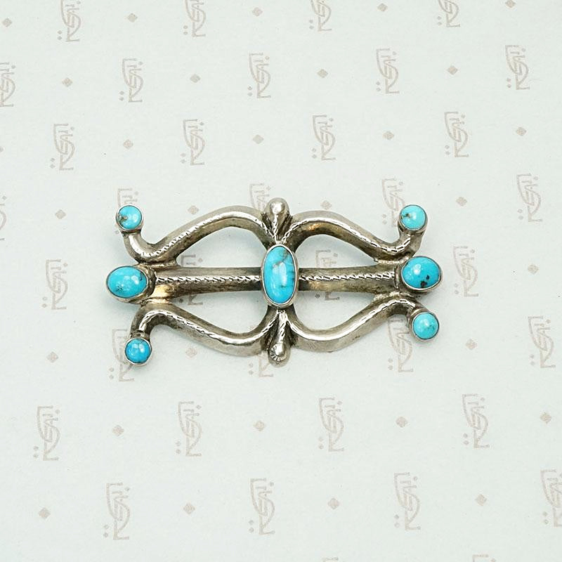 An elegant Native American brooch. Sand cast silver is set with pretty sky blue turquoise gems. The bright turquoise paired with the organic texture of the sand cast silver creates an attractive contrast. This lovely brooch is most likely a Navajo piece. Circa 1940.