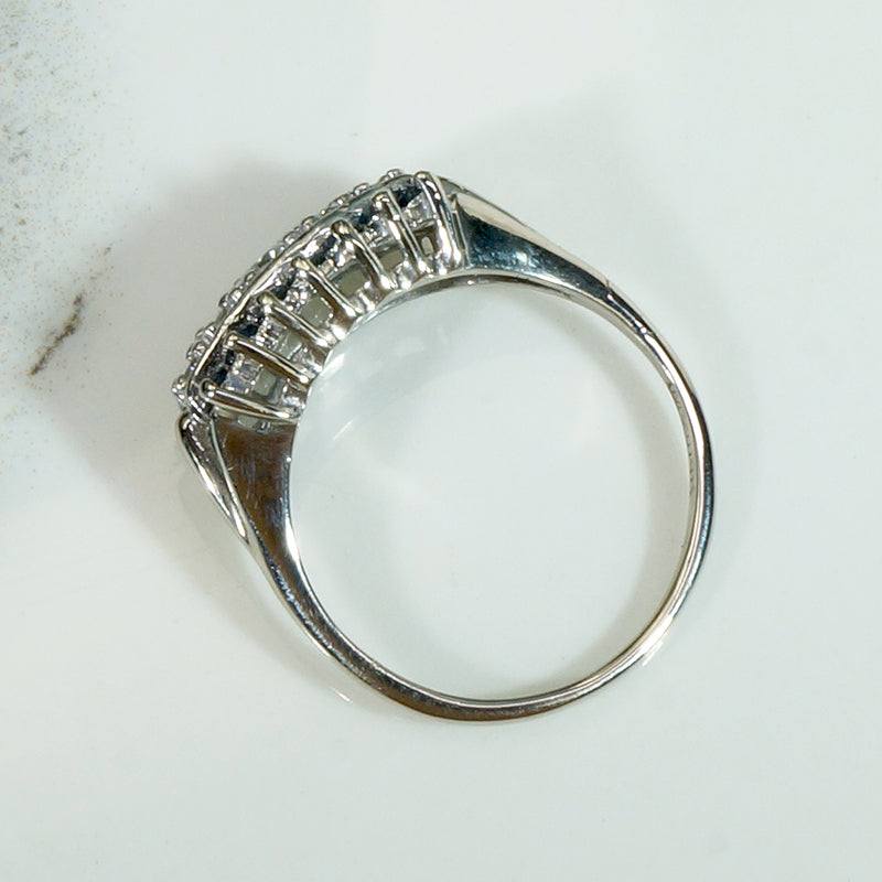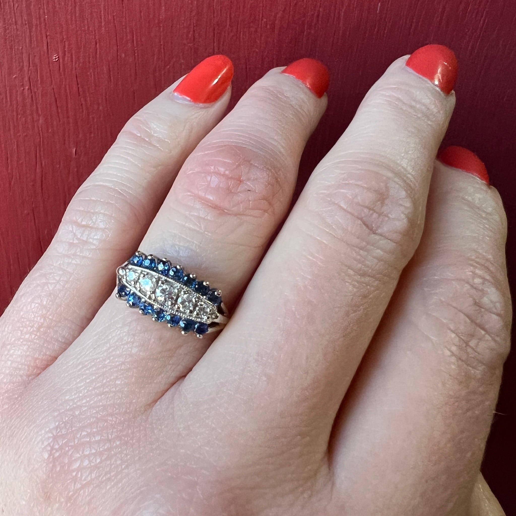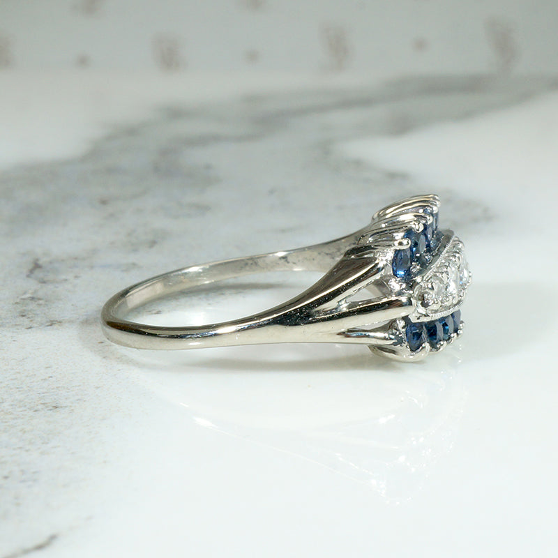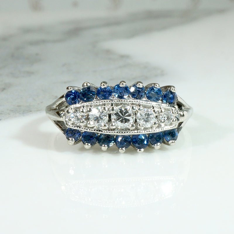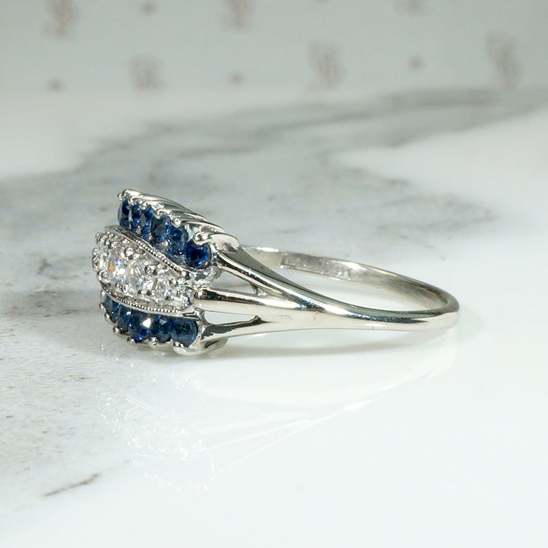 Rows of diamonds and sapphires sparkle in this unusual 14k white gold band. Five graduated diamonds are set in a frame of engraved milgrain. Pretty blue sapphires edge the top and bottom of the diamonds, similar to the "eye" bands popular during the Edwardian era. The prong-set sapphires create a pleasing contrast to the inset diamonds. The gem-set top of the ring sits between triple-split shoulders that taper into a slim band. Circa 1970.