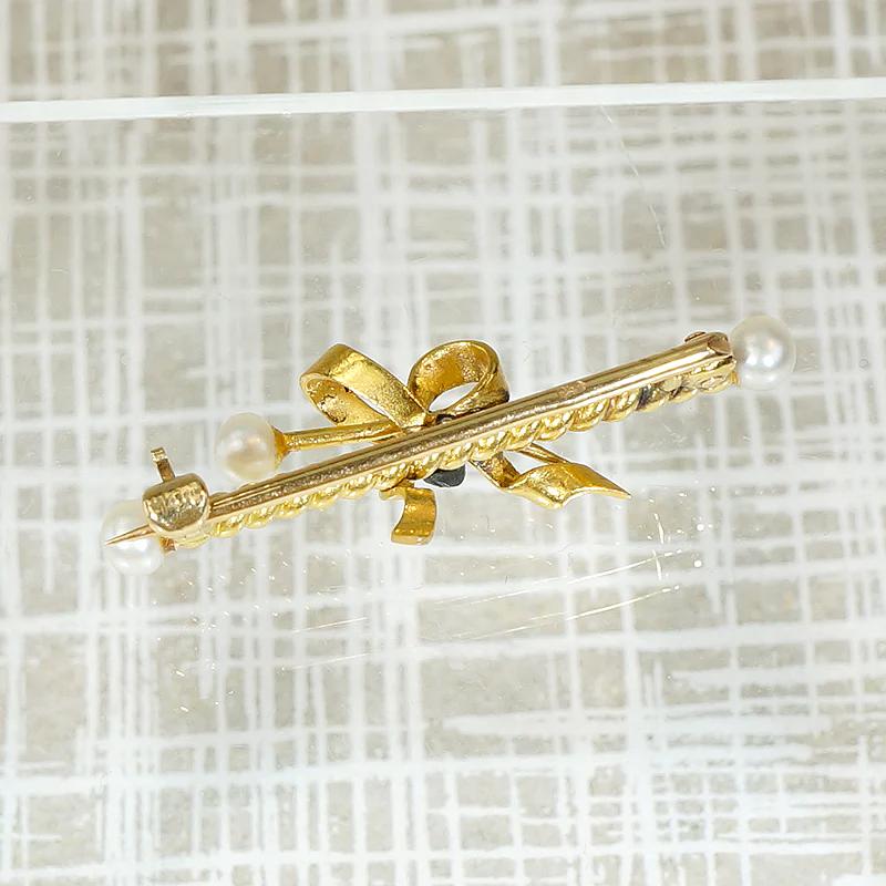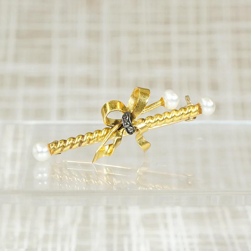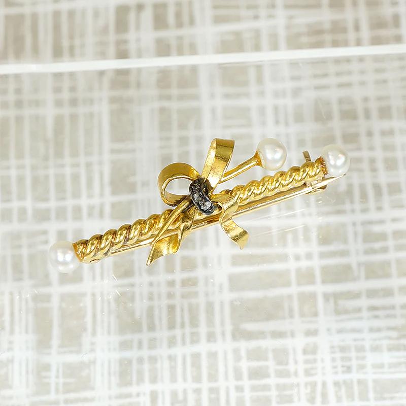 This sweet little Victorian brooch is tied with a saucy, diamond-set bow. A bar of twisted 18k yellow gold is capped at each end with a glowing white pearl. A bow of rippling gold ribbon ties a sprig of gold and pearl to the bar; its knot is depicted by a row of rose cut diamonds set in silver. Wear this on the collar of your favorite vintage blouse. Perfection. The original Victorian c-clasp was replaced in the 1920s with a security clasp. Circa 1890.