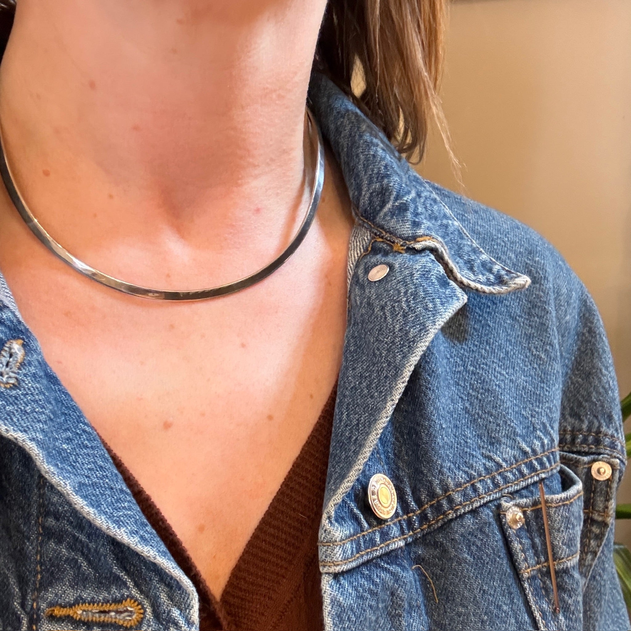 This elegant torc is a thin, flat bar of sterling silver that wraps around the neck to form a sensual curve over the collarbone. A refined, lightweight piece that feels both ancient and futuristic. Circa 1970.