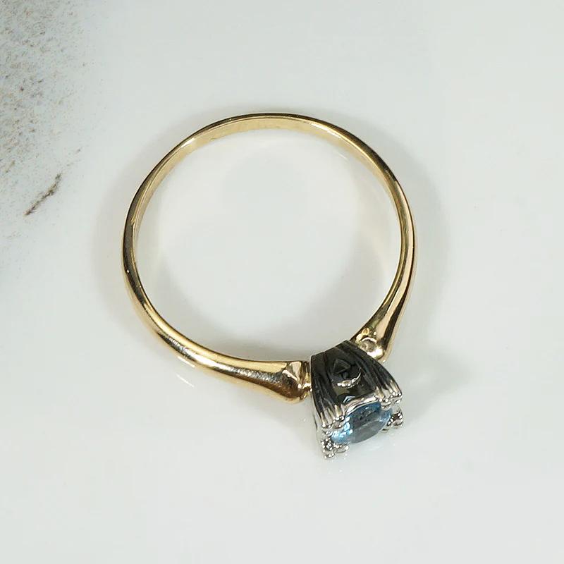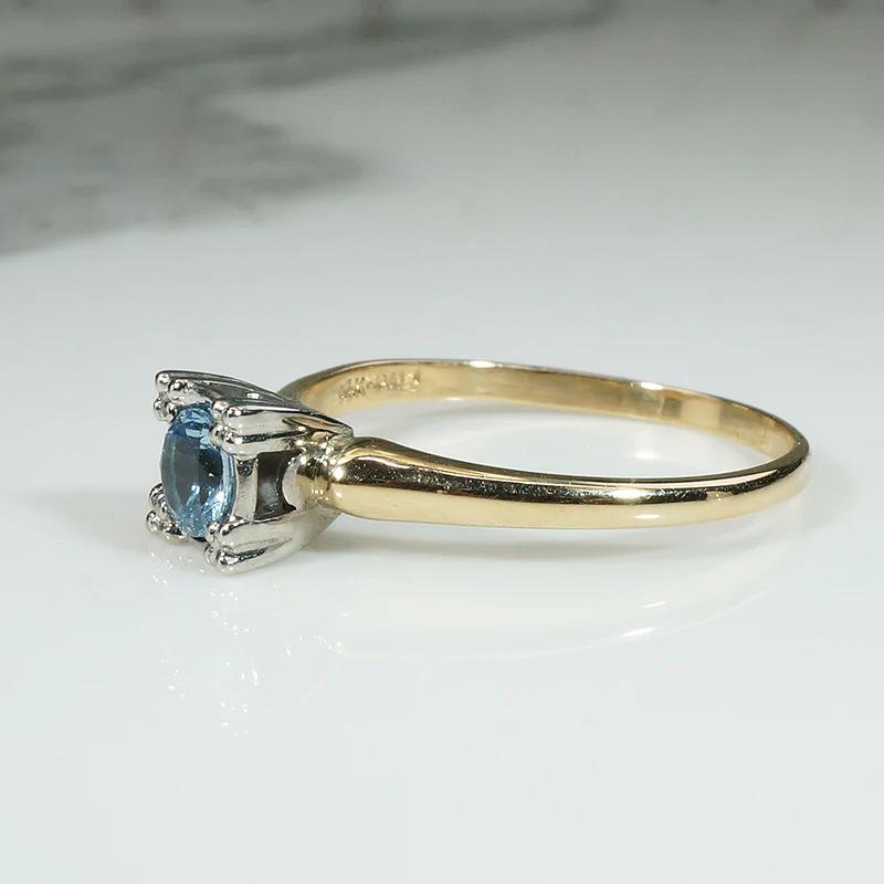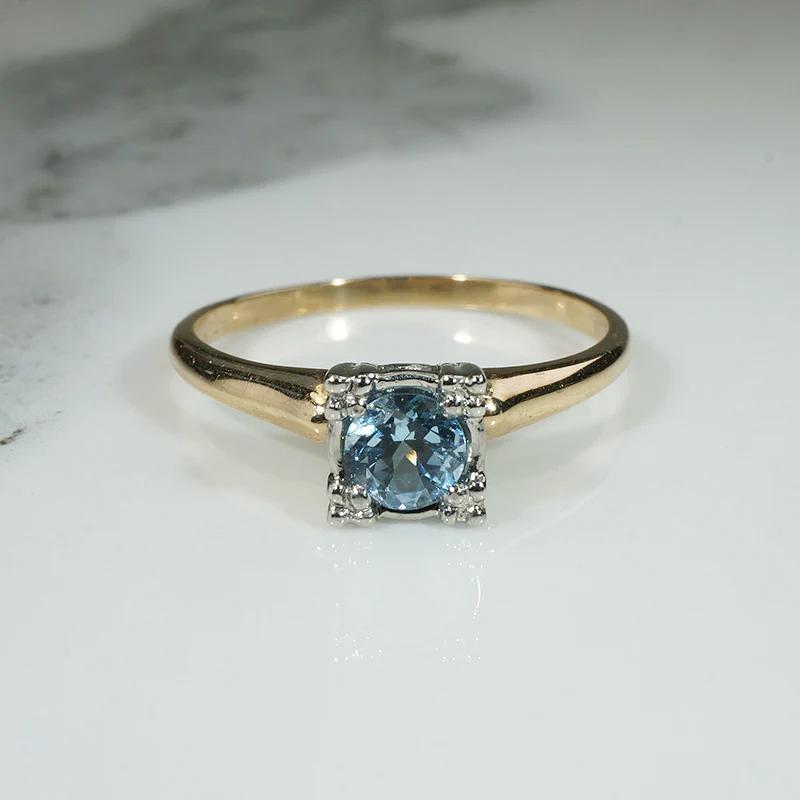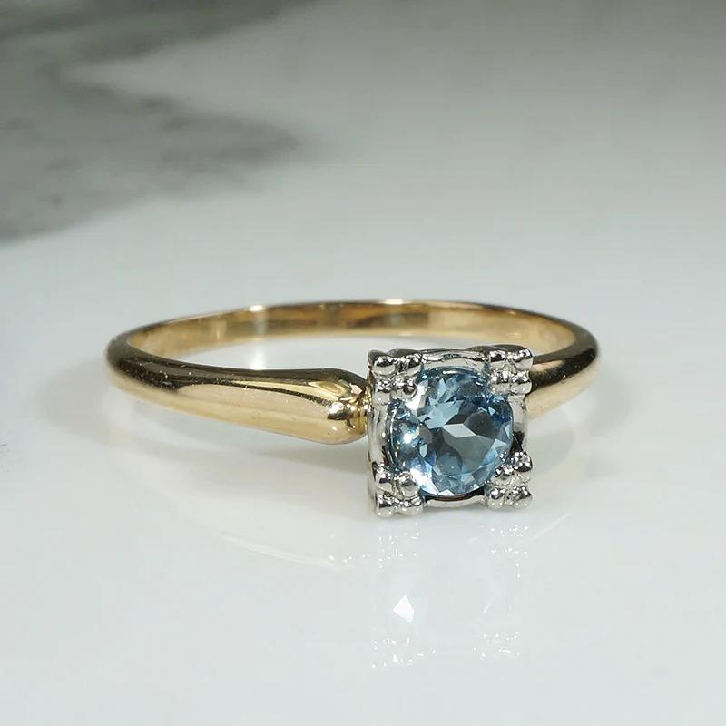 A glacial blue aquamarine shimmers in this classic two-tone solitaire ring. The 0.29ct stone sits in a fancy, trefoil-pronged palladium head raised over a 14k yellow gold ring. The ring's curvaceous pinched shoulders taper into a slim band. Yellow gold and palladium were a popular metal combination during World War II when platinum was reserved for the war effort. Aquamarine always looks its best in two-tone metal enhanced by the combination of warm and cool tones. Circa 1940.