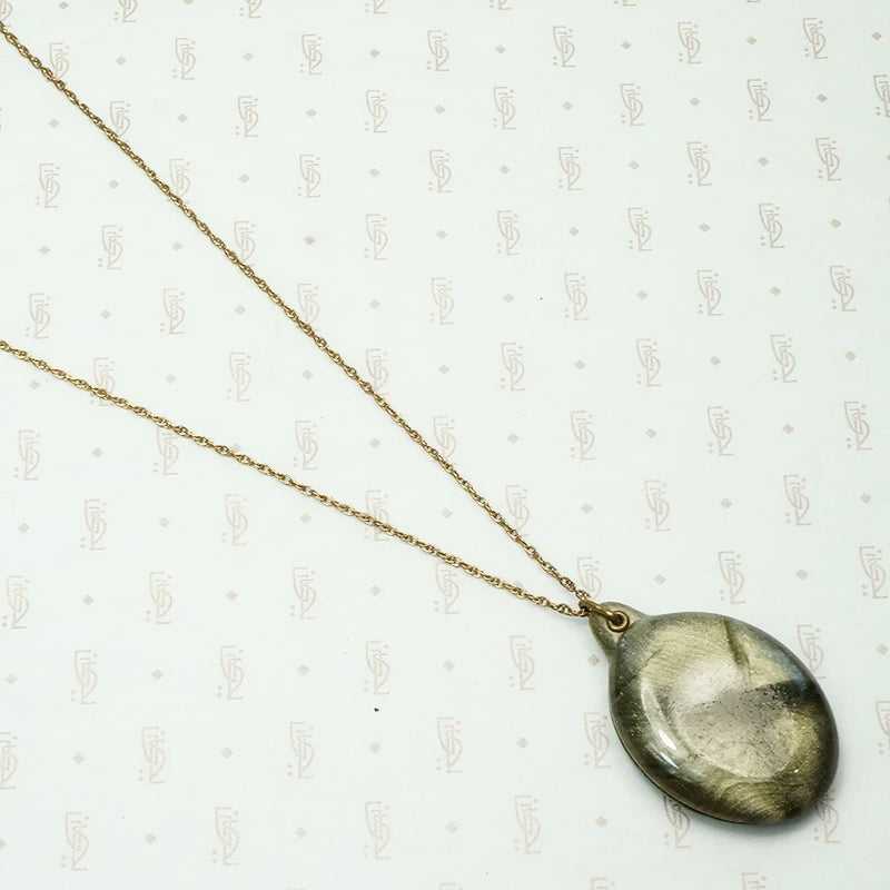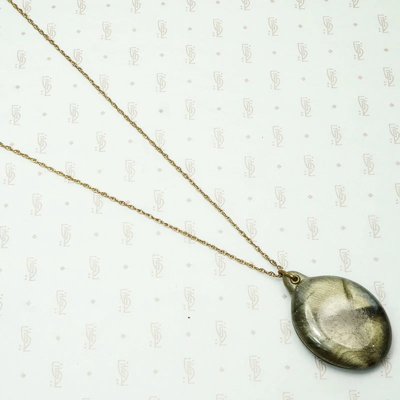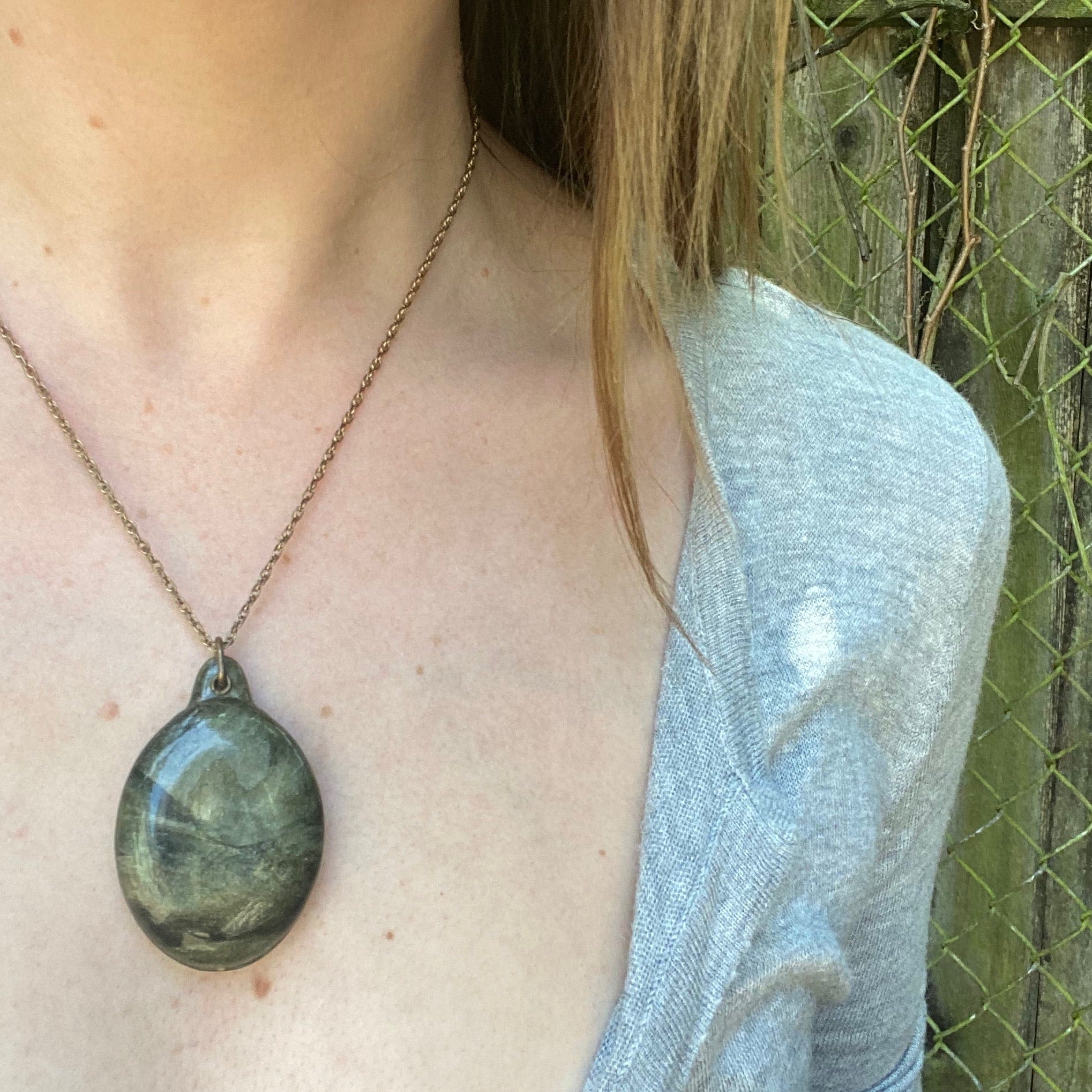 Stunning iridescent olive green celluloid, the colors change and shift with the light. This unique locket has a sliding mechanism and holds its charming original photos. Celluloid is an early plastic that was used for everything from kitchen utensils to jewelry in the early 20th century. The locket is suspended from a gold filled rope chain. Always in style, vintage and antique jewels are timeless.