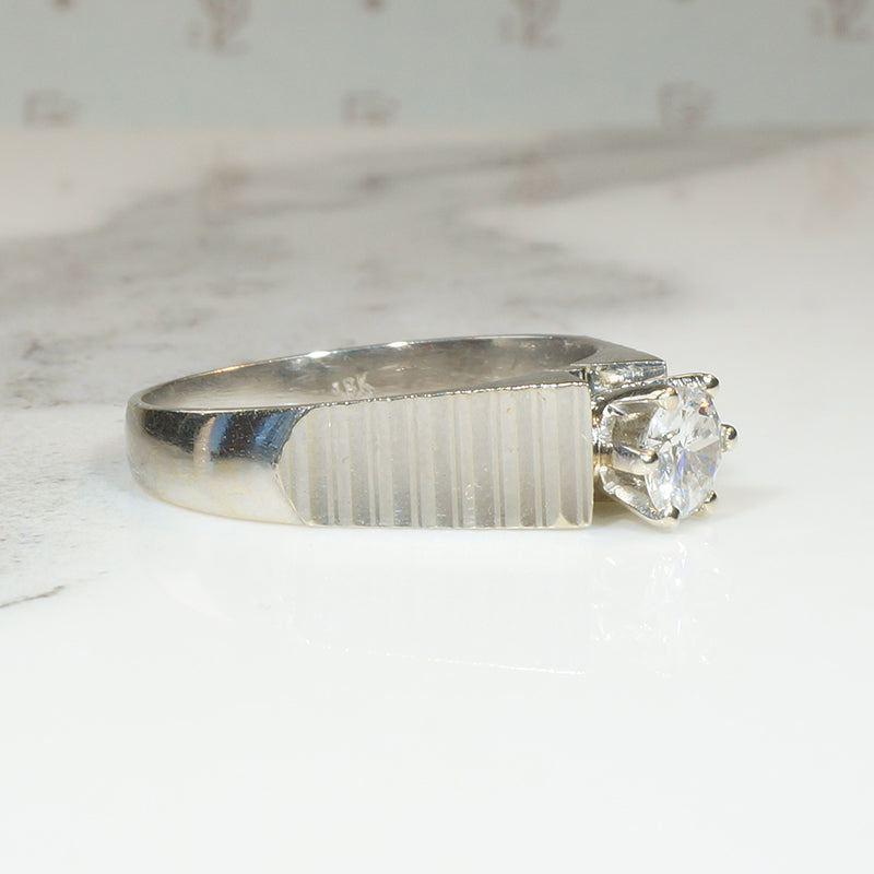 Intriguing 1970s 18k white gold solitaire. This unique engagement ring has a highly polished stair-step design from the diamond to the smoothly curved band at the back. The sparkling diamond at the center is white and bright, held in a six-prong head. The diamond is 1/2 carat, SI clarity and H-I color. The overall effect of this solitaire engagement ring is a shimmering dance of light.