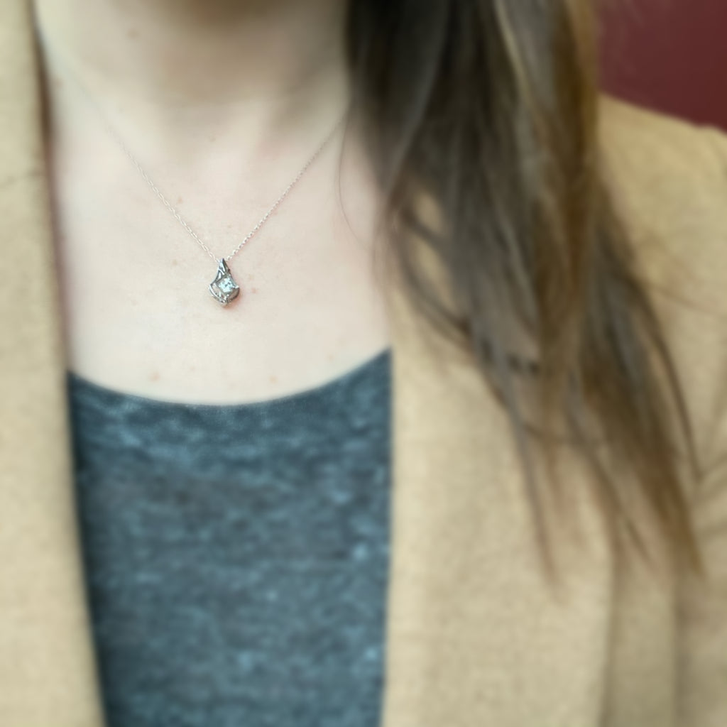 Stunning Art Deco diamond pendant in 18k white gold. The .30ct Old European cut diamond is SI/J and sparkles like mad in its prettily detailed setting. The back of the pendant will accommodate a ribbon or heavy chain. It comes with the recycled 18k white gold chain pictured. Circa 1920, originally a stick pin, it was converted in house to a pendant.