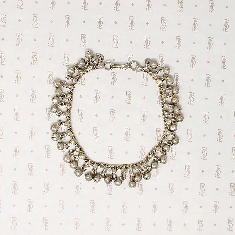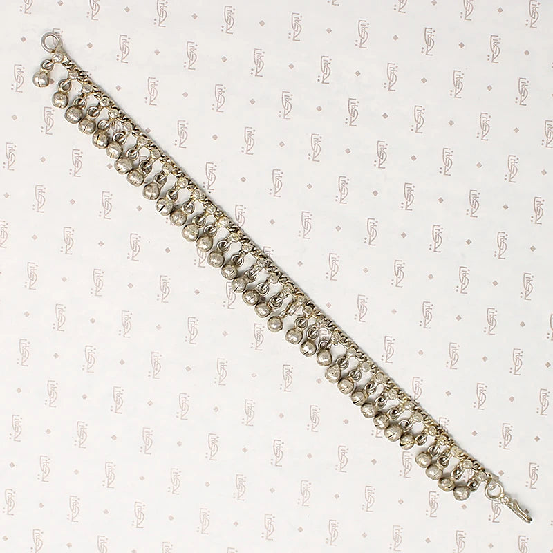 This Indian silver bell anklet is meant to be worn while you dance. The bells dangle from a low grade silver chain that clasps around the ankle with a hook and eye closure. A romantic and bohemian piece circa 1960. It is said the pretty tinkling of bells attracts faeries.