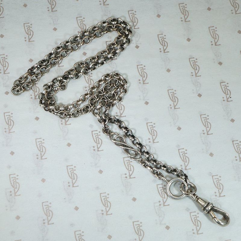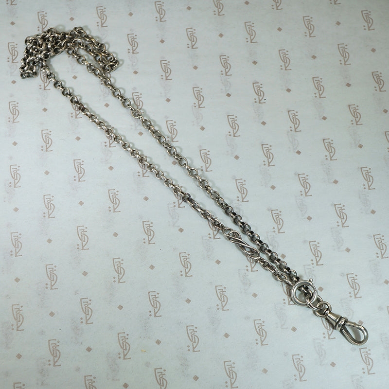 Lengths of rolling link cable chain and a beautifully detailed knot make this a simple and beautiful chain, the bolt ring at the front closes it and the watch hook is ready to hold all your favourite pieces. The ingredients date from 1910-20.