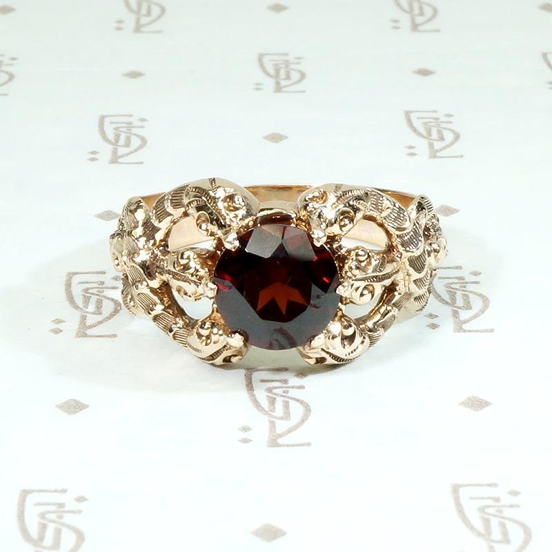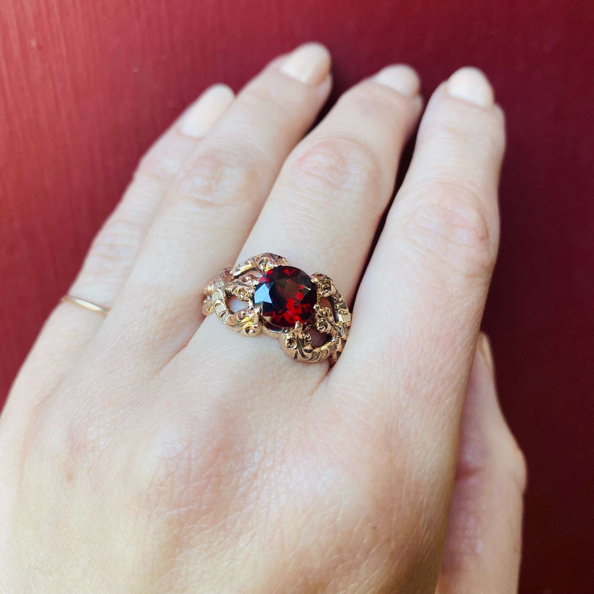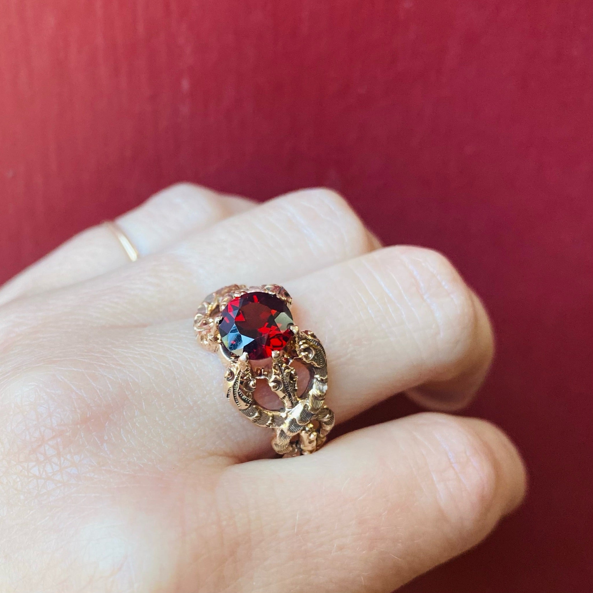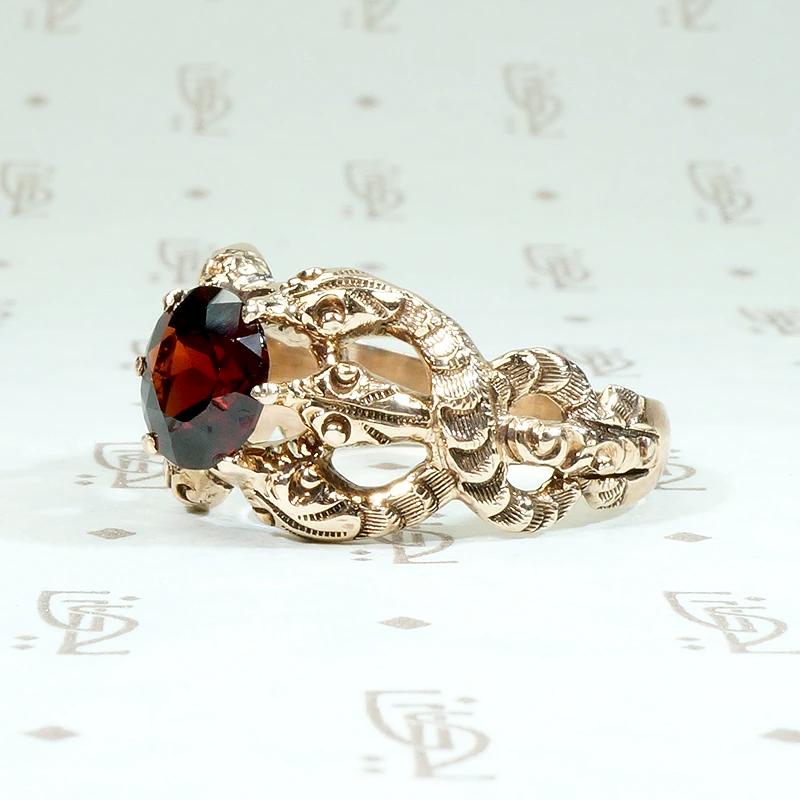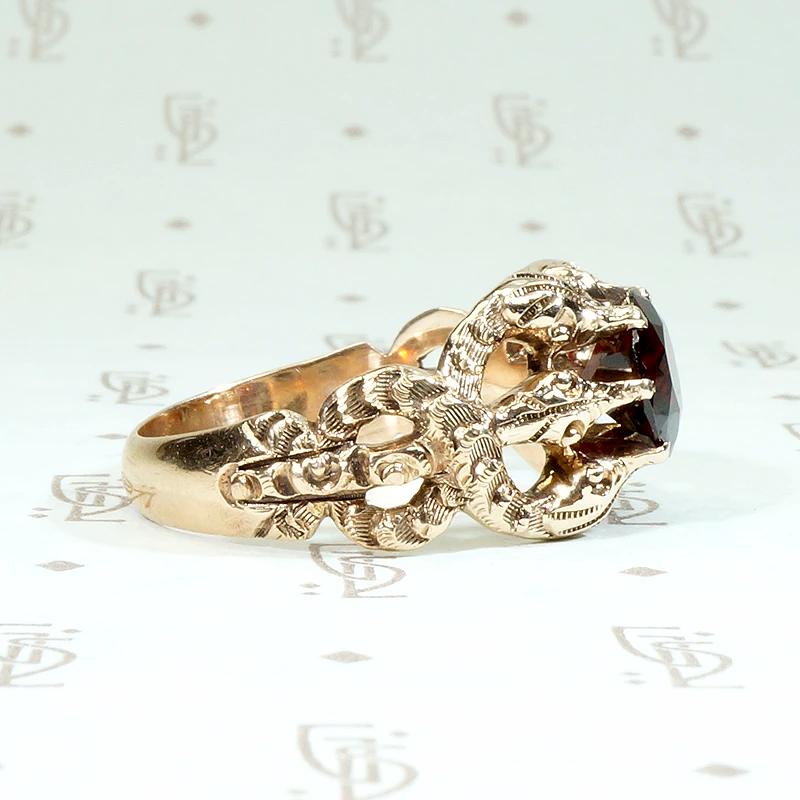 Darkly romantic and rich with gothic drama. A deep red garnet is presented by six slinky snakes in this incredible Victorian ring. Each side of the 10k rose gold ring is formed by three twining snakes, each heavily engraved. The snakes hold the wine-dark garnet in their mouths. Jewels in the form of snakes were often given as love tokens in the Victorian era, they symbolize eternal love. This ring would make a lovely engagement or wedding ring, its beauty speaks to the connection and contentment of two beings. Circa 1860.