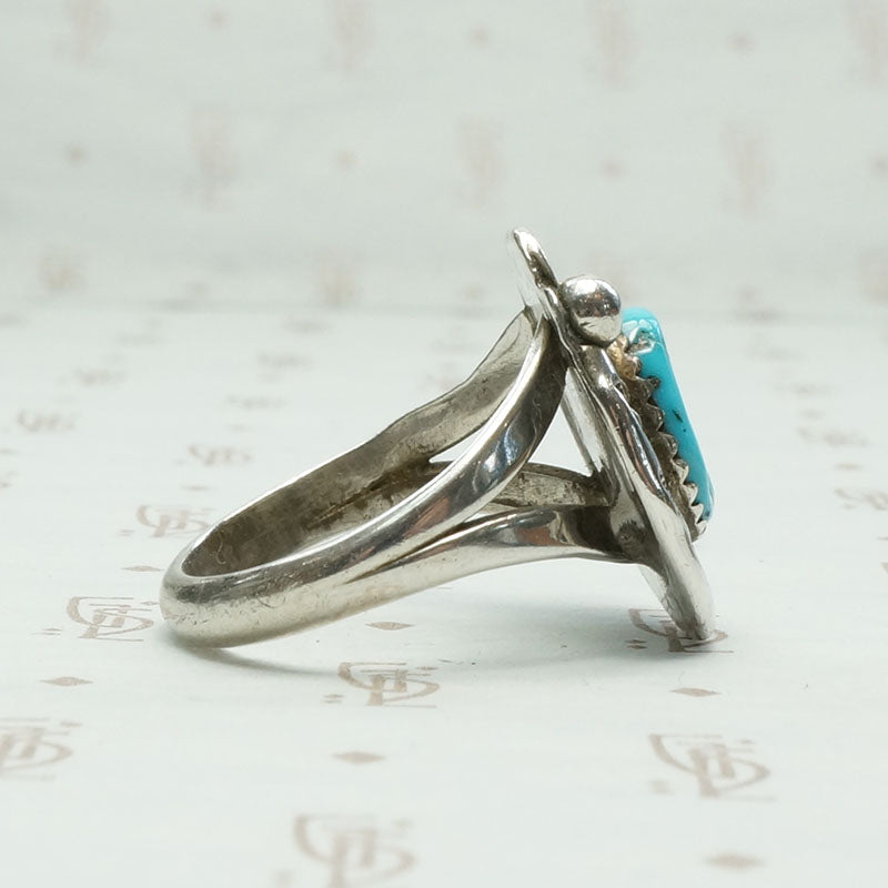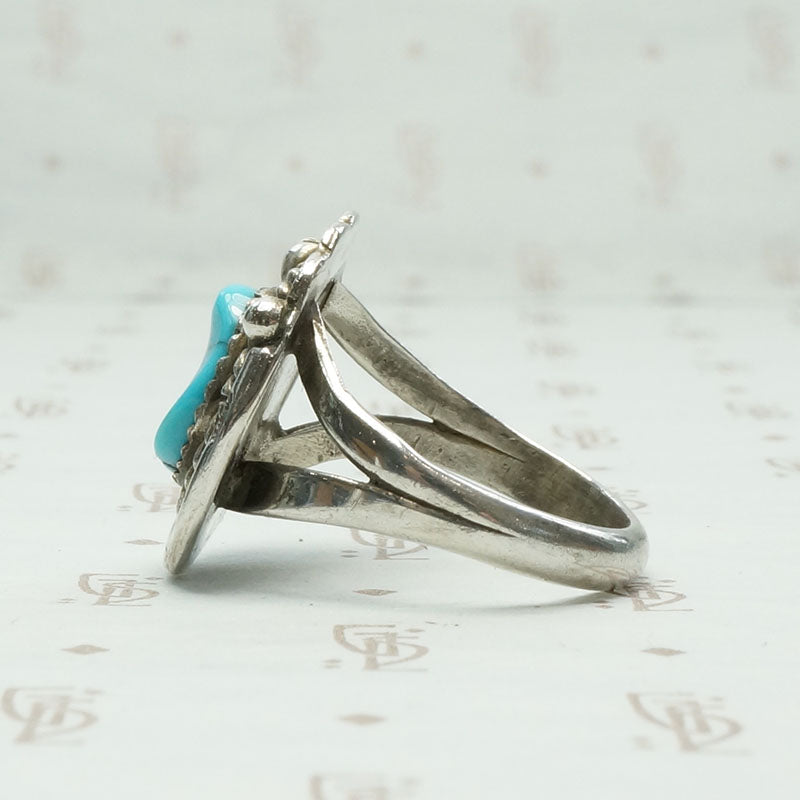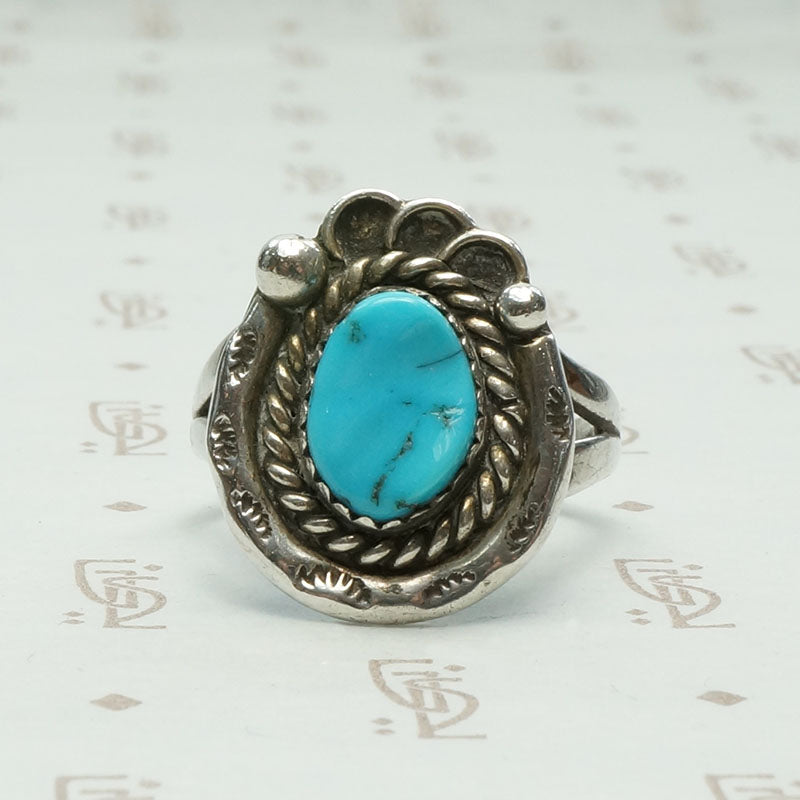 This beautiful hand made ring features an incredible Sleeping Beauty turquoise. The asymmetric sterling silver setting has all the details: the sawtooth bezel set gem is surrounded with rope detail and cradled in a stylized horseshoe. A scalloped crown sits at the top and the horseshoe is stamped with sunset designs at the bottom. The decorative top sits above a a triple split shouldered band. Circa 1960-1970.