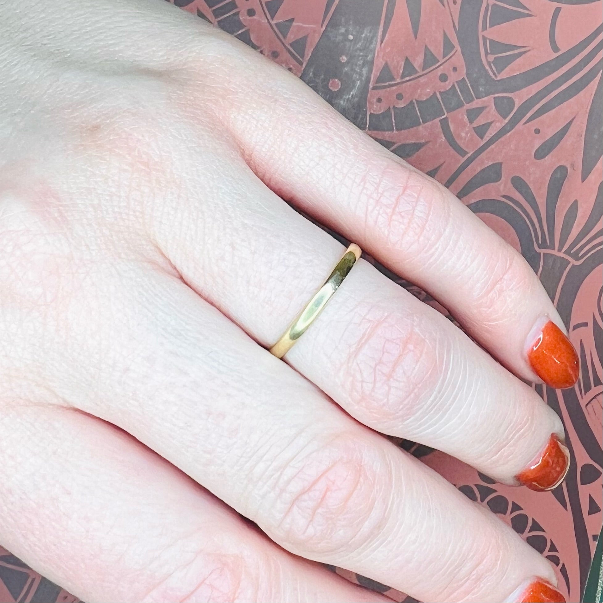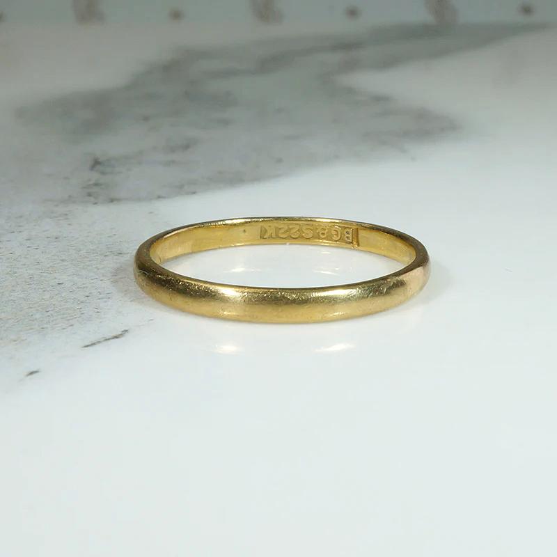 This slim 22k gold band is a sumptuous slip of a thing. The buttery band is a light half round style: smooth and comfortable. The interior of the band is stamped "BG&S 22k." There is nothing quite as luxe as high carat antique gold. Circa 1900.