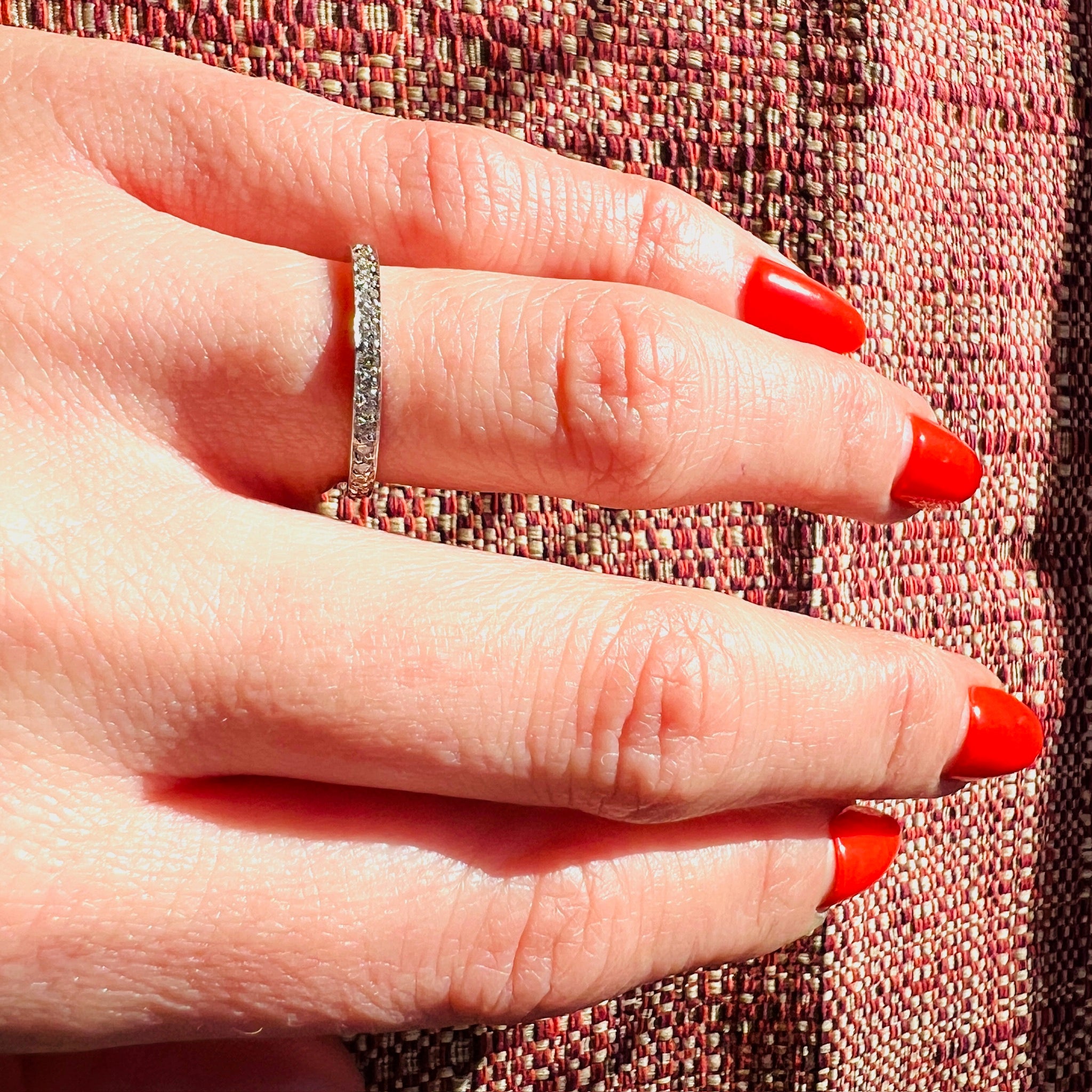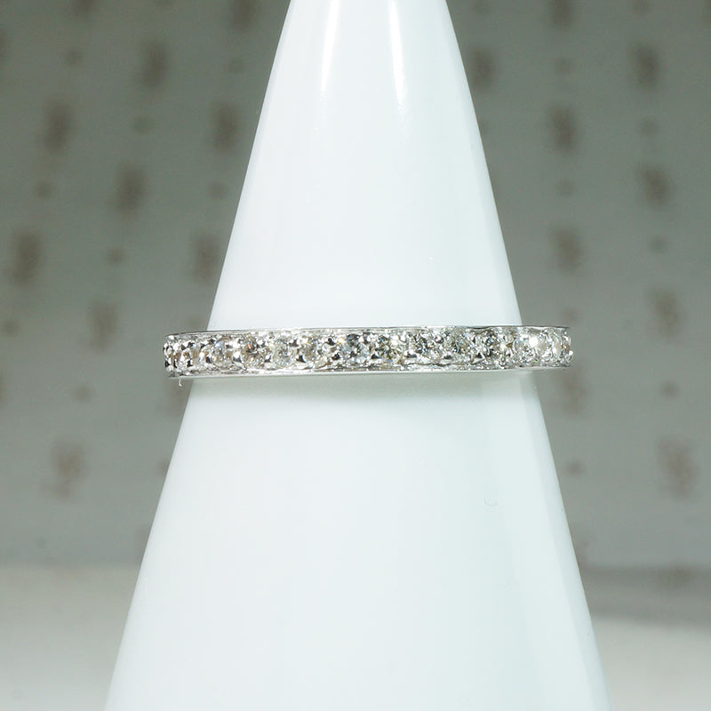 A slender diamond eternity band with .35tcw of stones set in icy white 18k gold. The bead-set diamonds are bright and sparkling in their closed-back settings. Slim and balanced, this eternity band will look great worn in a stack or paired with your vintage engagement ring. Circa 1980.