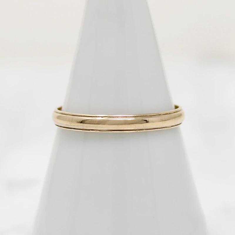 This 14k yellow gold vintage wedding band has a half round exterior curve and a stepped edge. The band is lightweight and slim, with a flat interior. This attractive band is a larger size, always a pleasure to find. The band is marked "14k" and signed "Wood." Circa 1950.