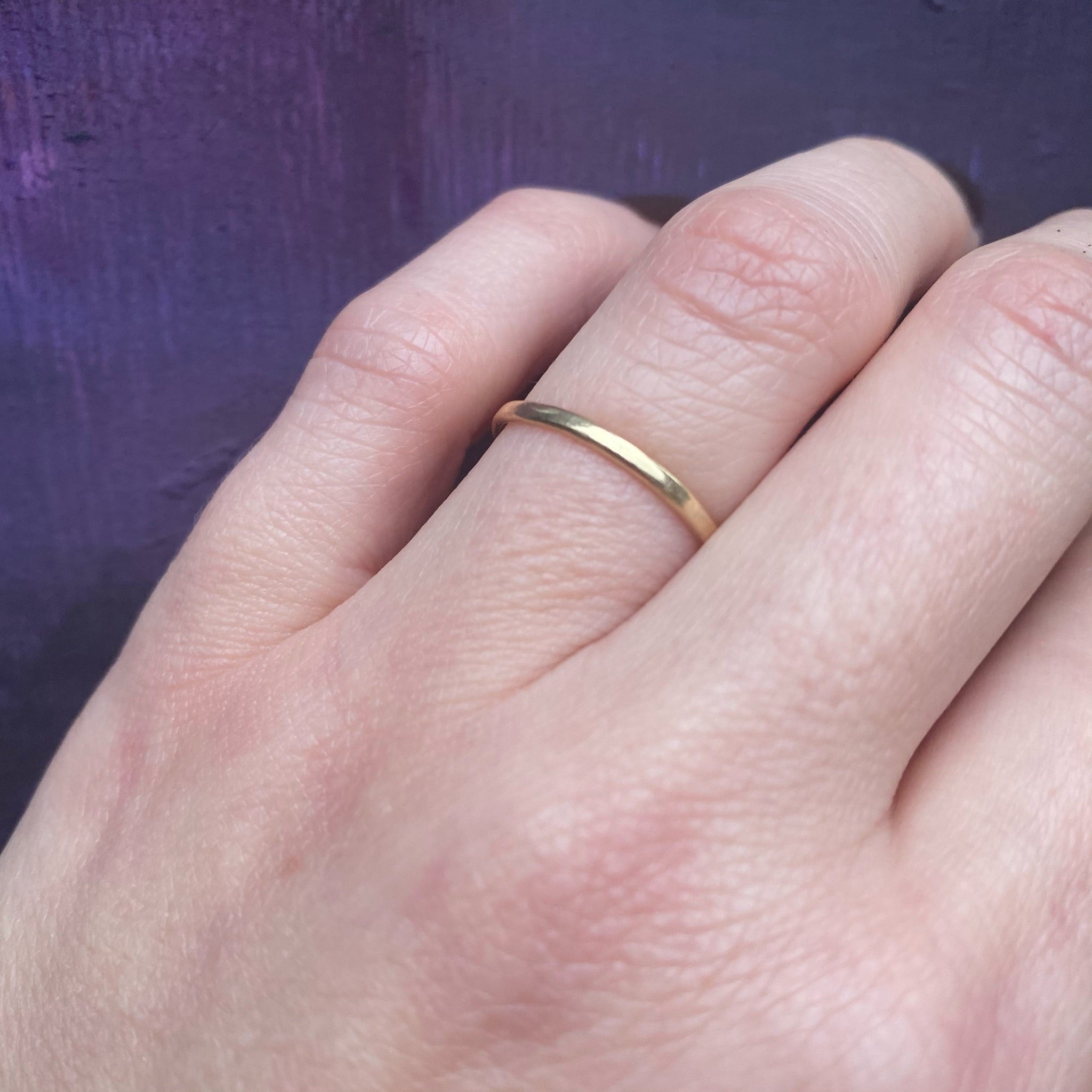 This vintage 14k gold band is narrow in width and lightweight. This is a very versatile piece, ideal for any time you are looking for a slim pop of gold. It is perfect to wear alone, in a stack or paired with your engagement ring. Circa 1940.