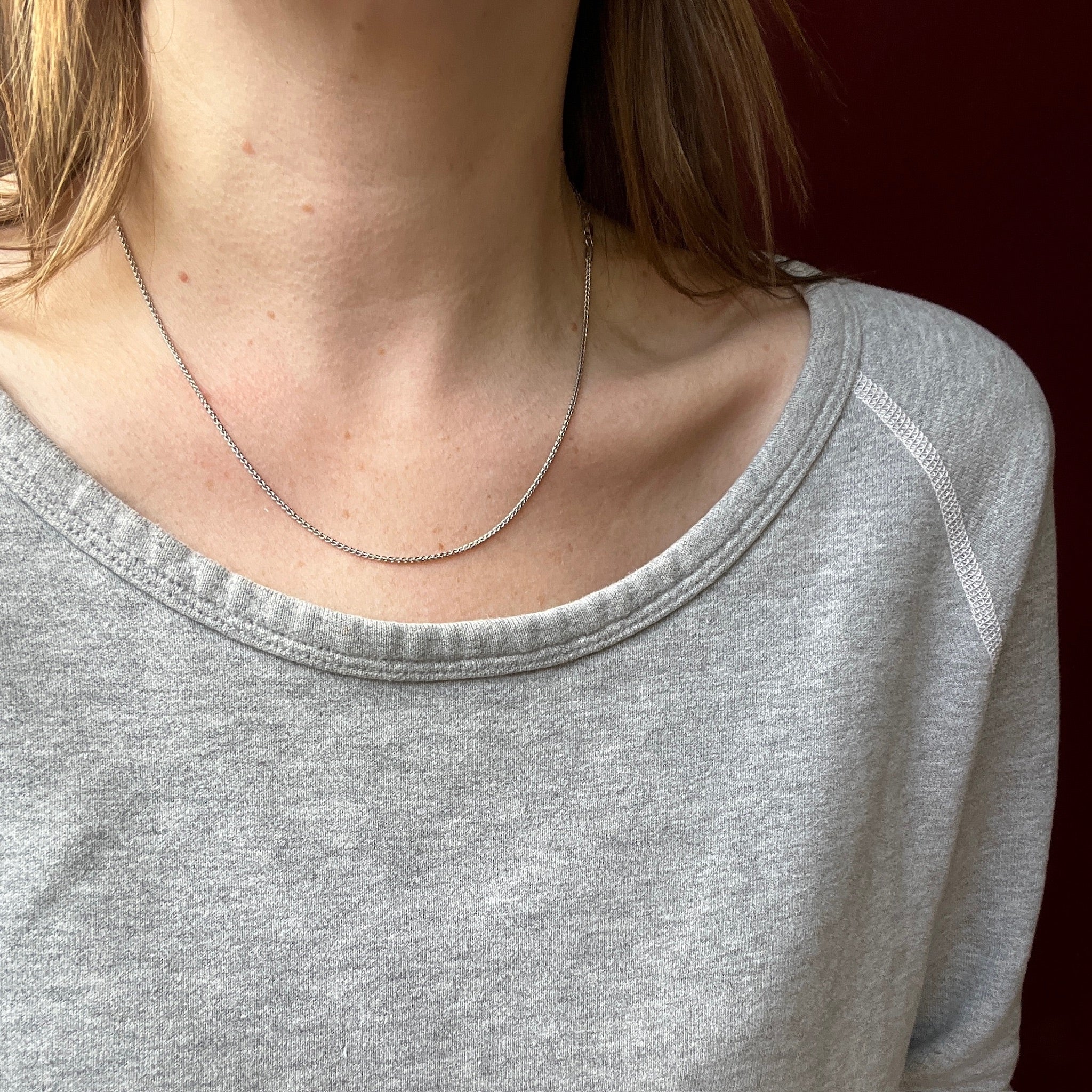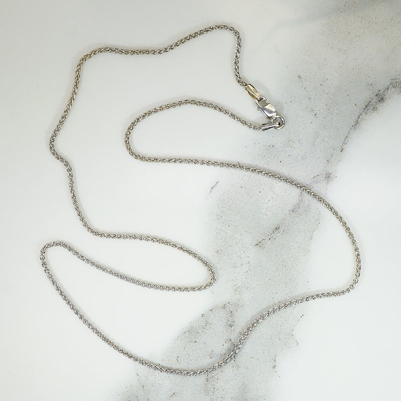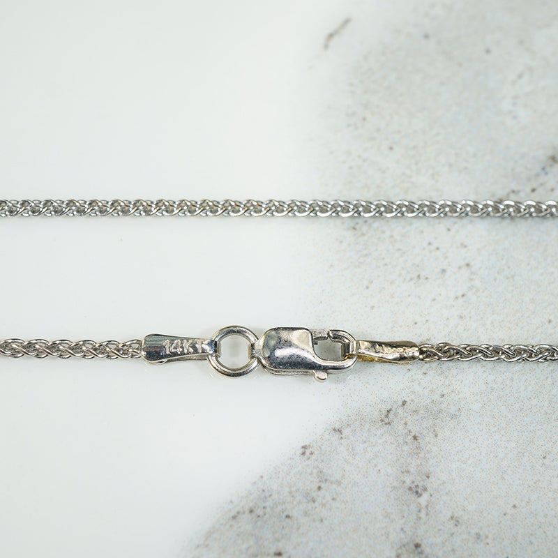 A slinky, supple 14k white gold wheat link chain. The tightly plaited links are finished with a sturdy lobster clasp. This chain looks great when worn alone and is the perfect length and weight for displaying your favorite charms and pendants. Circa 1980.