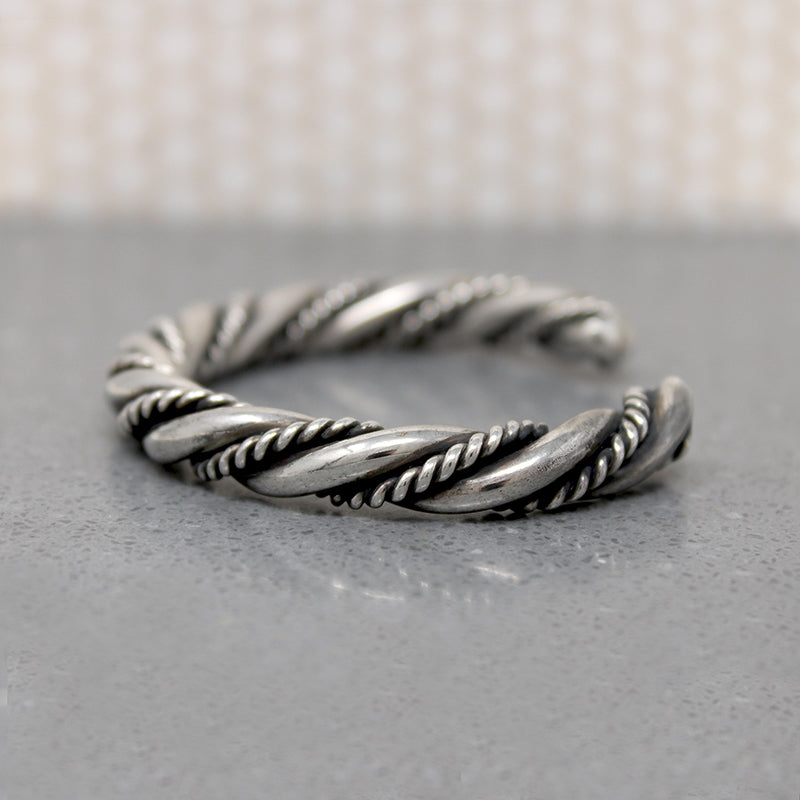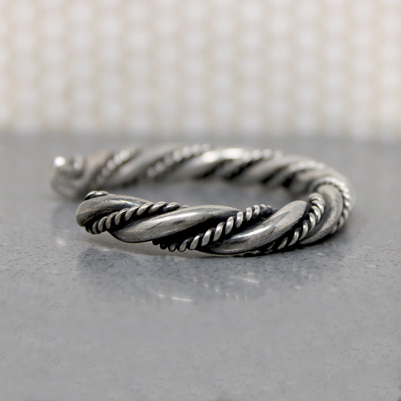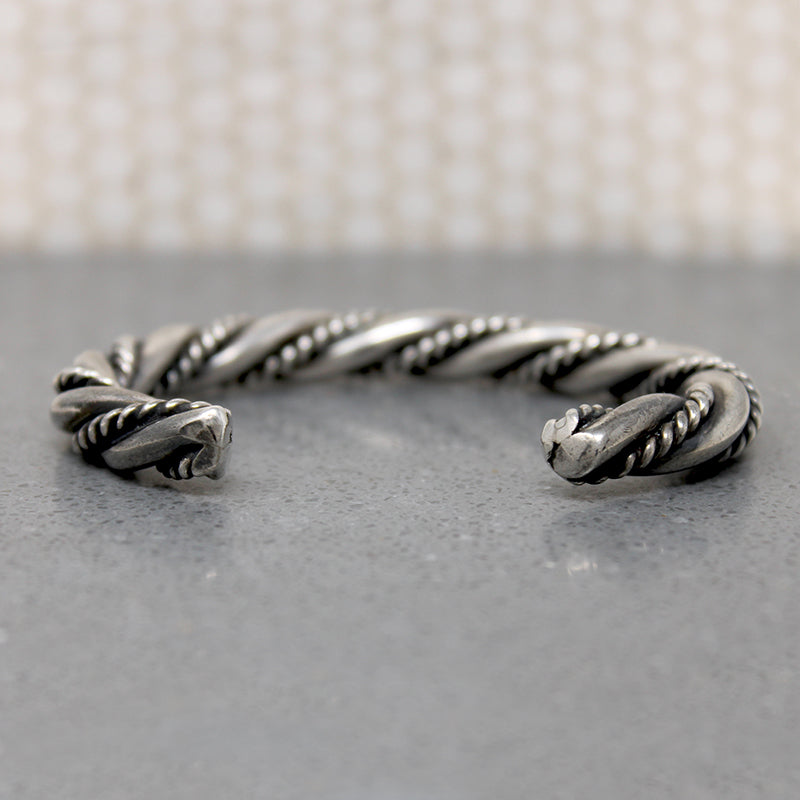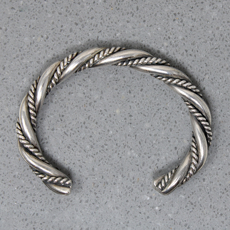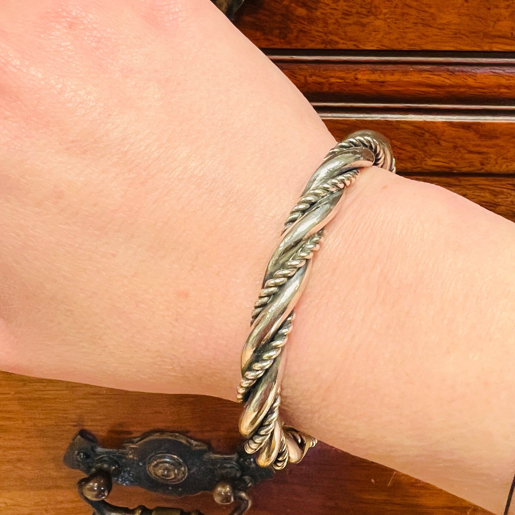Twisted coin silver cuff bracelet. A little silver twist is twisted into a larger silver twist...it's so meta. This handsome cuff will look great on its own or layered with other bracelets. Circa 1960.