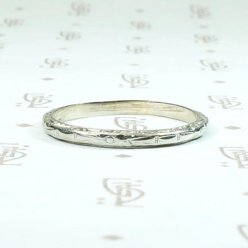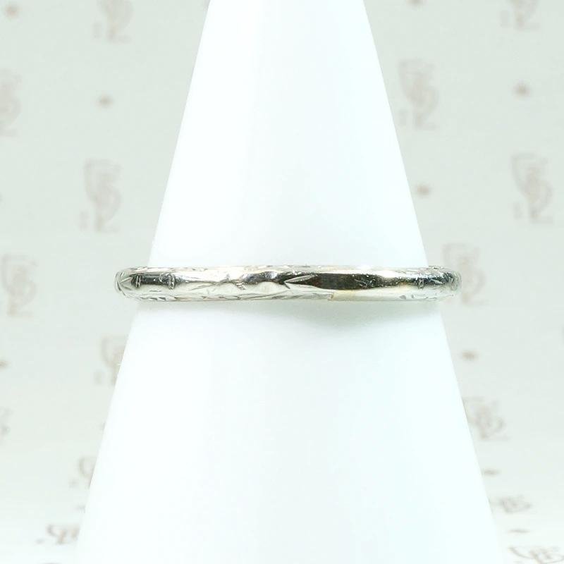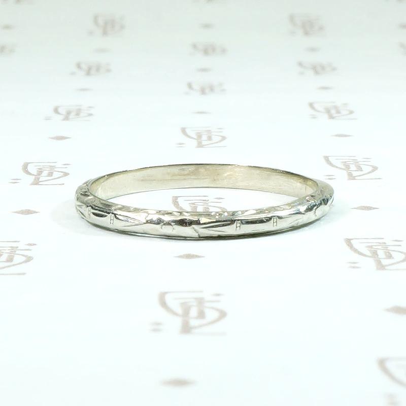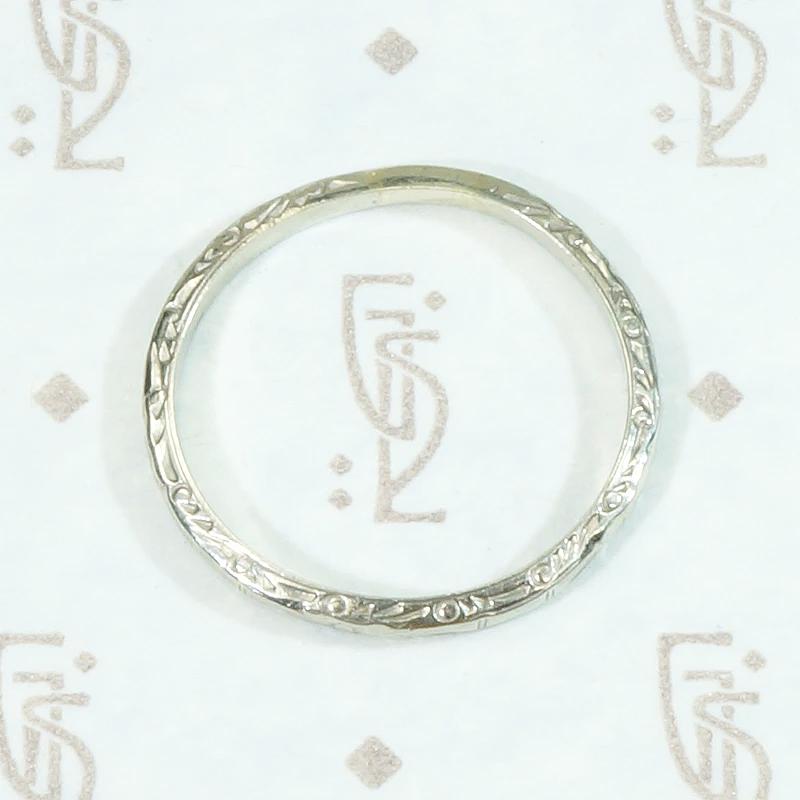 This lovely Art Deco band is cast in 18k white gold, with a soft floral pattern and border of engraved edges. Add this band to your stack or pair it with your vintage engagement ring. Circa 1920.