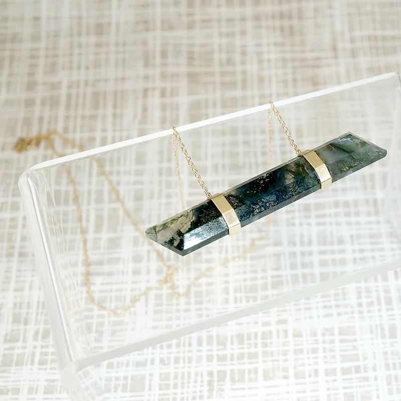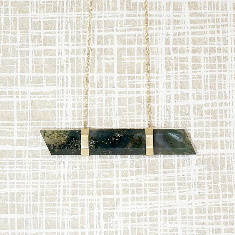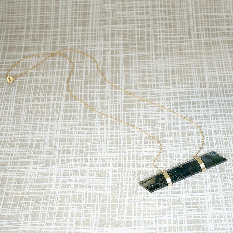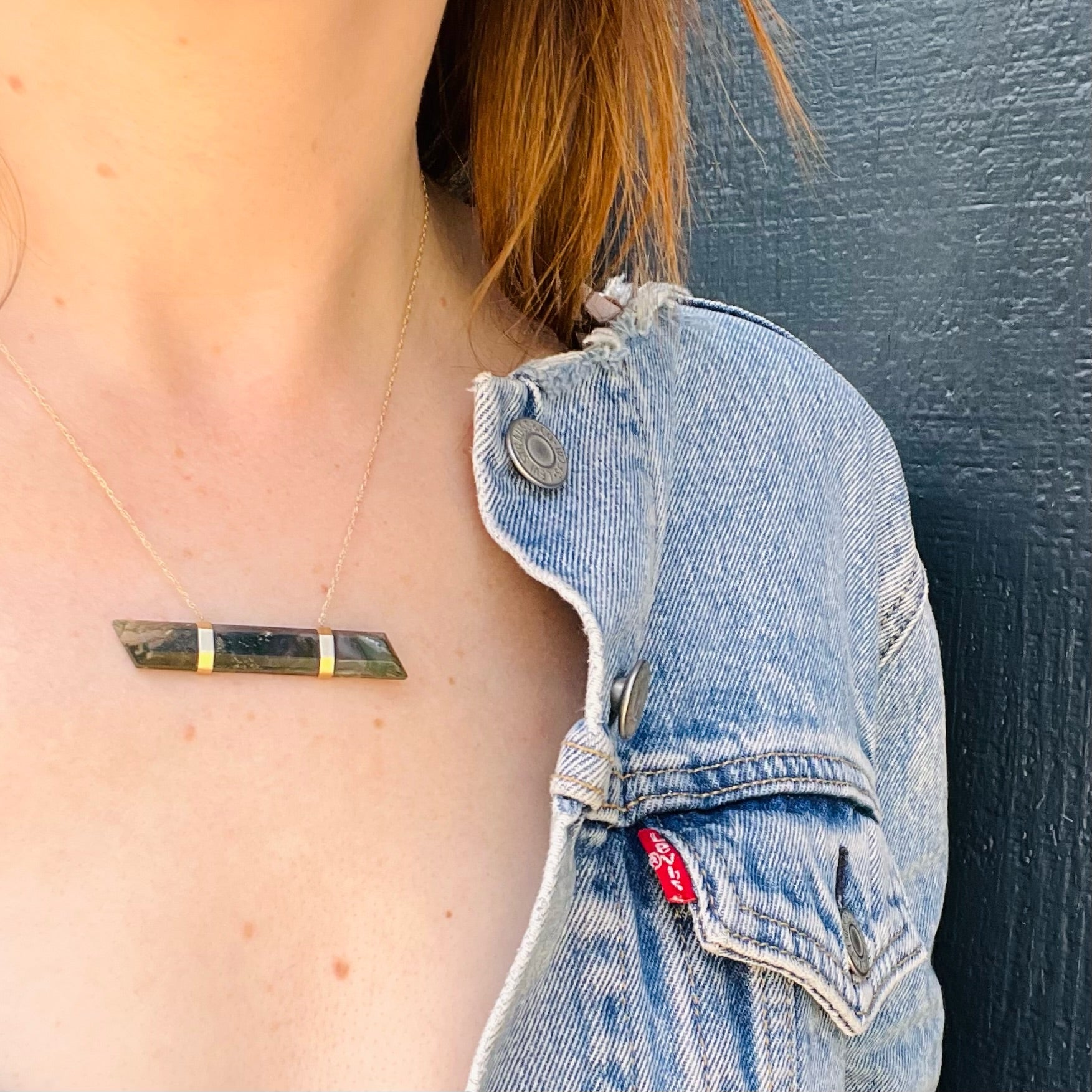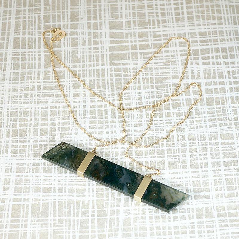 Moss agate was named for the wonderful fine tracery of green moss-like fronds that run through the stone. This moss agate is wonderful, by parts translucent and milky opaque, with vivid green mossy mineral filaments. The natural beauty of the agate is refined by the balanced design of this elegant Edwardian necklace. A beveled-edged bar of agate is banded in 14k yellow gold. The pendant is then suspended horizontally from recycled 14k yellow gold rope chain. It's a wonderful piece, both sophisticated and organic. Circa 1900.