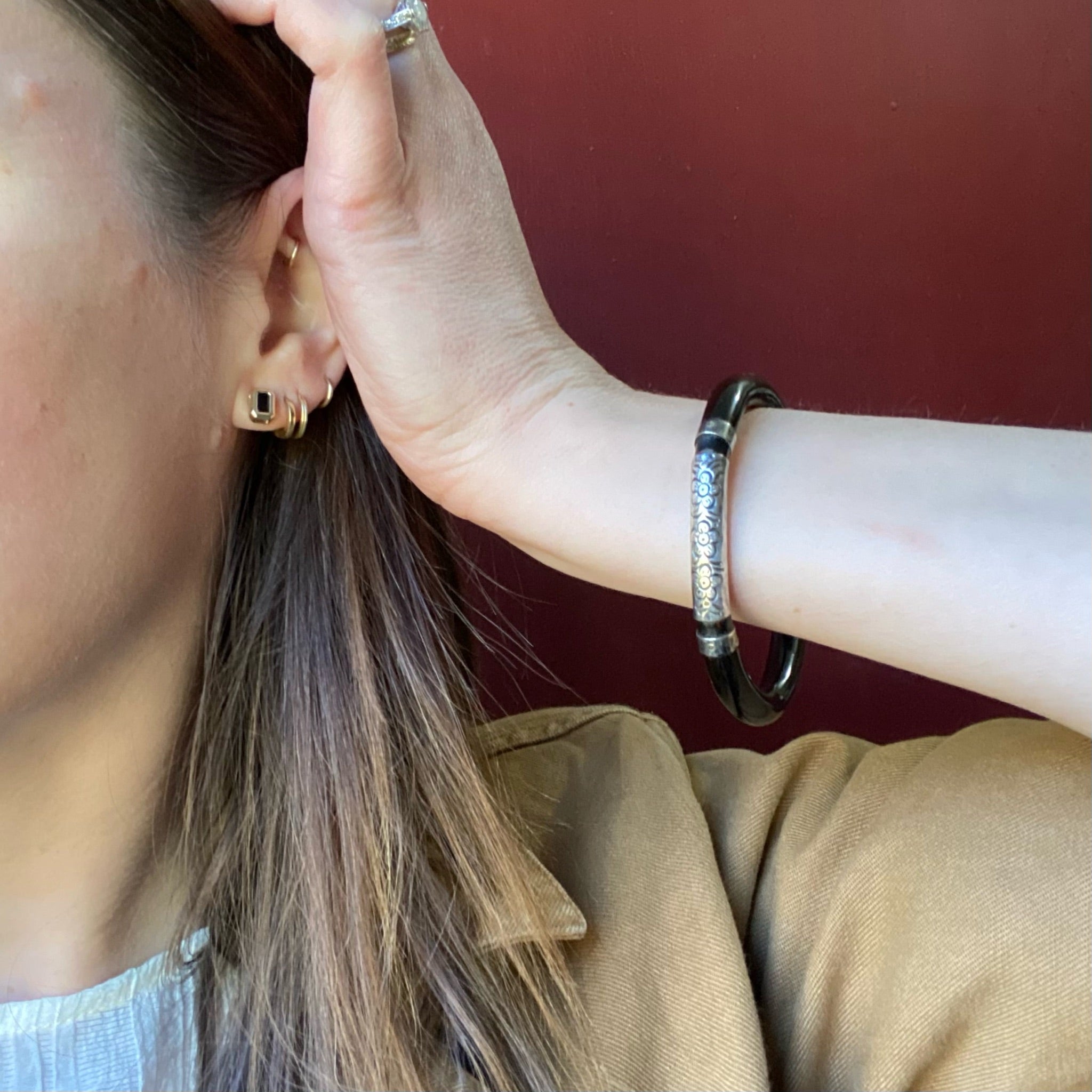 Knock them cold in black and gold. These vintage stud earrings are so sophisticated. Rectangular black onyx stones with faceted edges are set in 14k yellow gold bezels. The gold settings are sleek with beveled corners and rounded edges. The bezels make these stud earrings perfect for every day wear, they are comfortable and won't snag your hair or clothing.