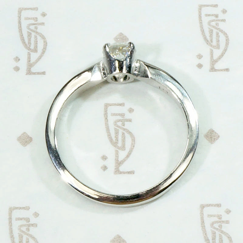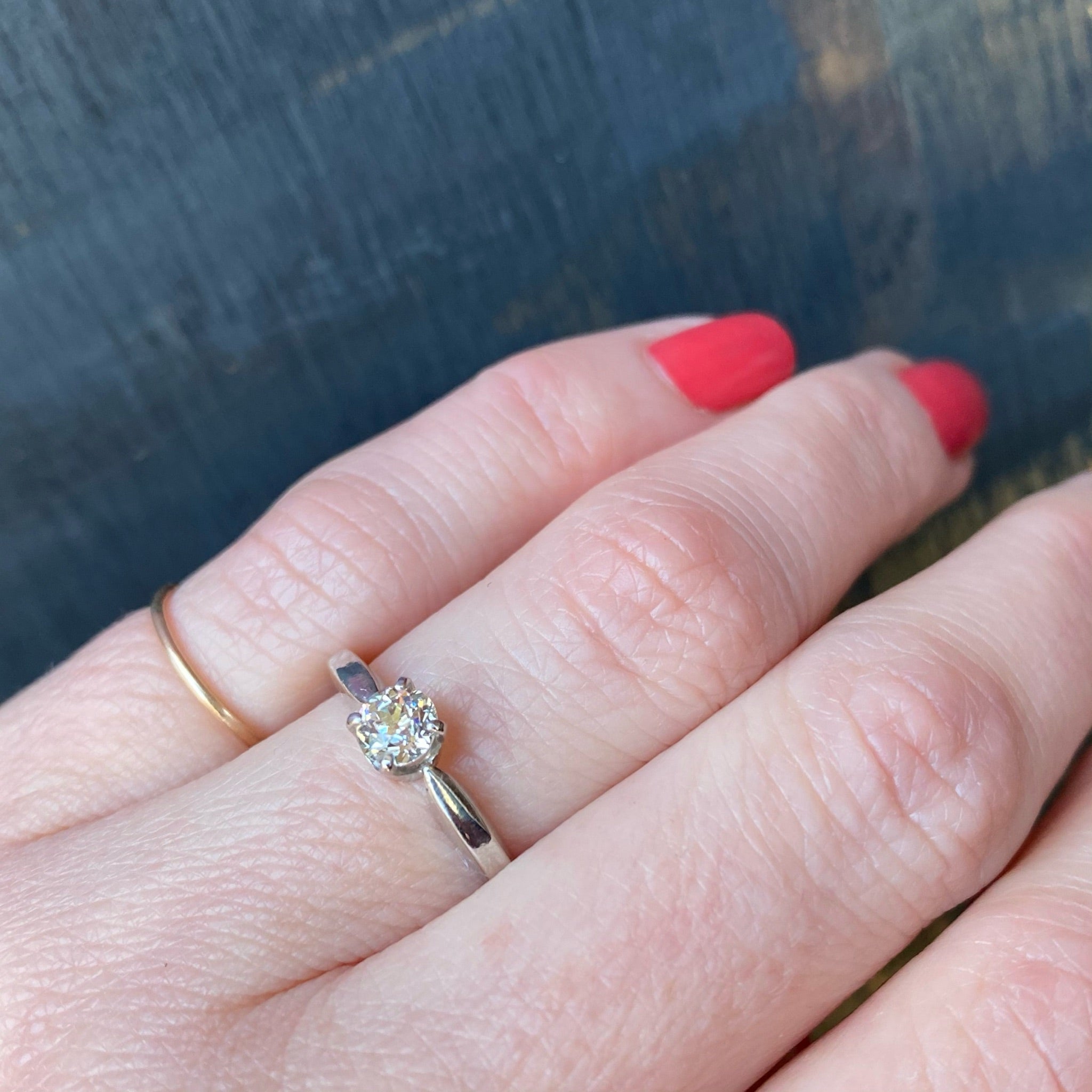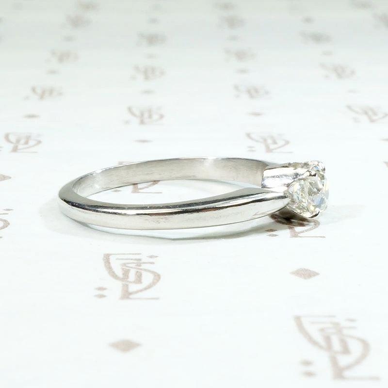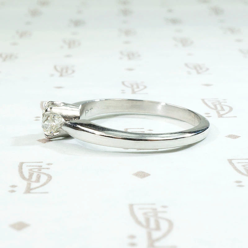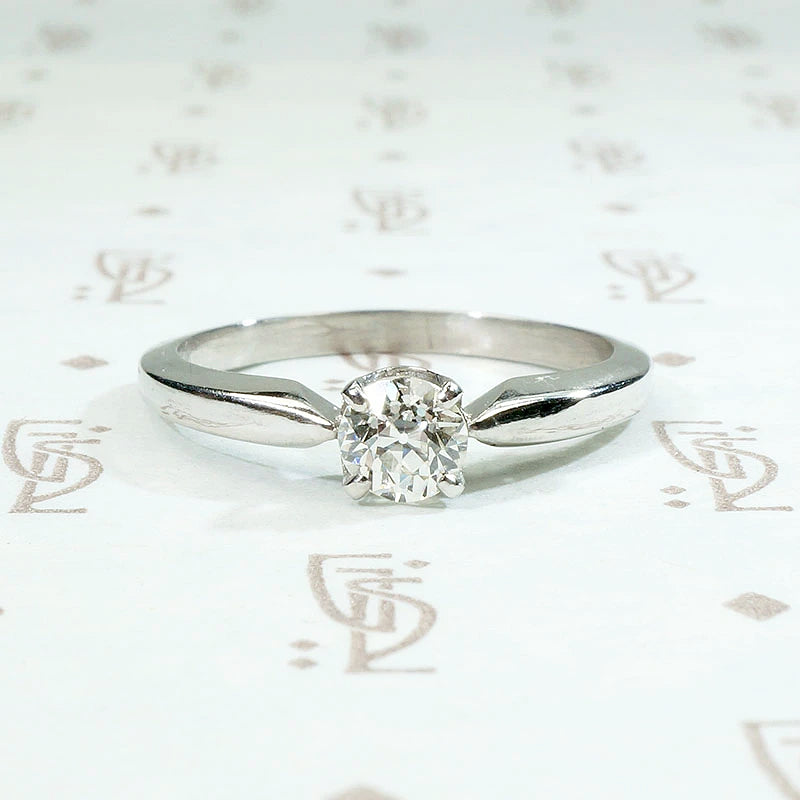 An elegant diamond engagement ring with Mid Century Modern lines. Our jewelers have set a vintage 0.41ct old European cut diamond in a solitaire setting crafted from recycled platinum. The diamond has an H-I color and a bright, sparkling VS clarity, so pretty. The four prong setting has pinched shoulders that taper gracefully back into the band. The clean, sleek lines of this ring give it a timeless appeal. It will pair beautifully with many different styles of wedding band.