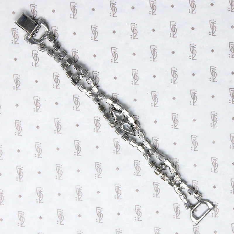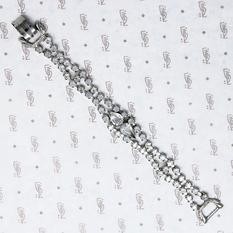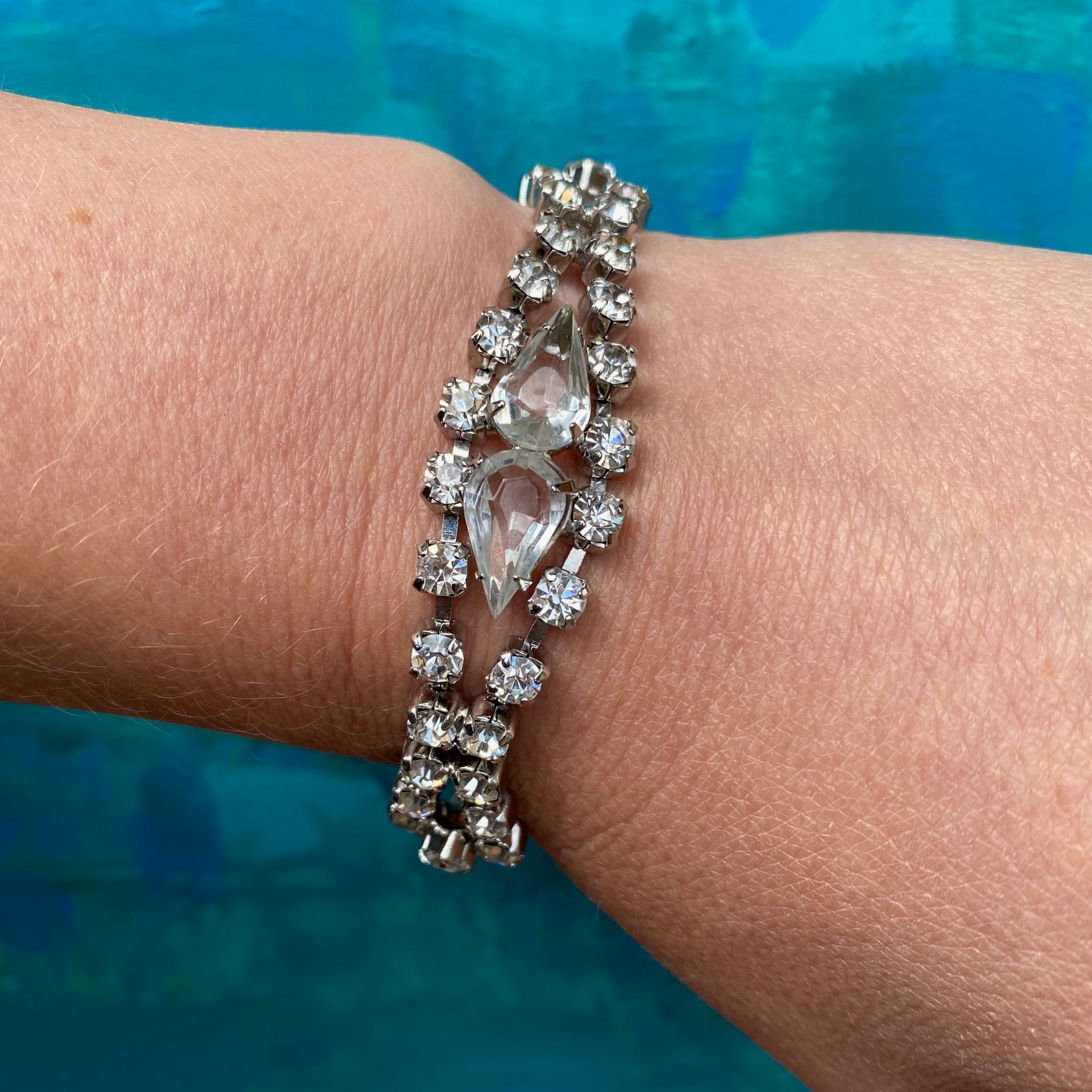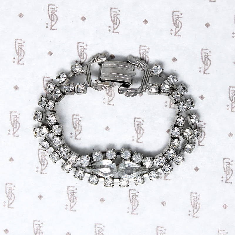 A glamorous bracelet that shines with round and pear shaped white rhinestones. This costume piece brings Mid Century glamour to your wrist. A wonderful bridal bracelet for your vintage inspired wedding. Circa 1950.