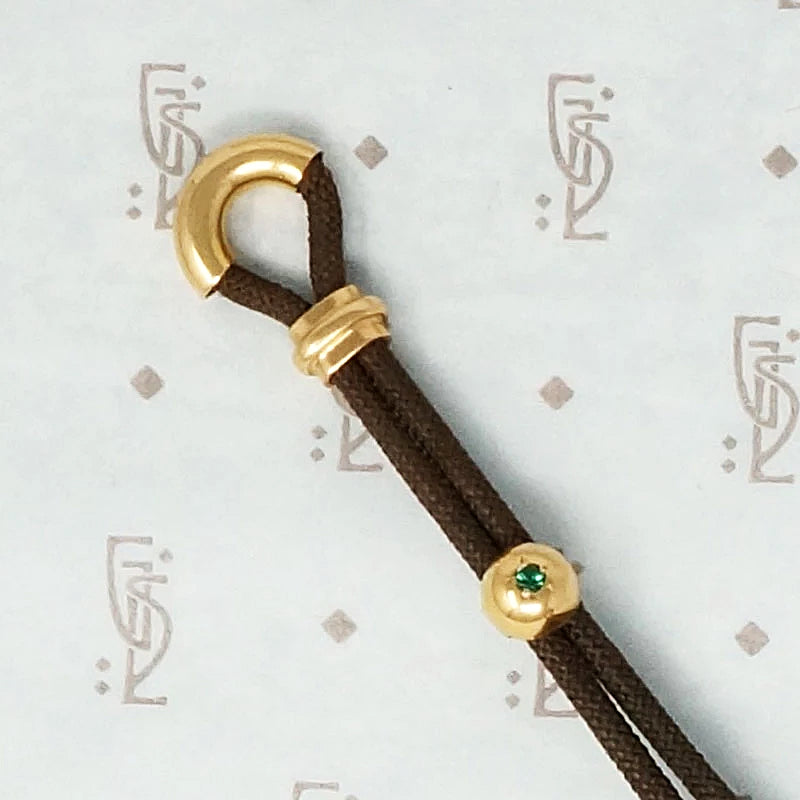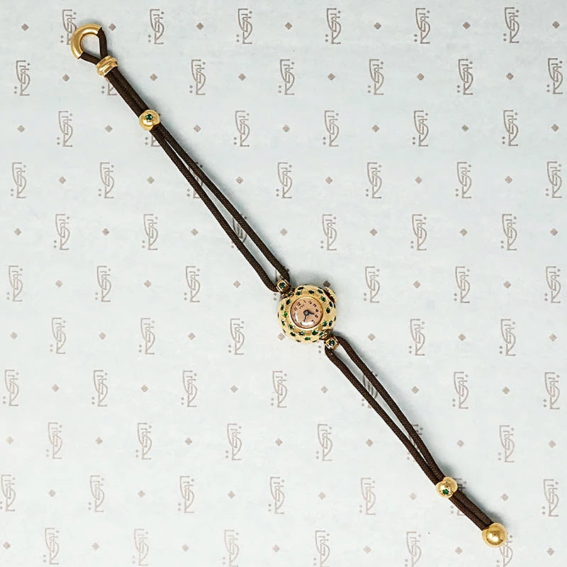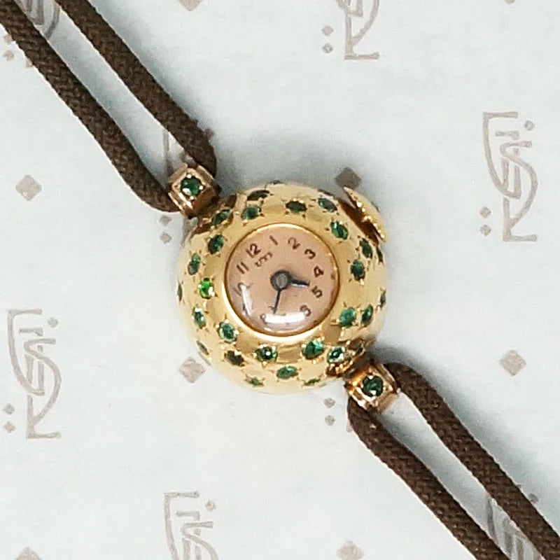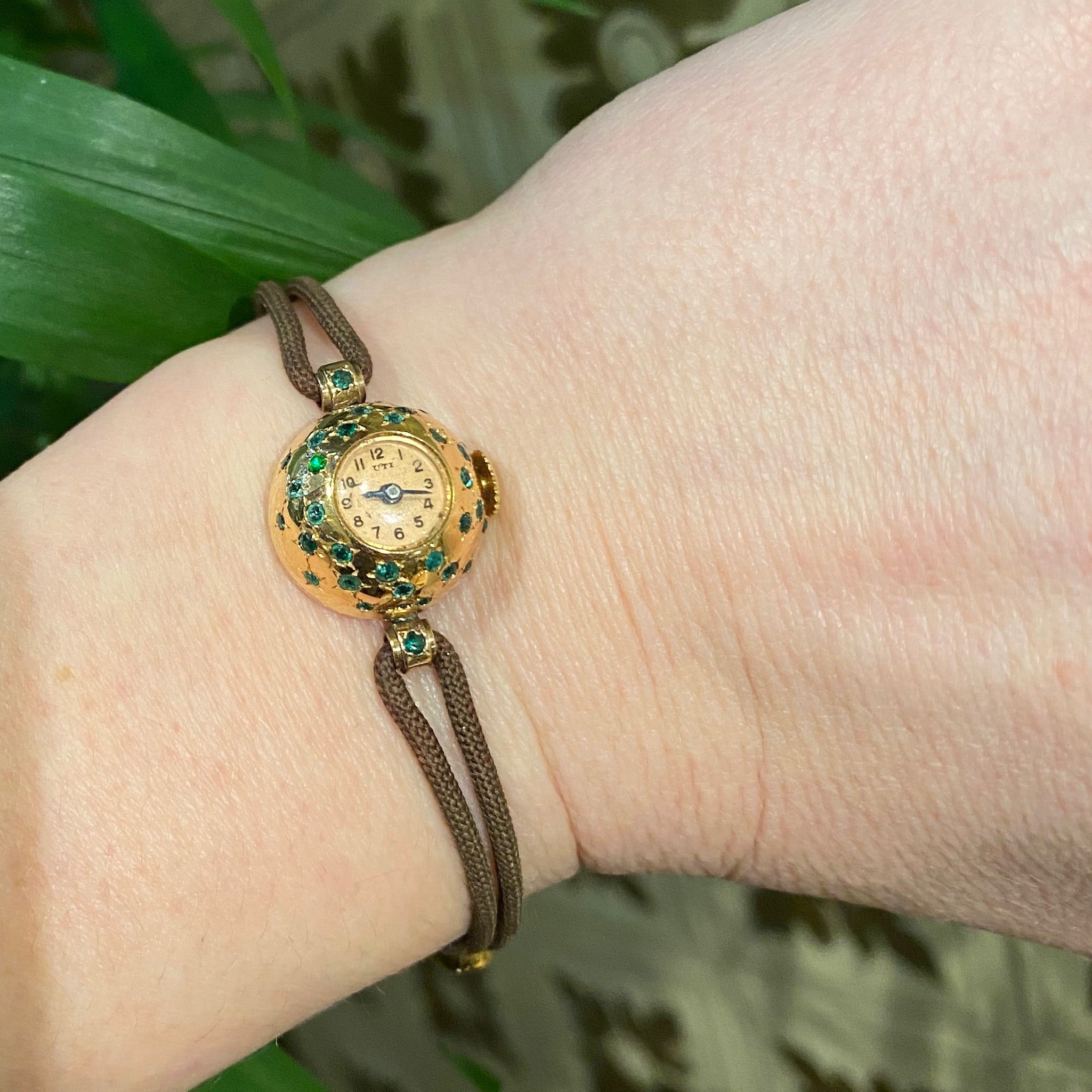 This special retro watch is covered in tiny bright green emeralds, each one set in a star engraving. Even the winding stem and shoulders hold emeralds. The clasp is unique as well, with a sliding gold bar that wraps around the opposing end. There are also adjustable slides on the strap. The entire design of this watch is as innovative as it is fabulous. The watch face is signed UTI. The emeralds are natural, the case is rosy 14k gold and the strap is braided cloth. Circa 1940.