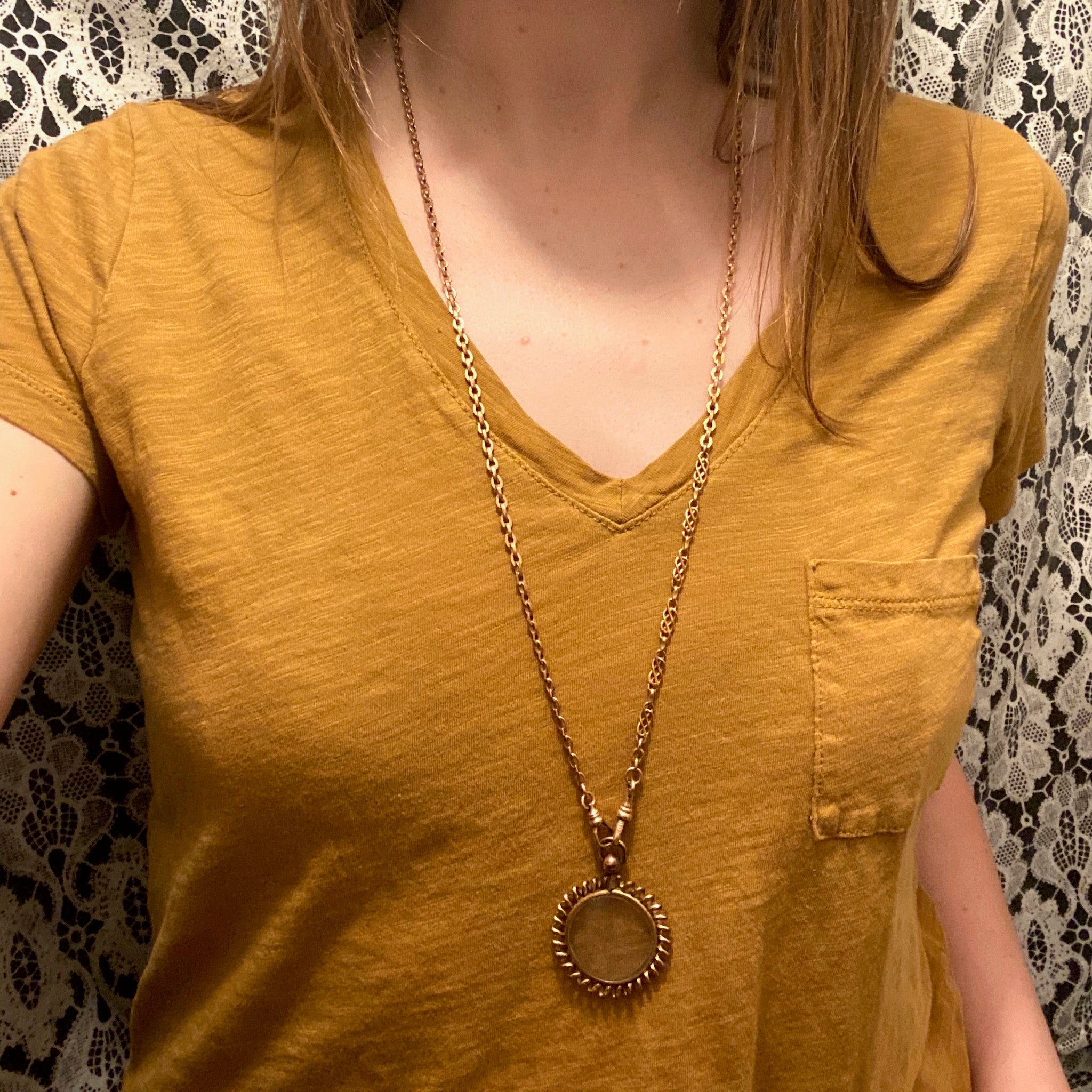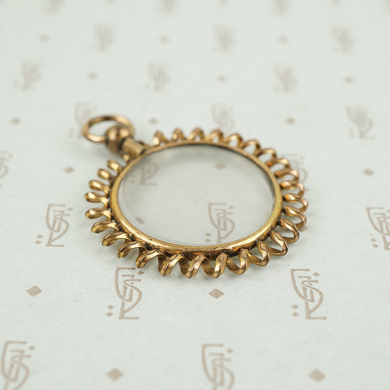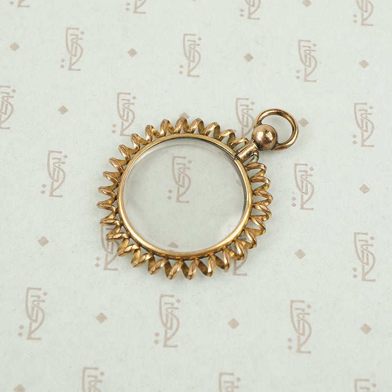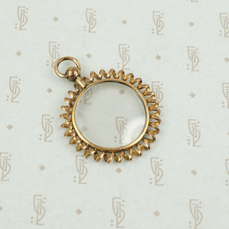 This Victorian locket has a cool, industrial look. Its double-sided crystal is framed in a rosy-gold filled spiral, perfect for displaying photos, pressed flowers, a lock of hair or anything else you can imagine! The frame shows slight wear in keeping with the locket's age. Circa 1880.