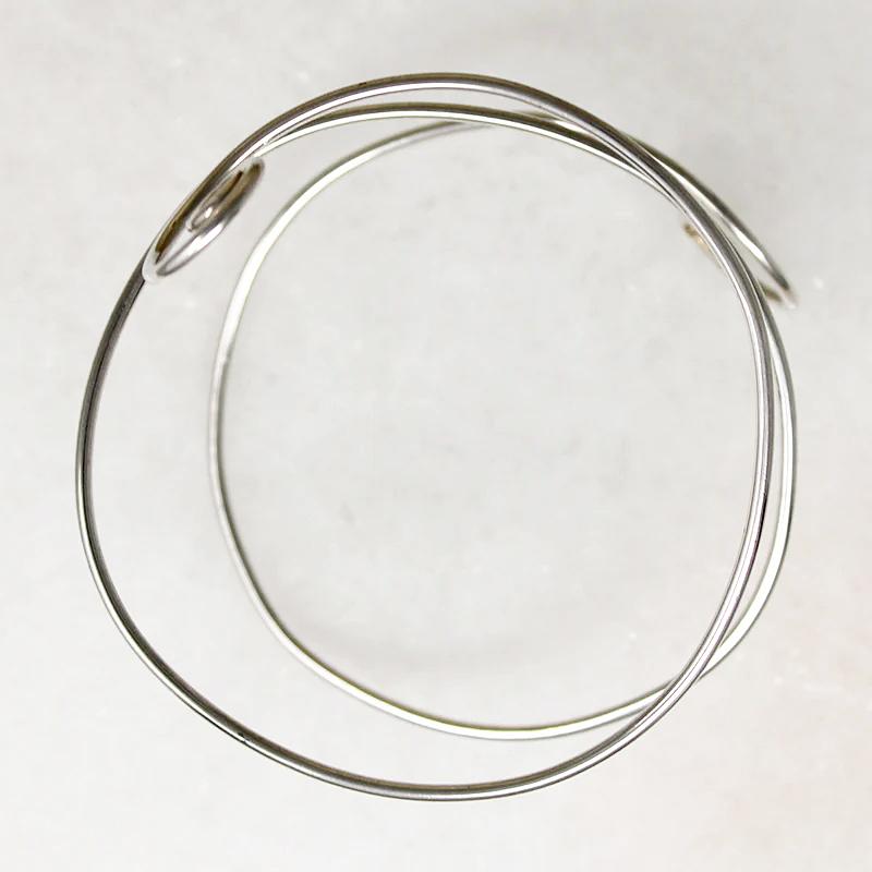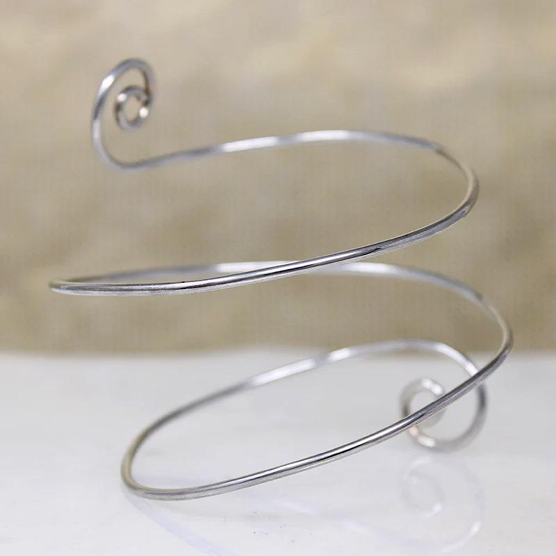 A spiral bracelet of thin sterling silver wire with curling terminals. The wire can be manipulated somewhat; this might make a sultry bicep band. Circa 1980.