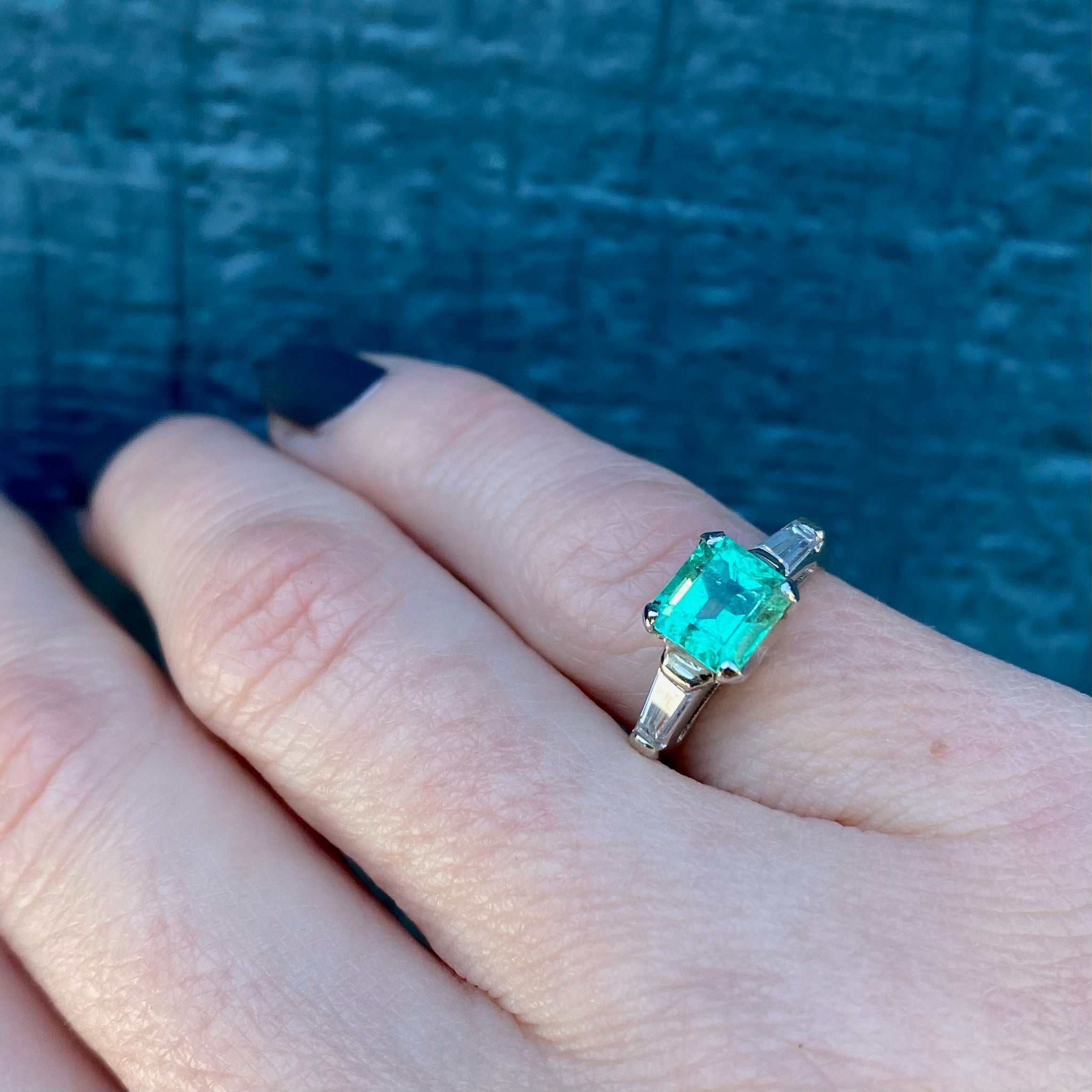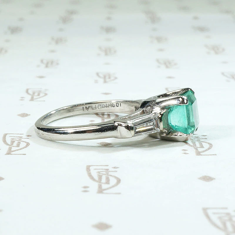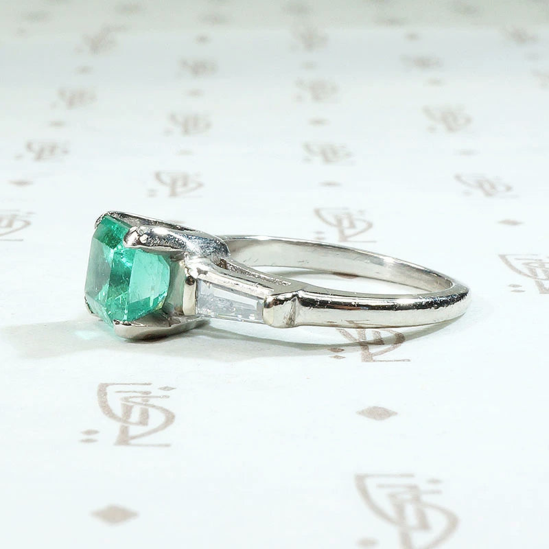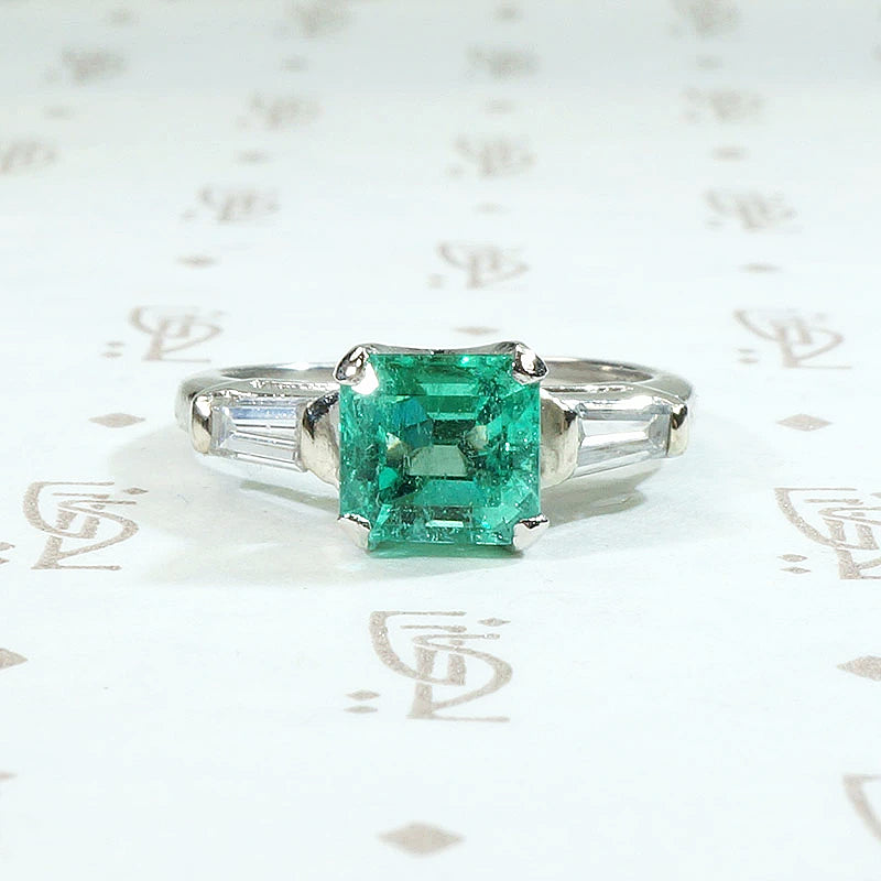 The color of new spring grass. This verdant 1.2ct emerald is flanked by generously sized tapered baguette diamonds with a 0.20tcw. The pure green color of this lovely gem is highlighted perfectly by the platinum setting. Classic, yet the natural emerald makes this timeless engagement ring unique. It is sure to make you smile every time you catch a glimpse of it on your hand. Circa 1950.