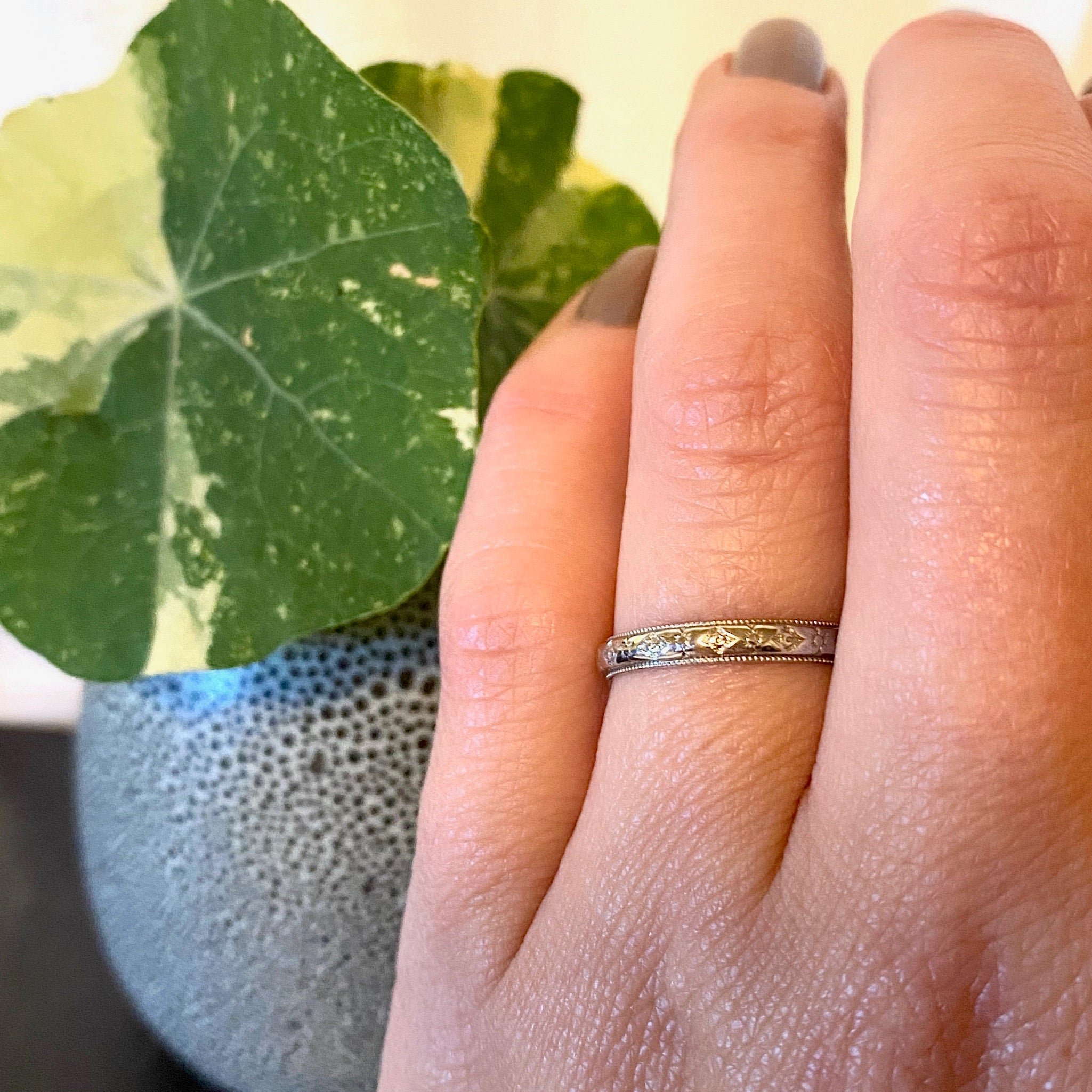 Details.....Currently a size 6.25. The ring may be sized up or down two sizes free of charge. Please contact us if you need this ring sized more than two sizes, it may be possible and will have a small fee. The band measures 2.8mm wide. In Very Good Vintage condition. You should expect all vintage and antique jewels to show some wear, we consider it part of their charm.
