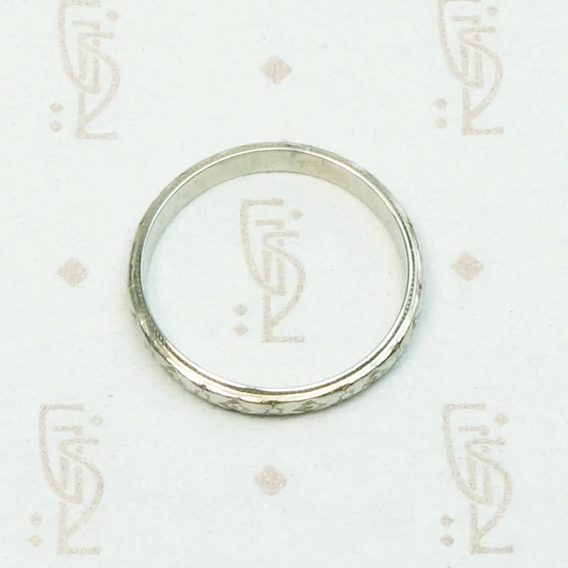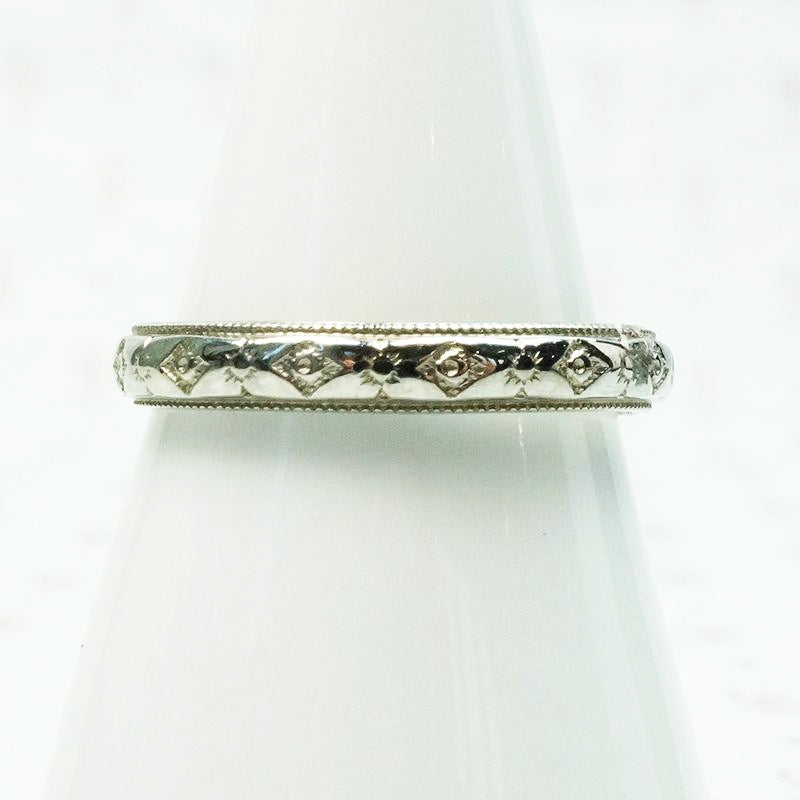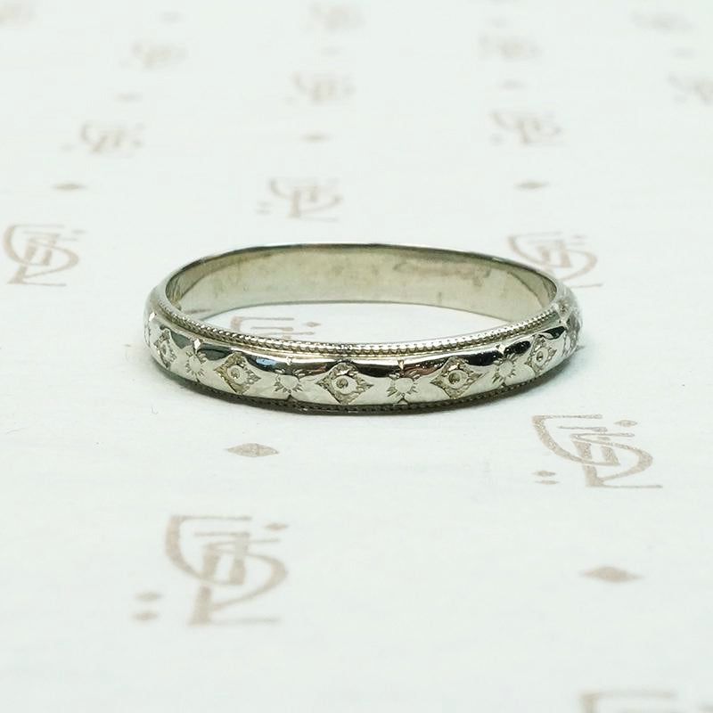 A beautiful Art Deco band with a three dimensionally carved ring of star bursts and crescent moons. The exquisite engraving is edged with milgrain detail. This 18k white gold band was made by Belais, the jewelry manufacturer that invented and patented white gold in the US in 1918. Always well crafted with close attention to detail, Belais bands are a cut above. Circa 1920.