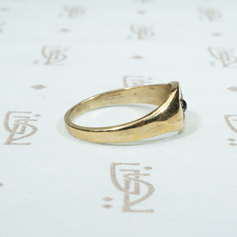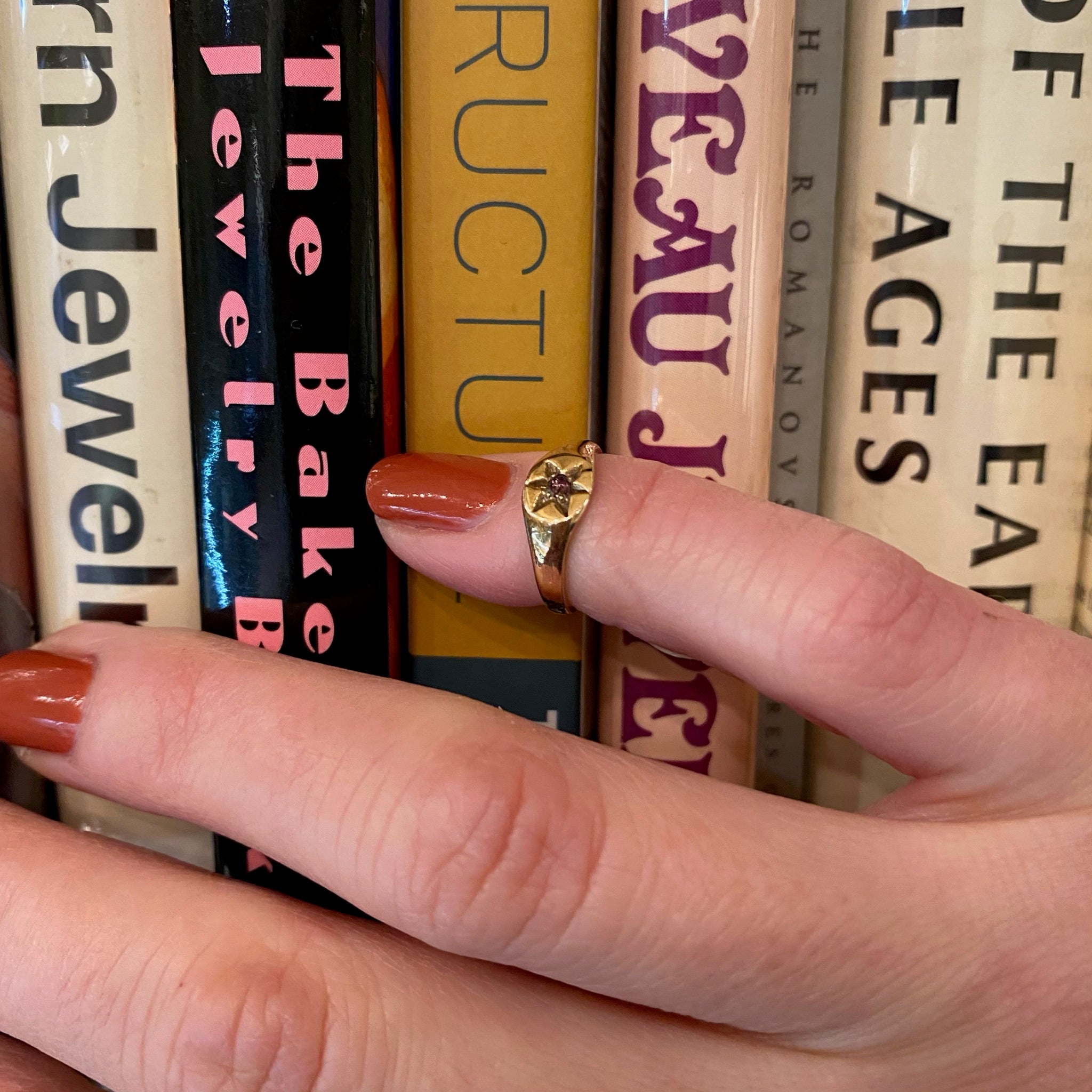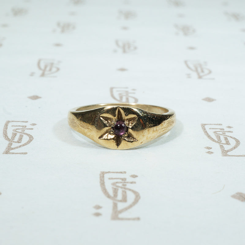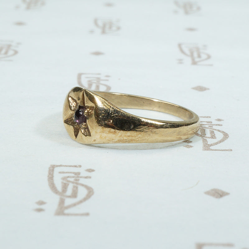 Adorable tiny gold signet style ring set with a little amethyst cabochon in an incised star. Circa 1910, perfect midi ring. There are 2 of these with subtle differences.