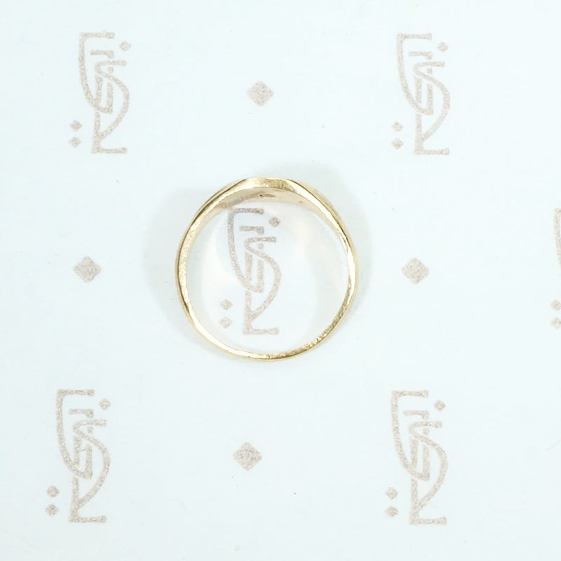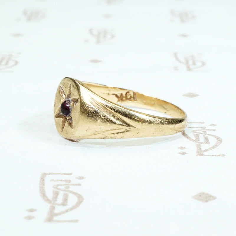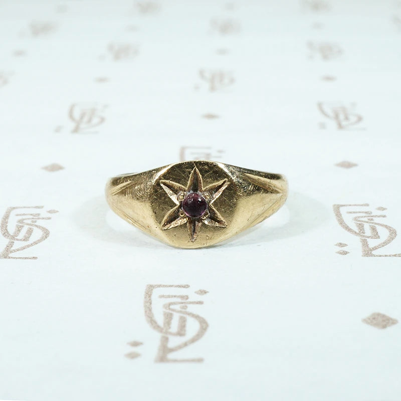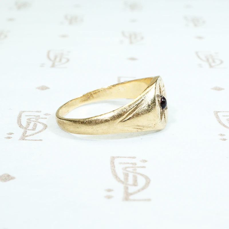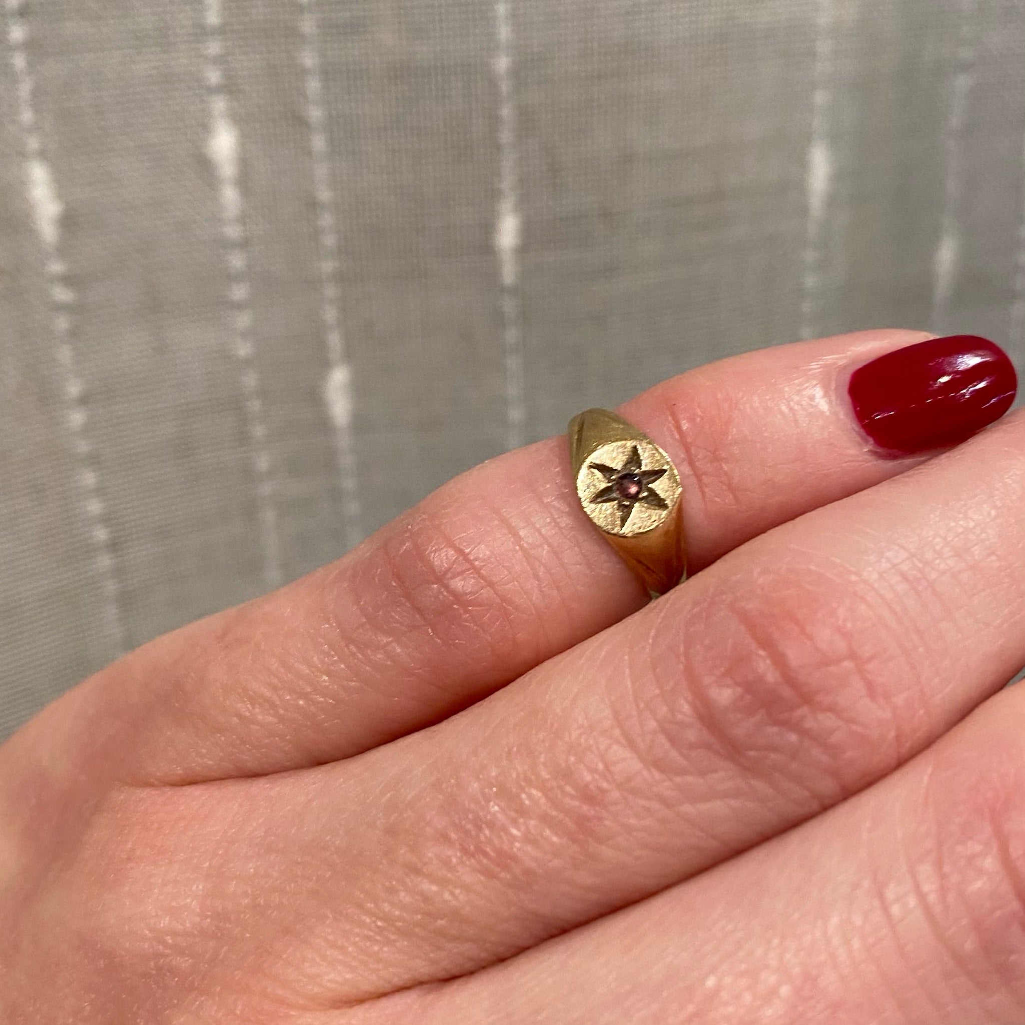 Adorable tiny gold signet style ring set with a little amethyst cabochon in an incised star. Circa 1910, perfect midi ring. There are 2 of these with subtle differences, this one has an added engraved line detail on the sides.
