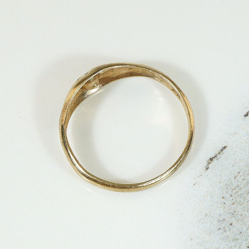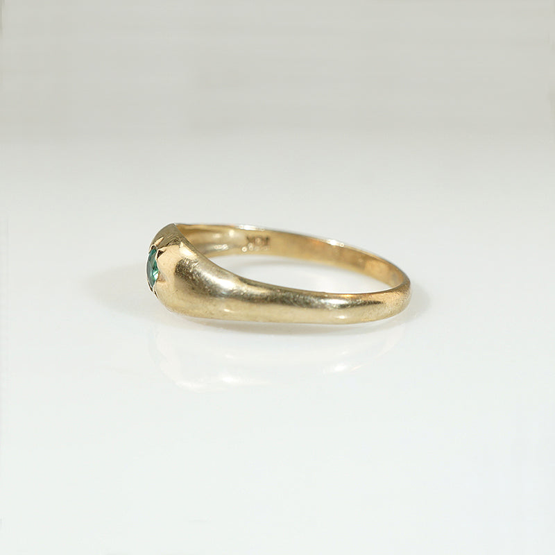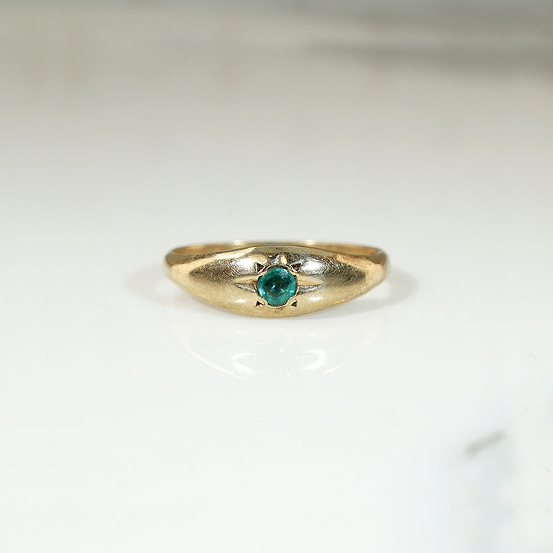 A tiny version of the classic Victorian gypsy band, set with a bright, bitty emerald. The pretty gem is star set in a gently tapered 10k gold band. This wee piece would make a nice midi or pinky ring, and it would be darling worn on a chain like a charm. Circa 1900.