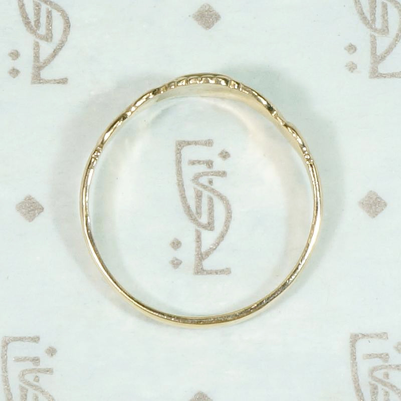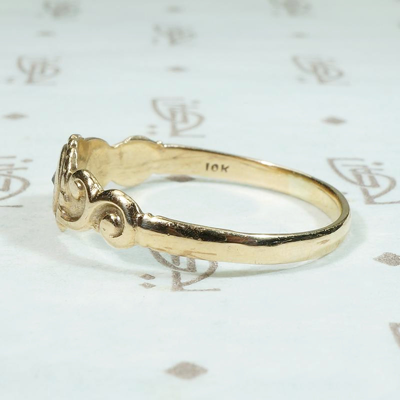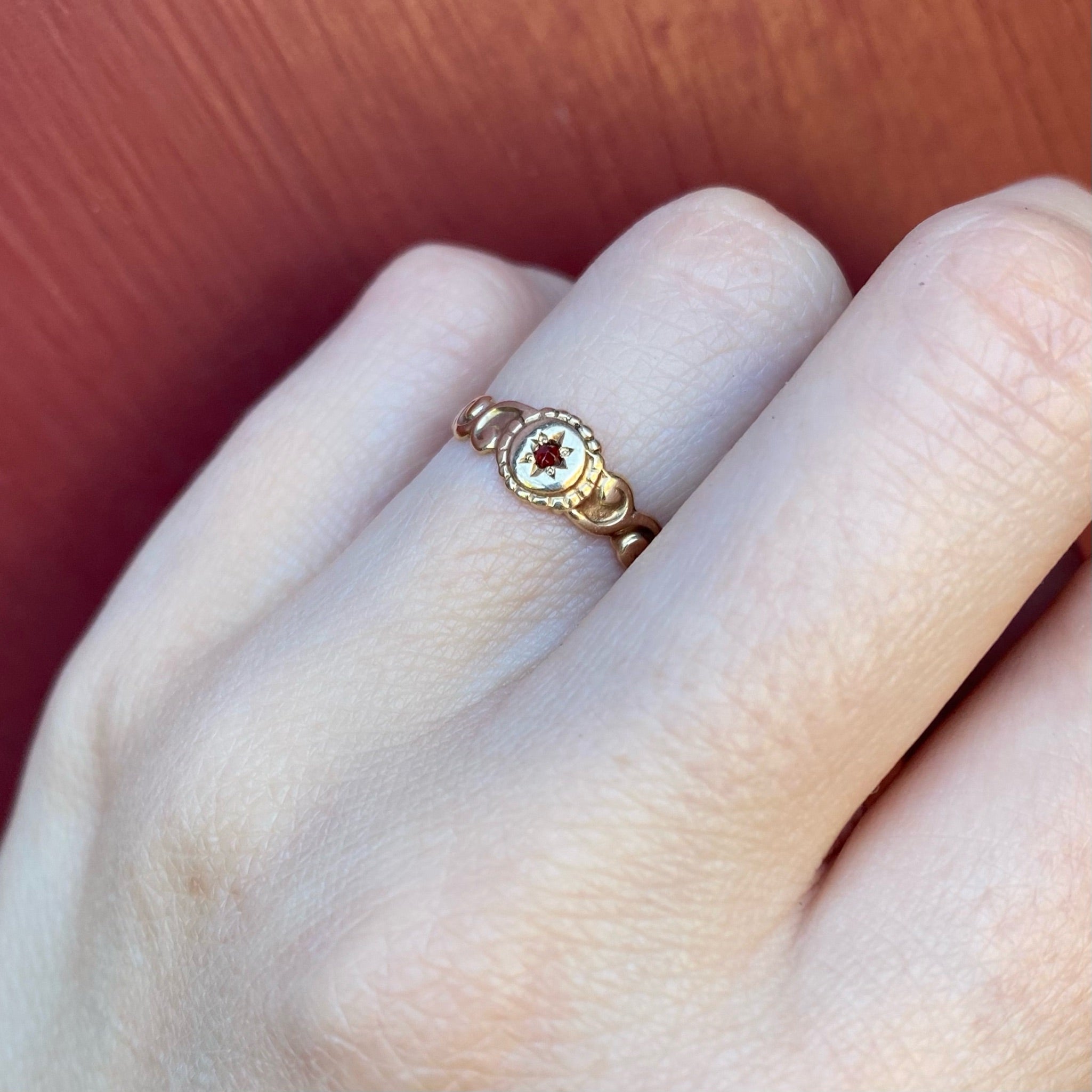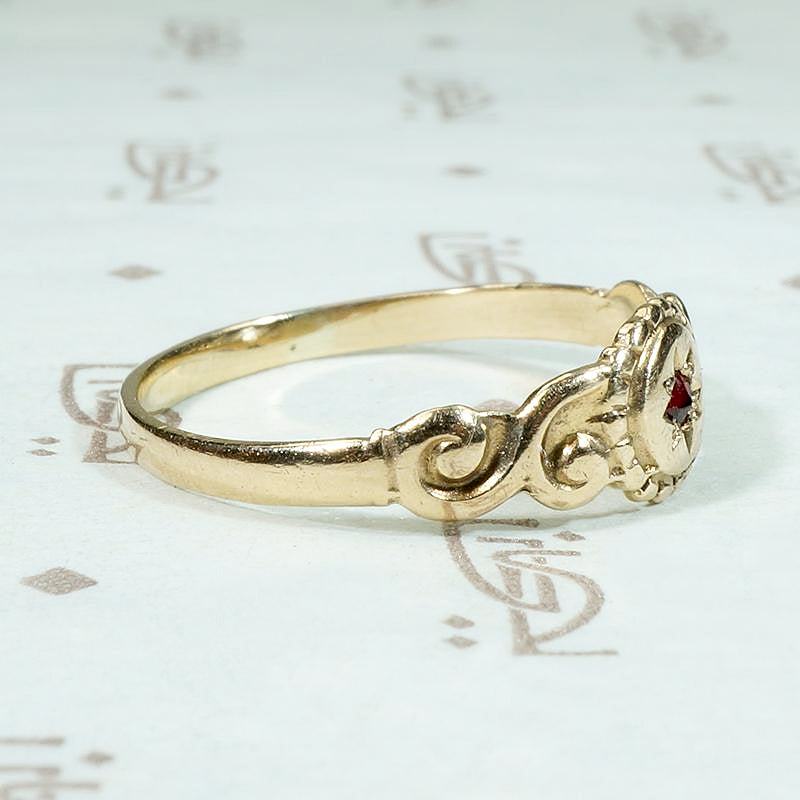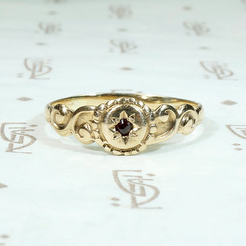 A charming signet-style ring with a garnet in an incised star setting. The 10k yellow gold ring is quite flat, with a round gem-set center with a scalloped border like petals and sculpted scrolling shoulders. Very sweet, this ring would make a darling pinkie ring, too. Circa 1890.