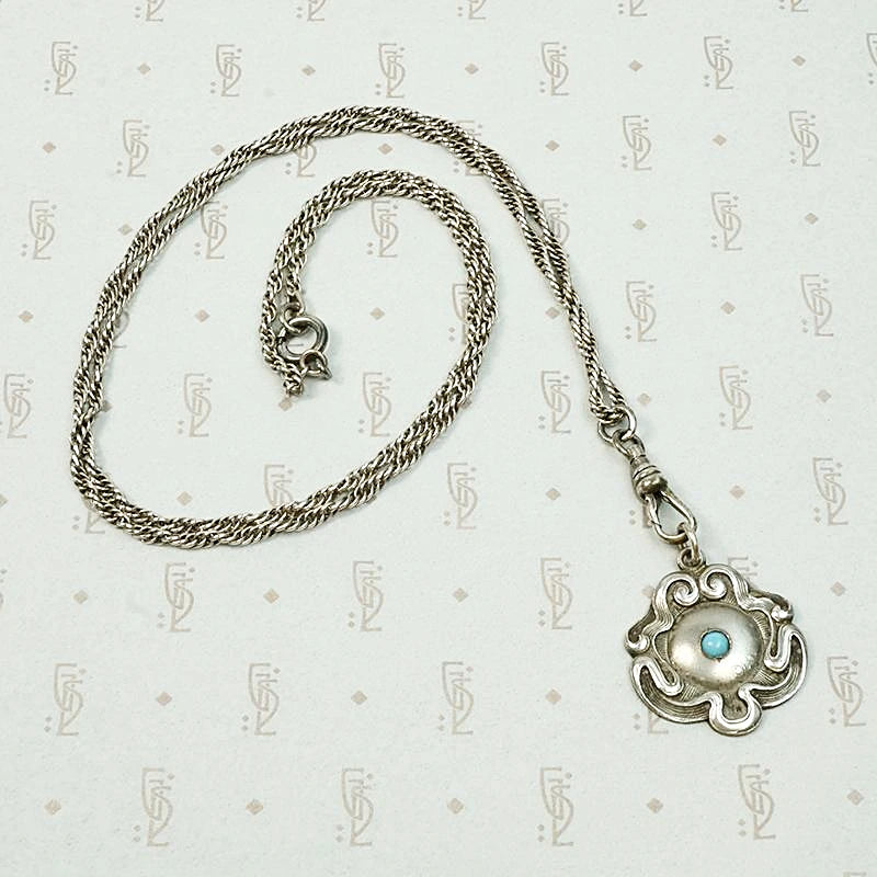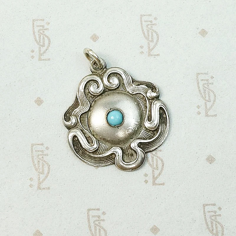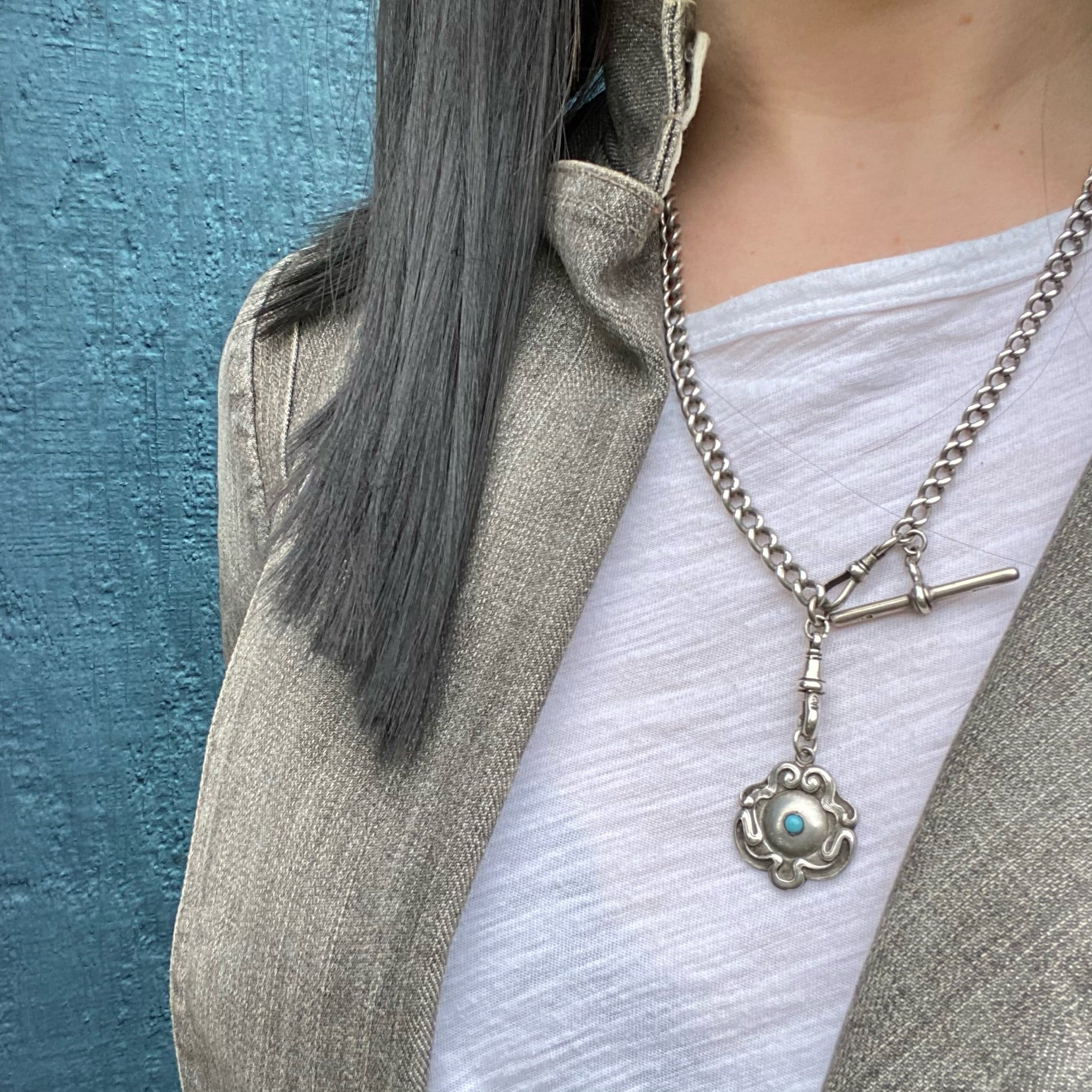 This sterling silver Art Nouveau fob has the sensual whiplash lines that typify the era. A button of turquoise colored glass studs the center of the pendant. A sterling jump ring has been added to make it easy to wear any way you like. Circa 1890. The fob is pictured here on one of our Ancient Influences married chains, a perfect compliment to the piece and sold separately.