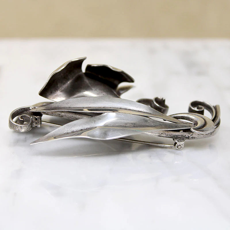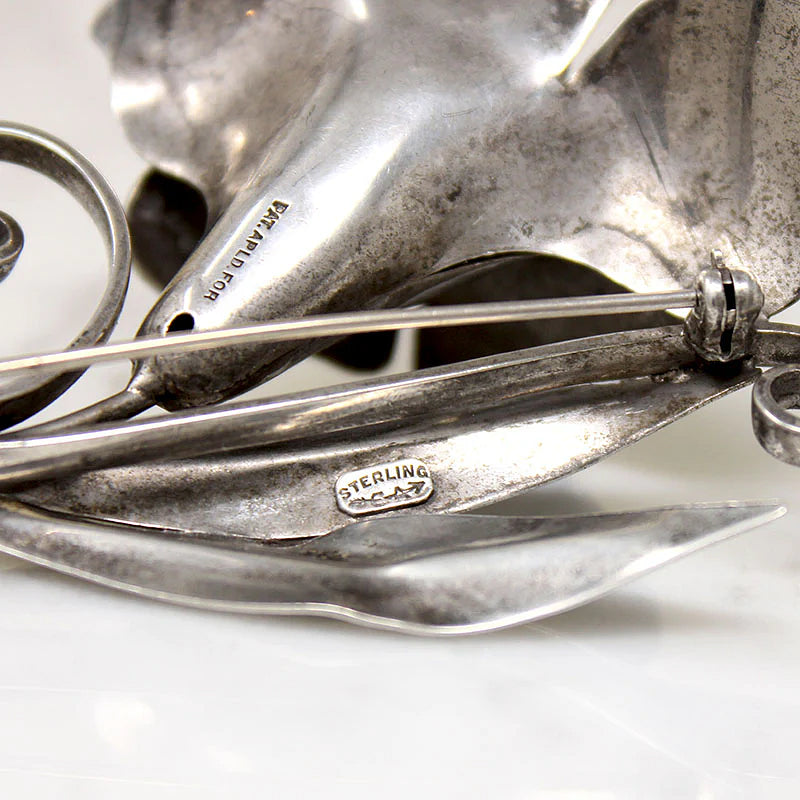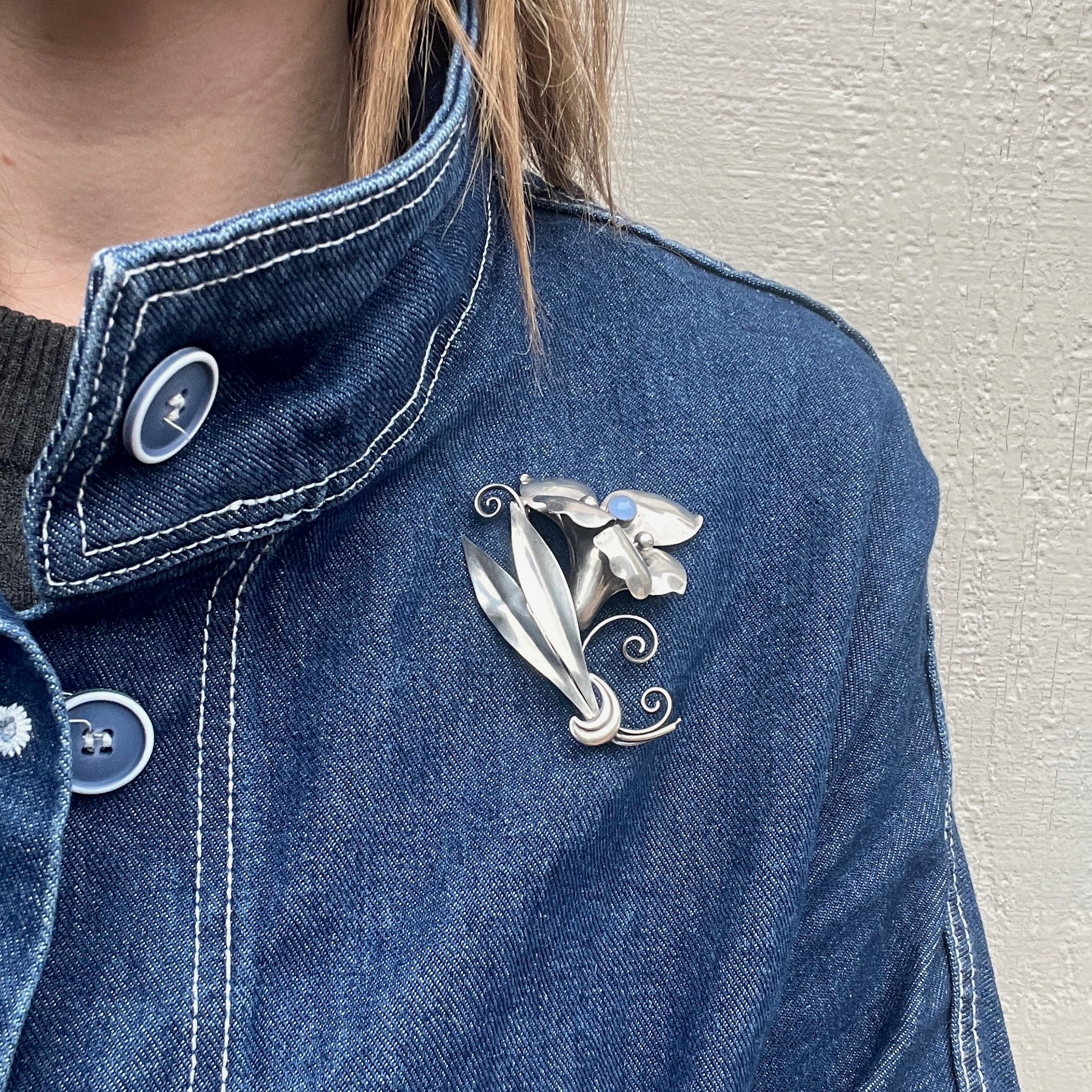 A lush nosegay brooch of a three-dimensional lily rendered in glossy sterling silver. The petals are curled tenderly in a naturalistic fashion. A cabochon of something that resembles chalcedony punctuates the flower's pistils. Spiky leaves and curling tendrils complete this gorgeous sculpture. The brooch fastens with a rollover clasp. Marked on the back, "Pat.apld.for," "Sterling," and with the Cal Art maker's mark. Big. Bold. This heavy brooch is perfect for wear on coats, jackets, and other heavy fabrics. Circa 1940.