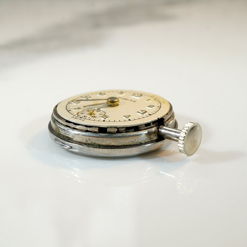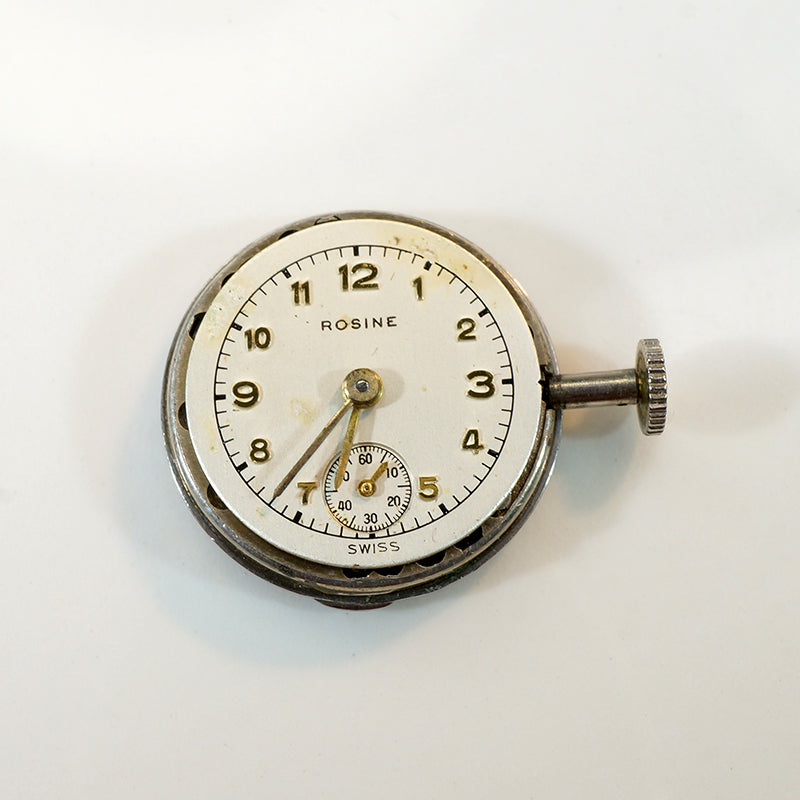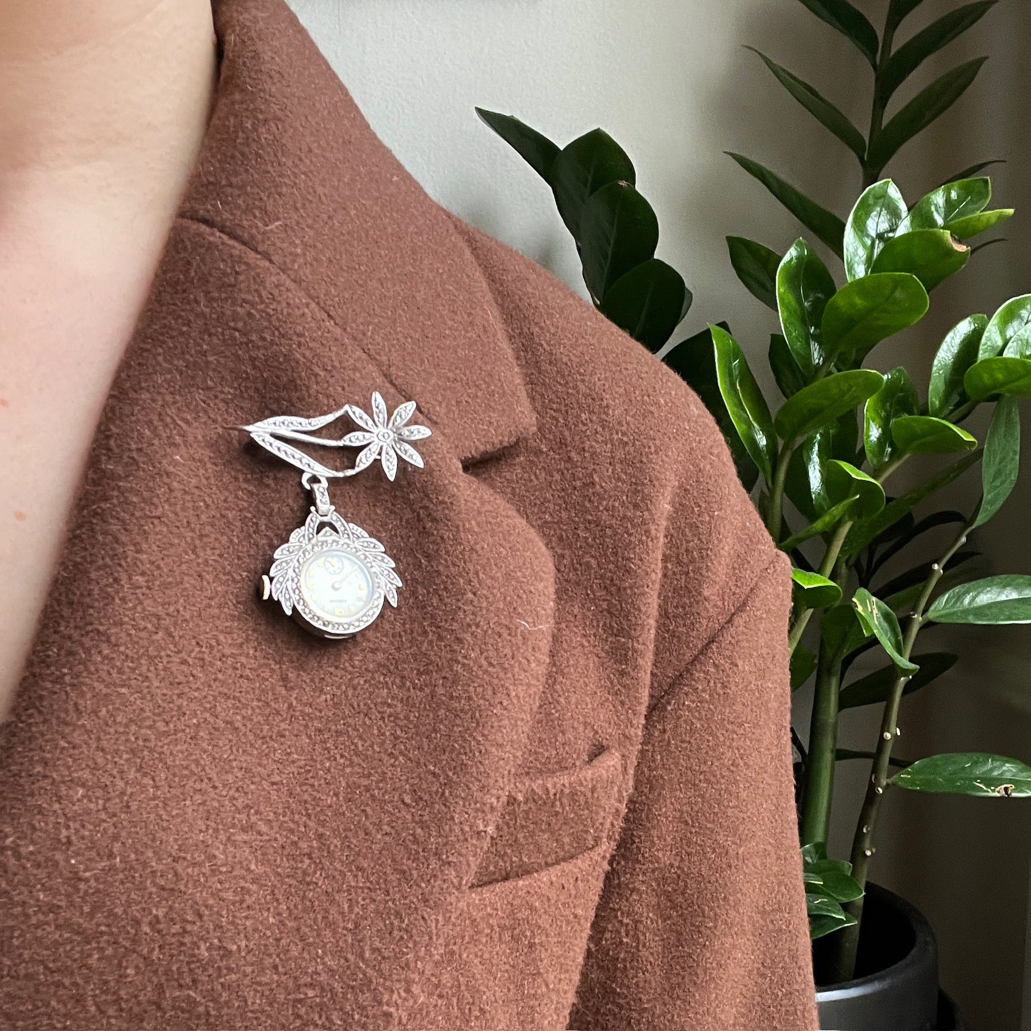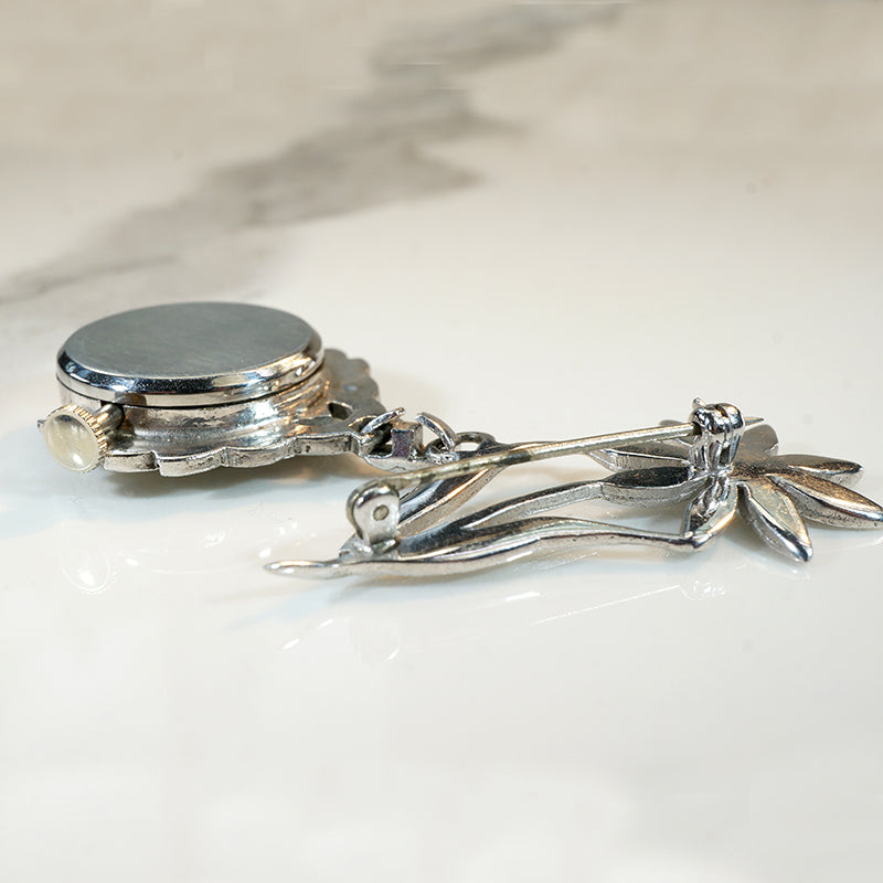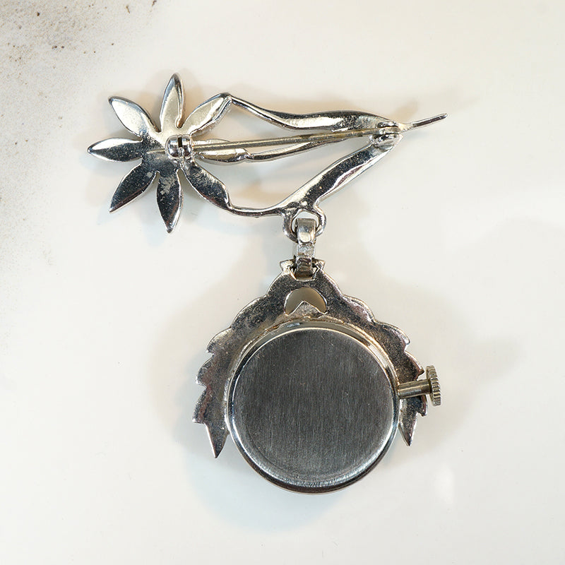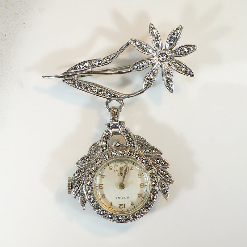 A charming watch brooch, practical and pretty, with a Rosine watch hanging from a marcasite-studded flower pin. The sterling silver daisy brooch has delicate petals and graceful leaves. The watch is framed in sterling silver modeled and engraved with a foliate motif. Glittering marcasites spangle the silver. The watch's face has gold-painted hands and numerals, as well as a subdial. Its mechanism is in good running condition. Circa 1940.