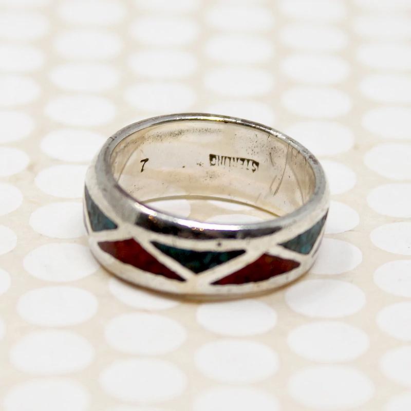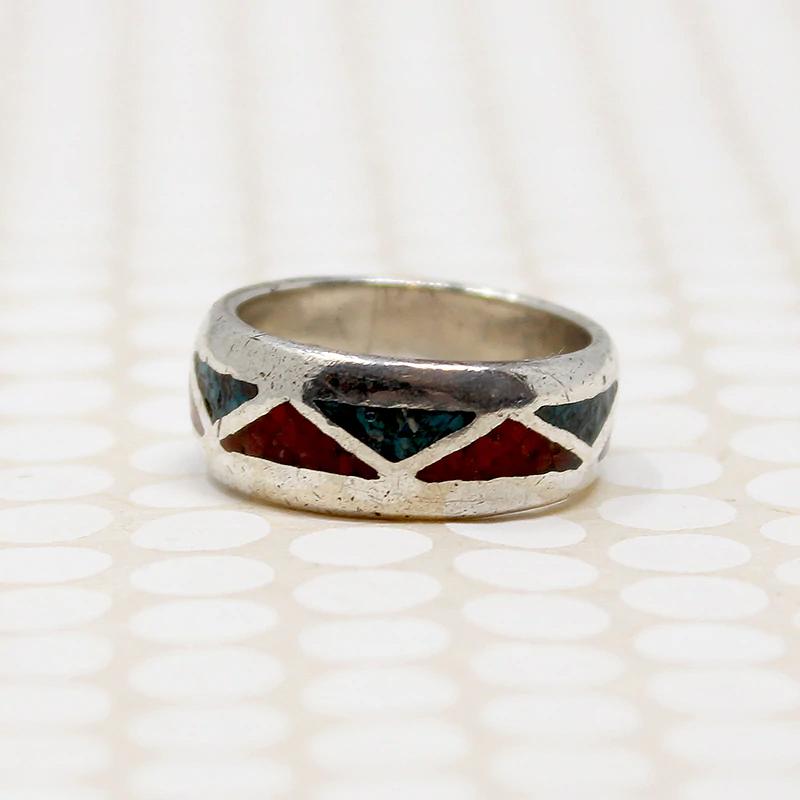 This wide sterling silver band is inlaid with crushed turquoise and coral in a pattern of interlocking triangles. A classic style, everyone had one of these in the '70s. Circa 1970.