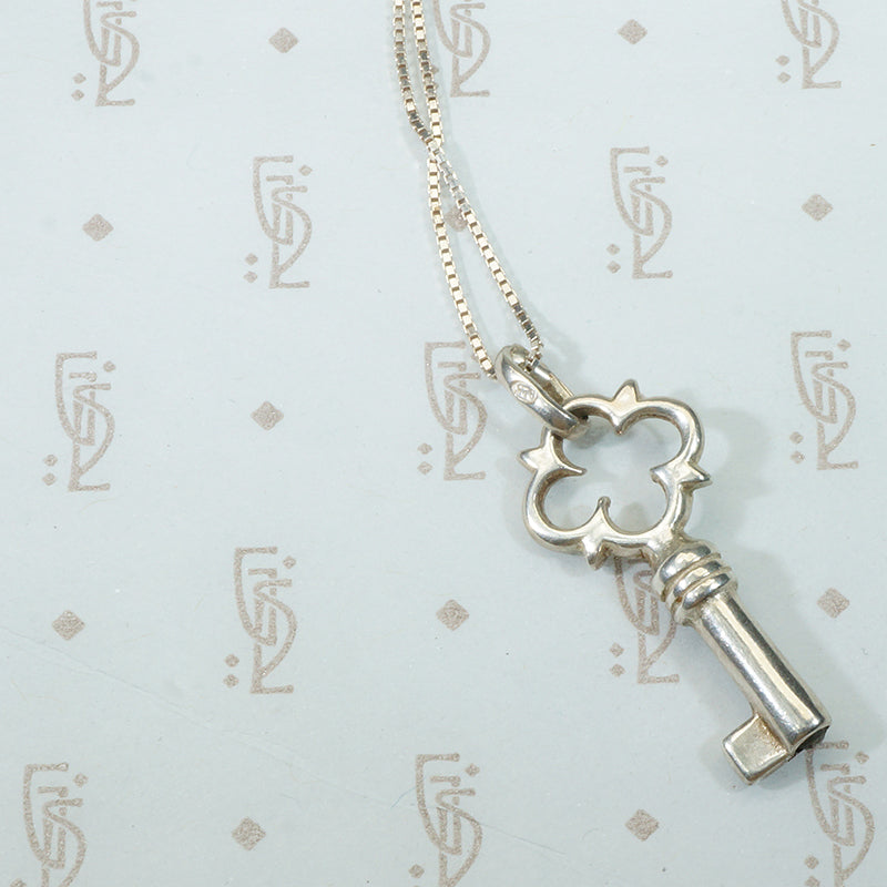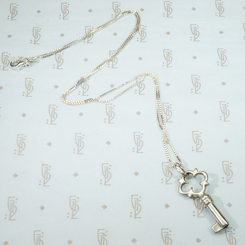 A pretty decorative sterling silver key is suspended from a geometric sided snake chain. Circa 1970.