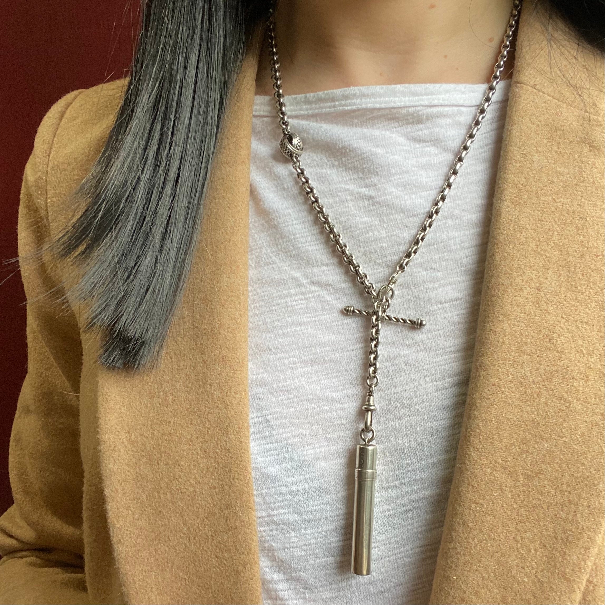 This necklace is composed of two segments of complimentary sterling silver chain, elevated by brilliant textural details. Curved round double link chain is paired with elongated oval link chain, then clasped at the front with a recycled sterling spring ring. A sterling hook and fabulous twisted t-bar hang from the bottommost ring. A filigreed knotted-ball link completes the piece. The twisted t-bar and knot link echo textures in a very thoughtful way. So versatile, hang all your favorite bits and bobs from the hook or the spring ring. Raise your Chain Game.