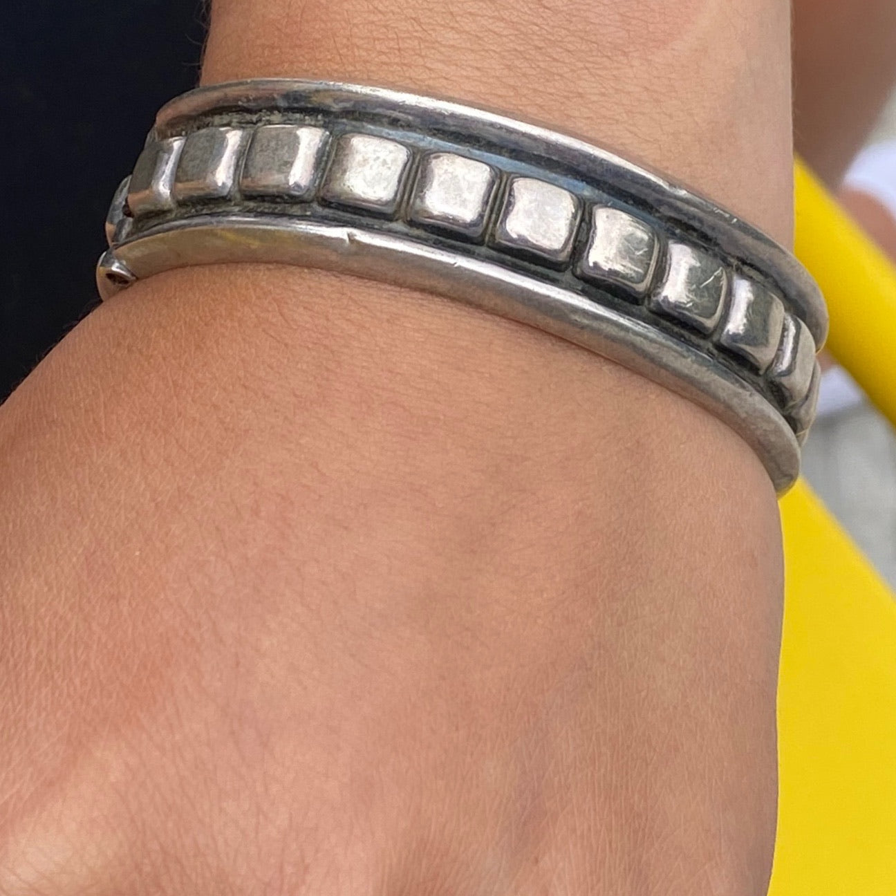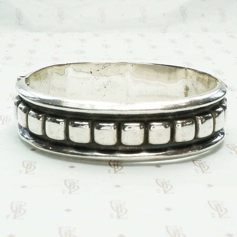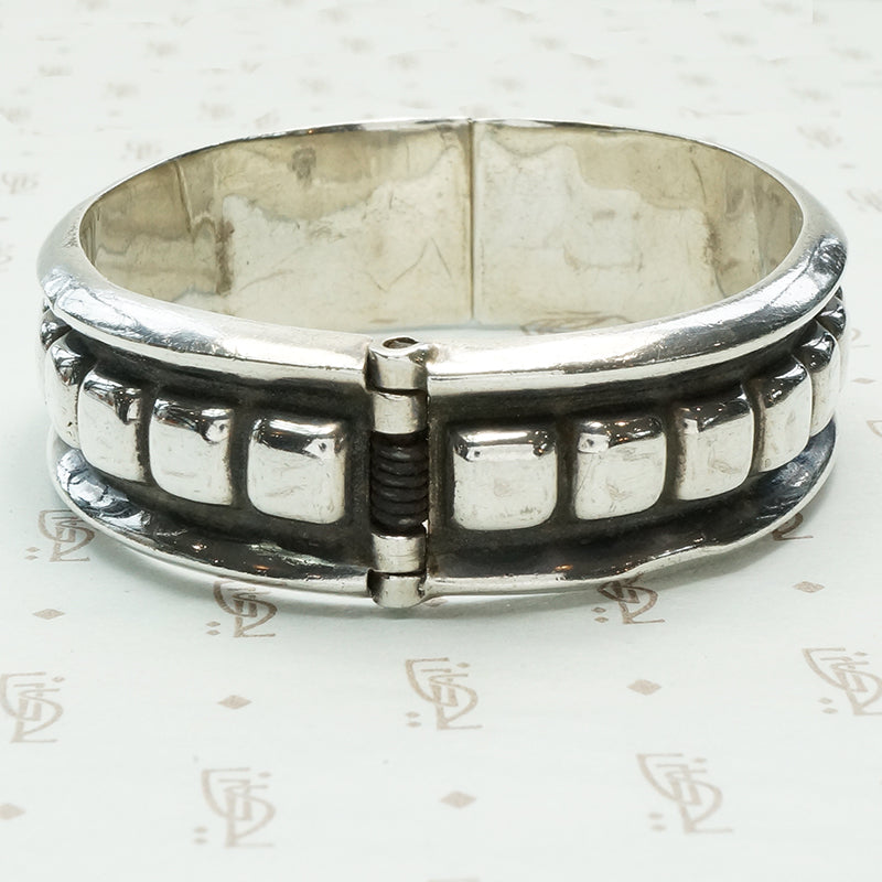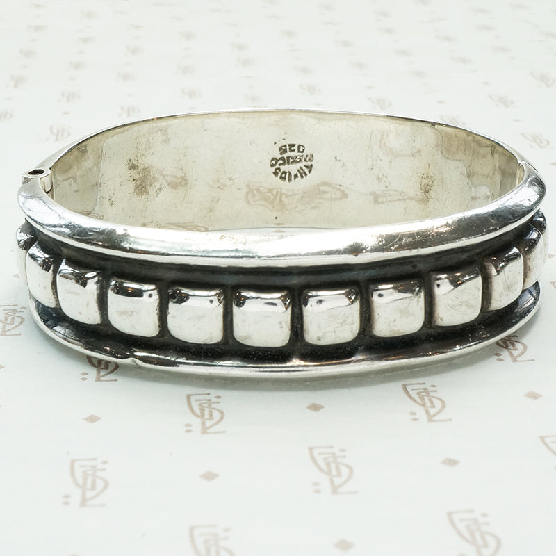 This smart classically Taxco Mexico bracelet style features a strong hinge to allow for easy on and off while staying put nicely. A timeless design of raised cushioned squares on a blackened background make this a goes with everything bracelet. Sterling, circa 1970.