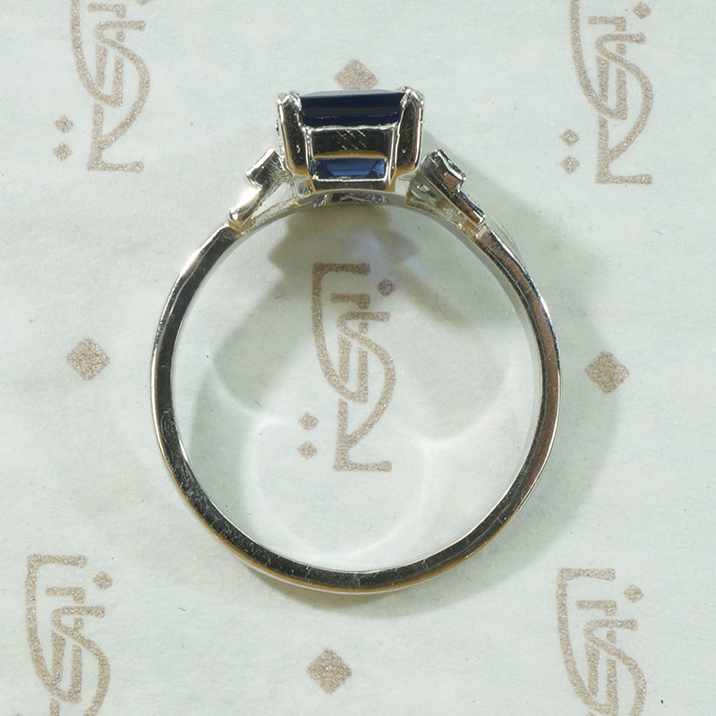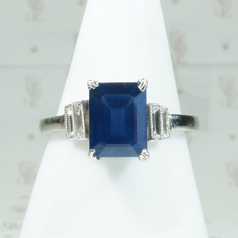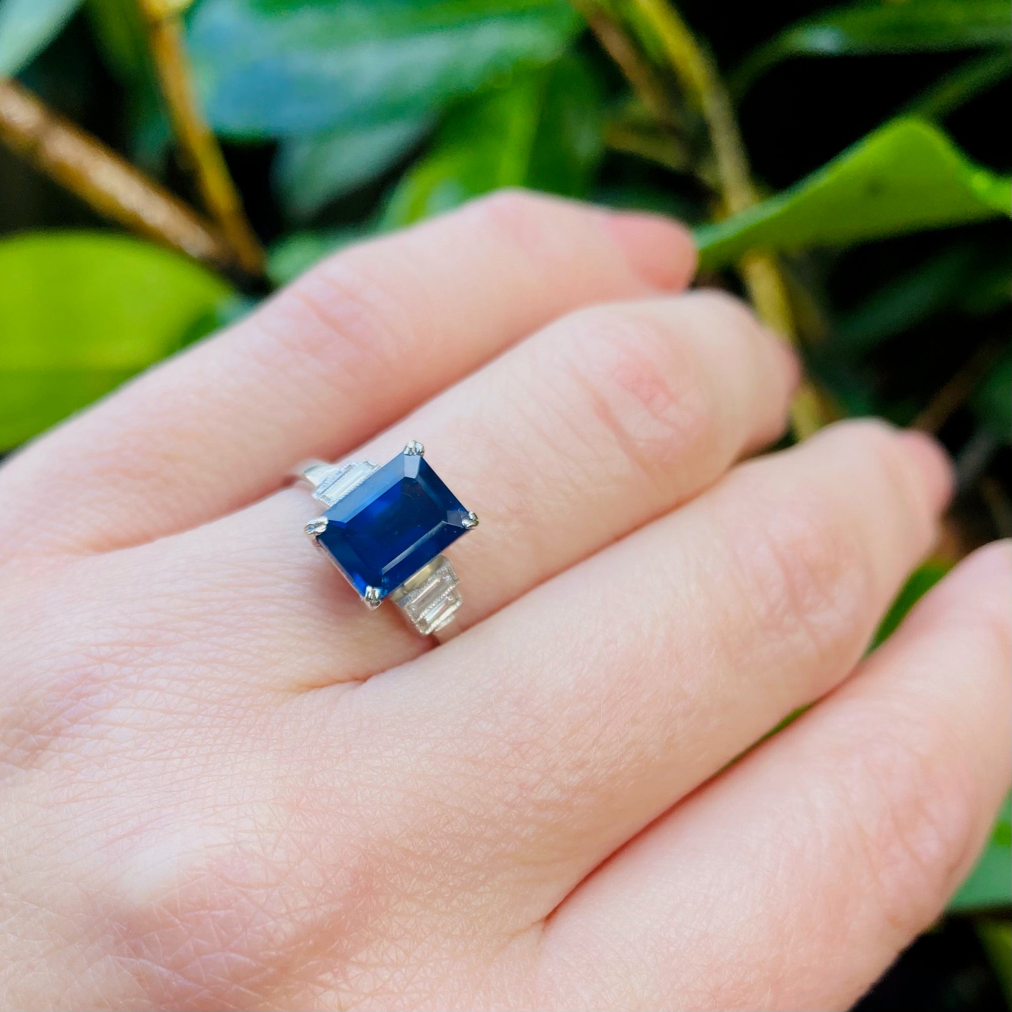 Gemstone Details.....The Natural Sapphire is an Emerald Cut, Step Faceted, 2.65 carats, LI- Medium Dark Violet-Blue. There are 4 Straight Baguette Diamonds VVS-VS F/G with a total weight of .20 carats.