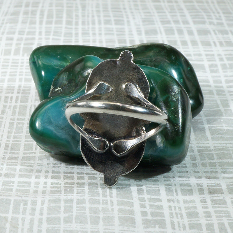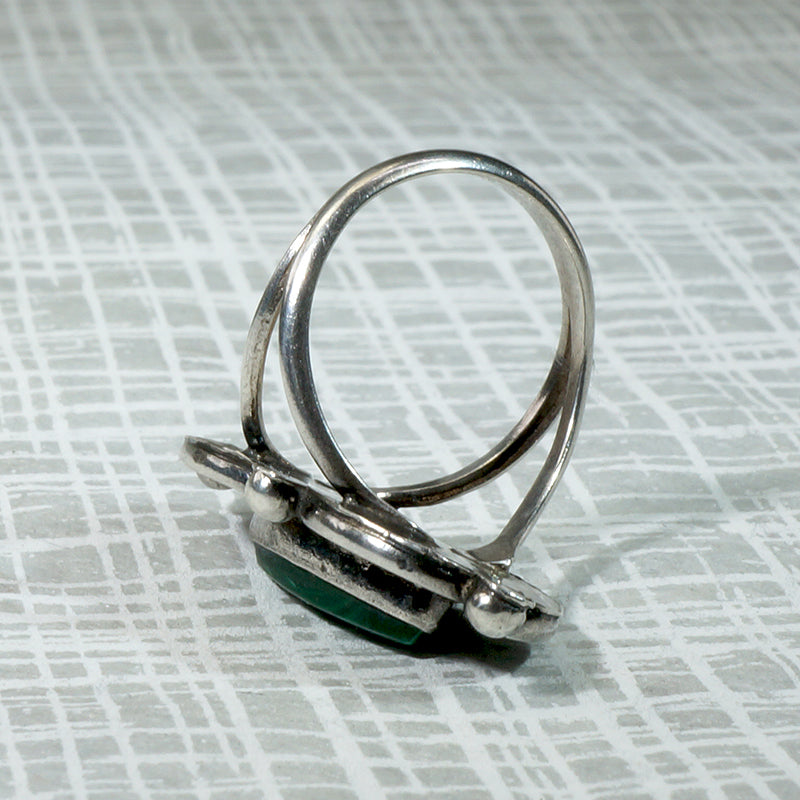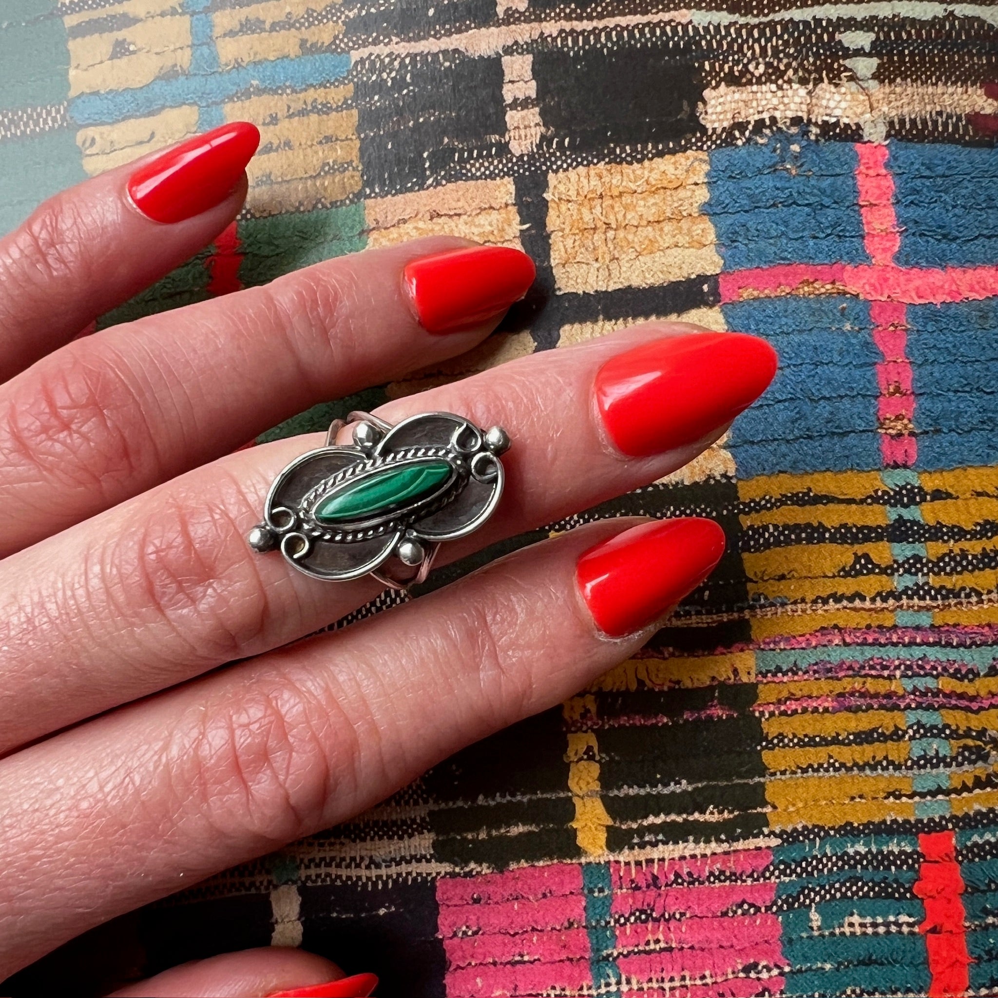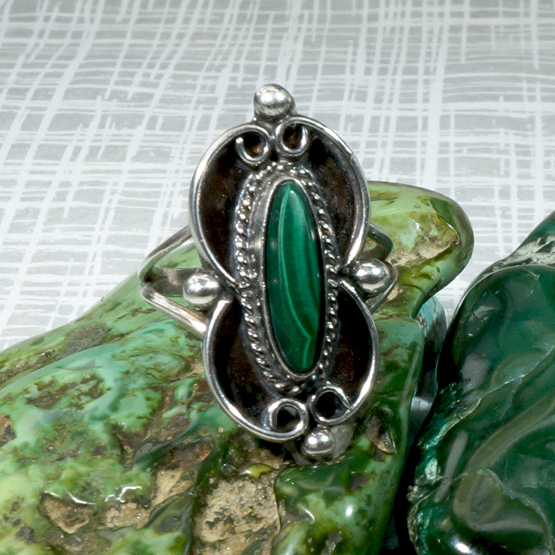 Malachite: a stunning gemstone striated with countless vibrant shades of green, stars in this ring of beautifully worked sterling silver. The oval stone is bezel set at the center of a long plaque of scalloped silver. The malachite is framed in twisted silver wire. Scallops and curlicues of silver overlay edge the plaque. Overlay is a technique in which a carved layer of polished silver is applied to a layer of oxidized silver, creating a shadow box effect. Silver beads are placed at the plaque's cardinal points. The decorative top sits above split shoulders that taper into a half-round band. This is a striking ring with a vivacious character. Circa 1970.