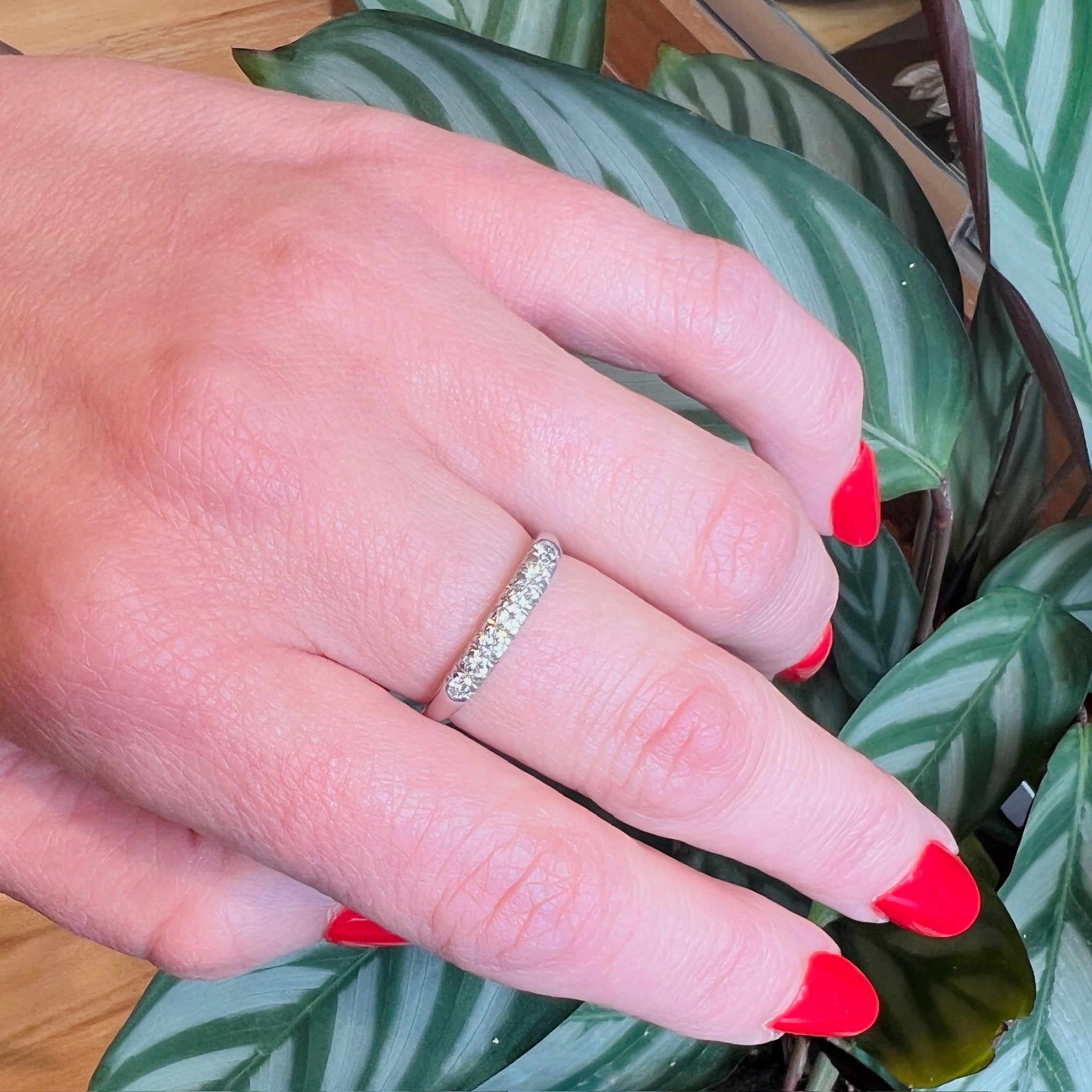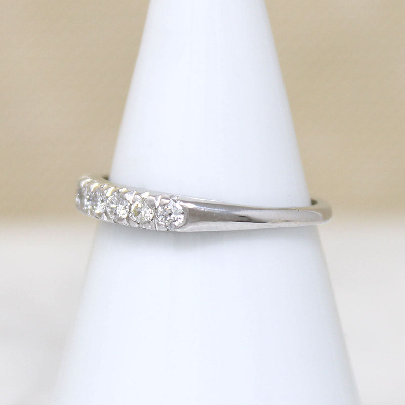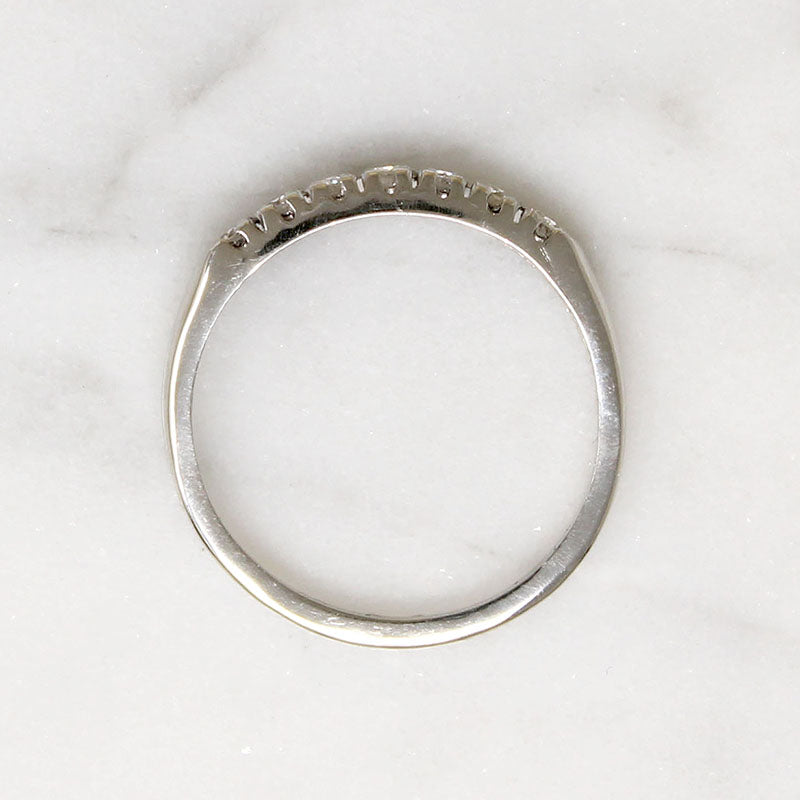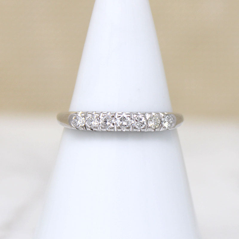 This clean-lined Retro wedding band has seven white and sparkling diamonds set in an arc across its top. The stylish platinum setting sits wonderfully low over the finger, with curved shoulders and a tapered band. An absolute classic that looks great alone or paired with your vintage engagement ring. Circa 1940.
