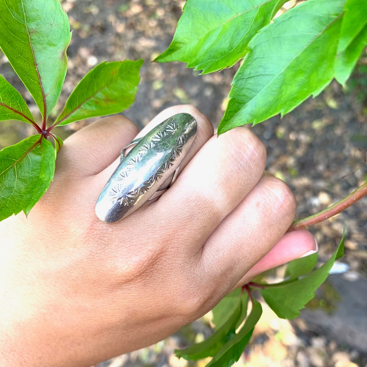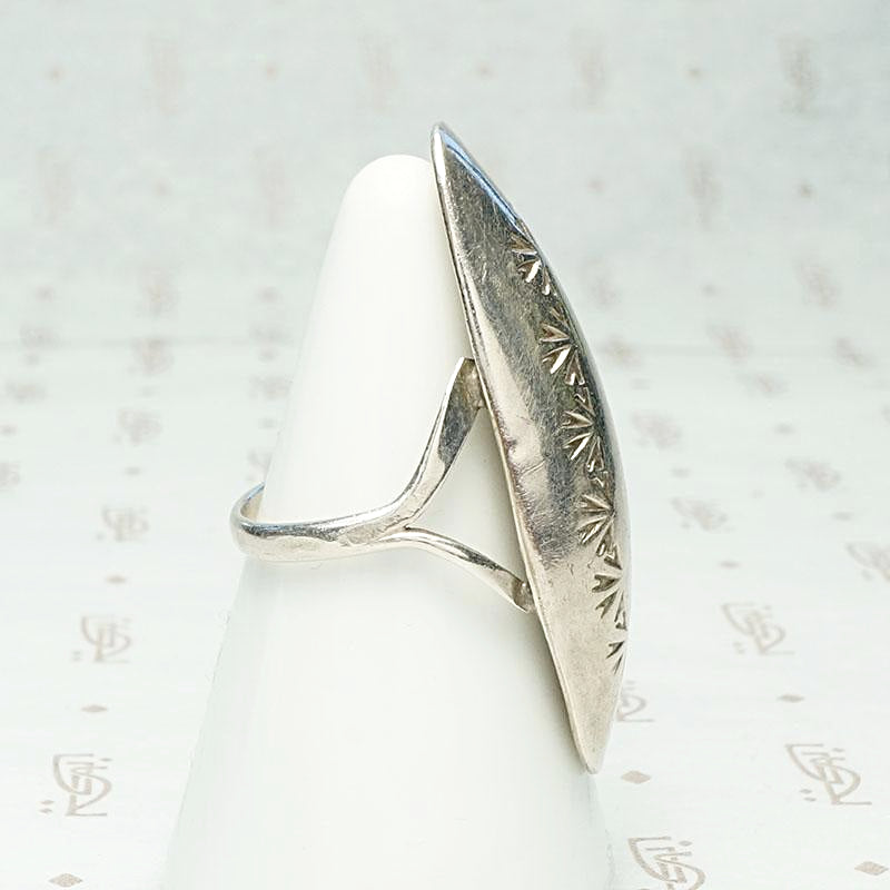 A gorgeous Native American statement ring in sterling silver. This ring features an elongated oval embellished with rocker designs in a sunrise pattern. The silver oval is set over a split shoulder band. Signed KS by Navajo artist Kirk Smith. This ring is so beautiful, wear it on your index finger for extra drama. Circa 1960.