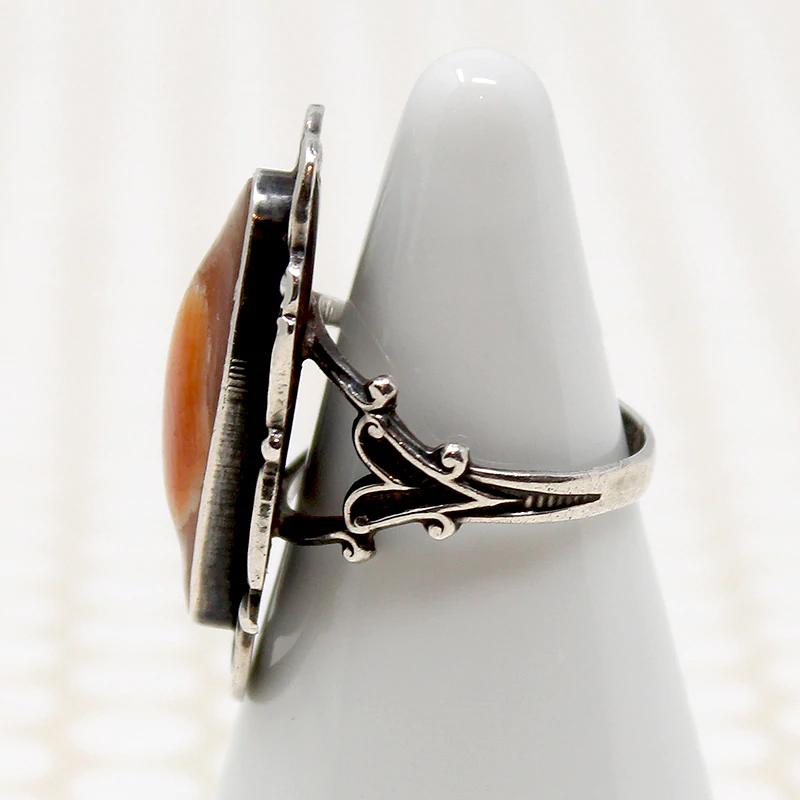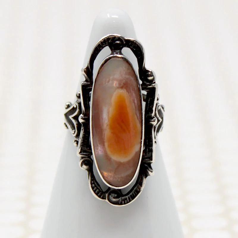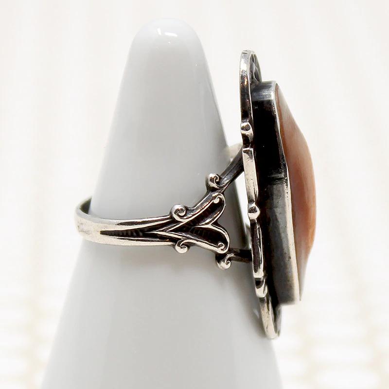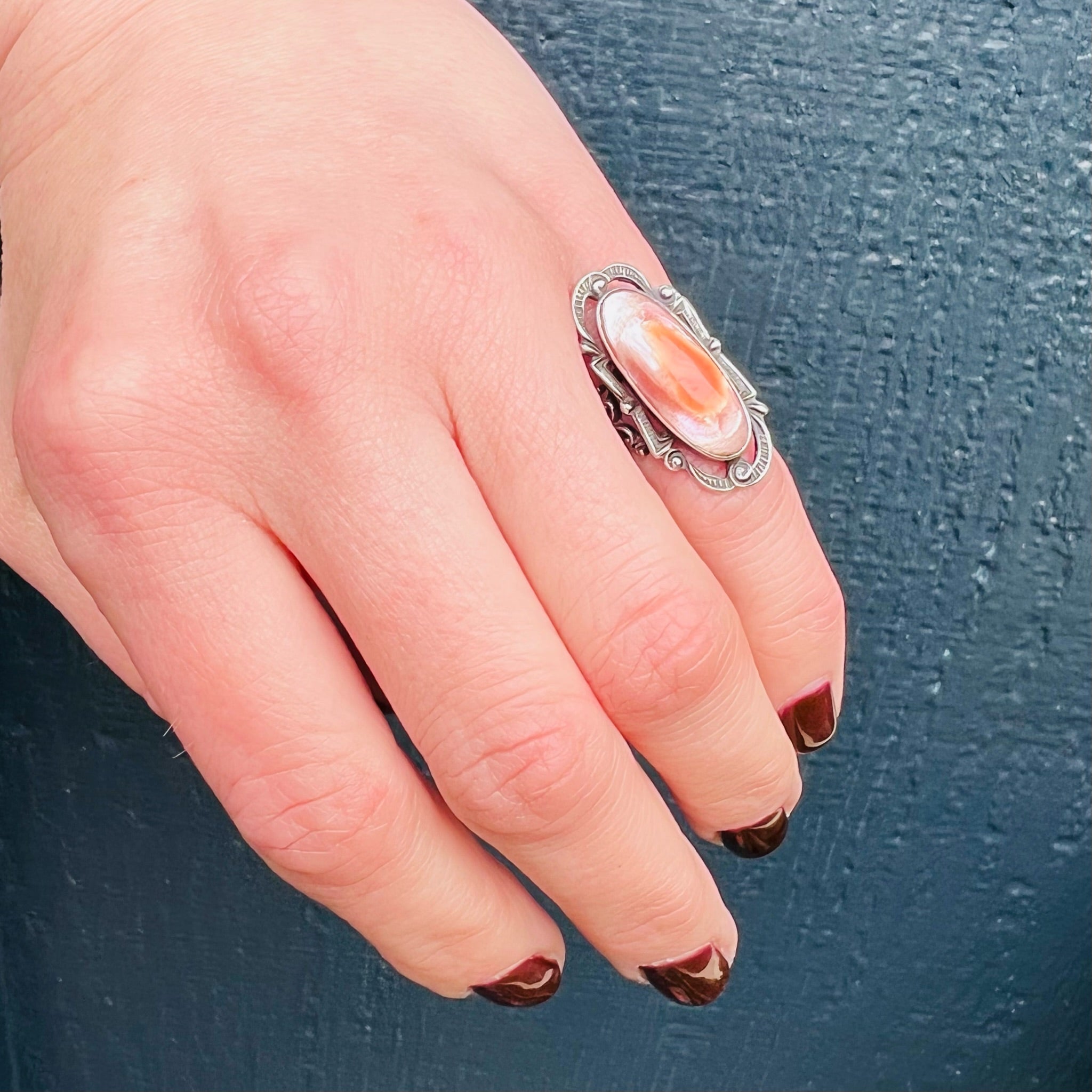 Beautiful Edwardian ring, with sunset-colored abalone in ornate sterling silver. The dreamy abalone is reminiscent of languid summer evenings and Creamsicles. The abalone is set in a long plaque of engraved, openwork silver. The decorative top sits above a split-shouldered band, with pretty hearts nestled in the clefts. A refined piece with a beachy, bohemian appeal. Circa 1910.