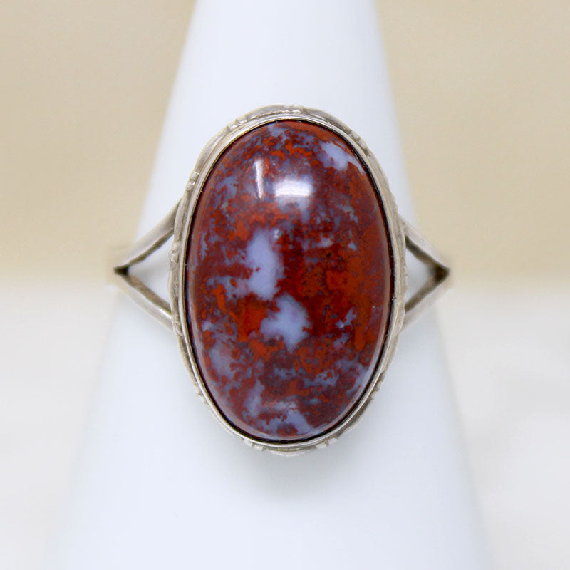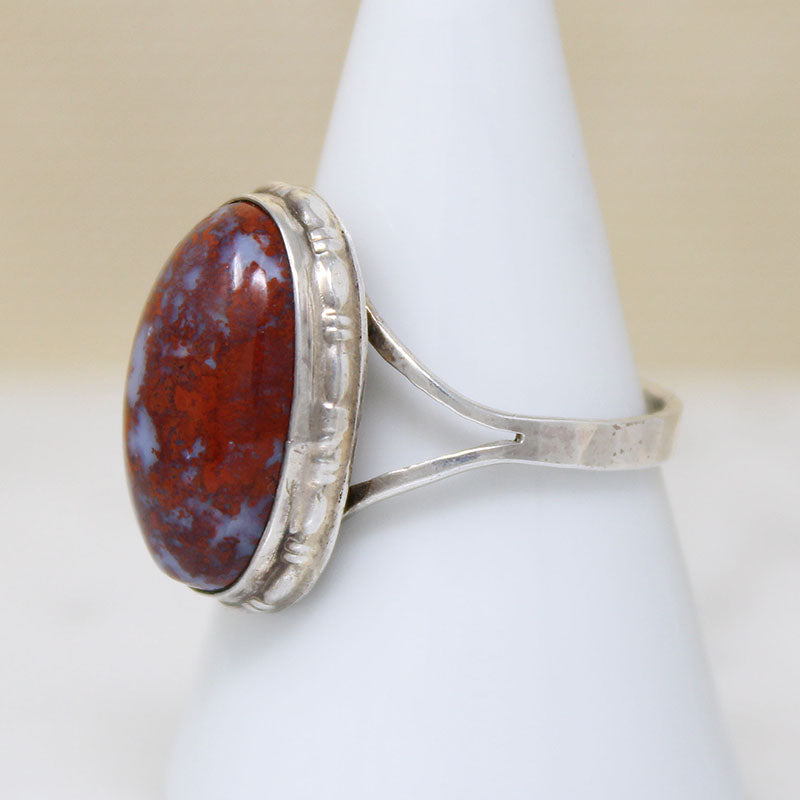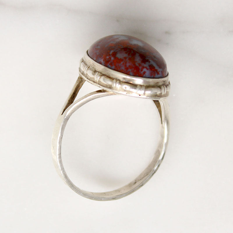 A superbly colored jasper of mottled scarlet and periwinkle set in a handsome sterling silver ring. Flakes of opaque red dapple a sea of translucent blue. The oval cabochon stone is set in a softly sculpted bezel, a subtle presentation highlighting the quality of the jasper. The decorative top of the ring sits atop wide split shoulders and a hammered band. Nature's incomparable beauty is on display here, and there's not much more to say. Circa 1930.