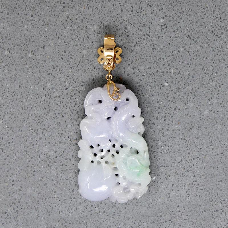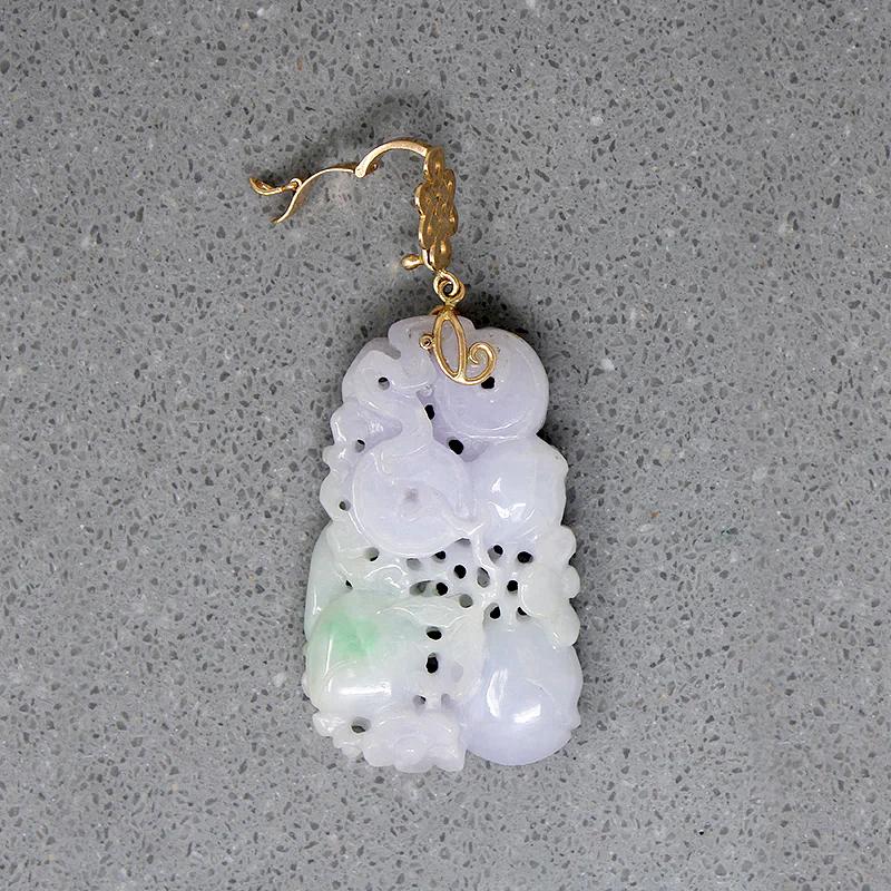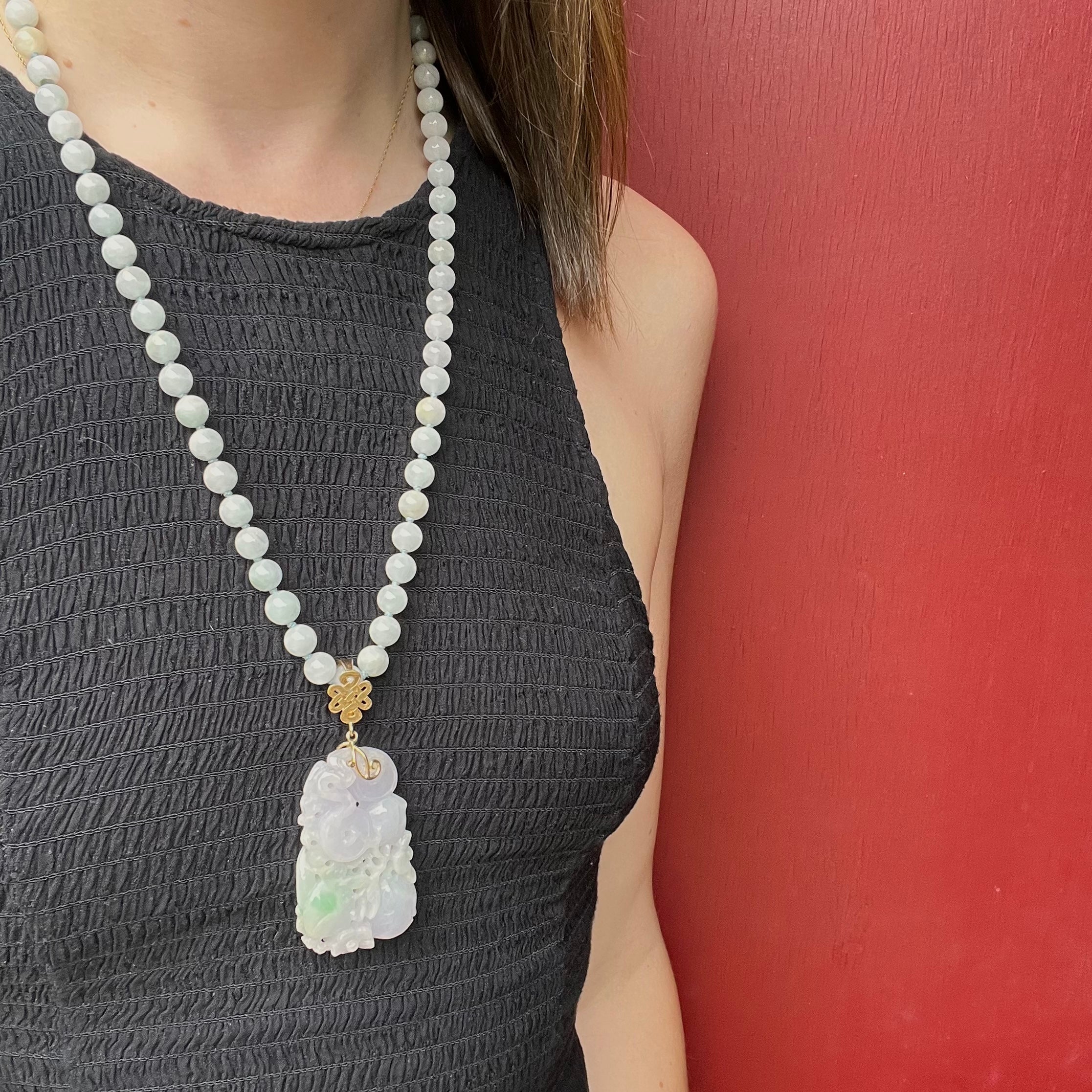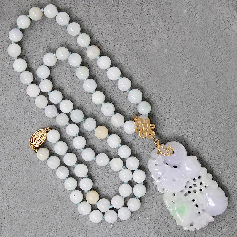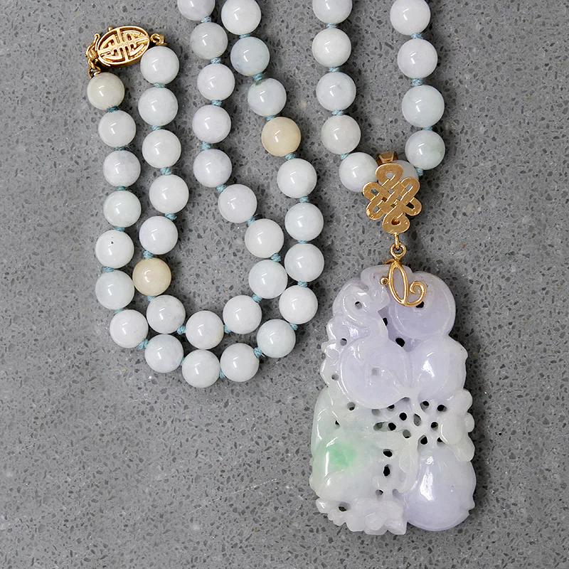 This superb necklace may be the star of the jade estate we have been listing. The pendant is an incredible piece of lavender jade, exquisitely carved with plums, coins and a dragon. The carving is crisp, delicate and lacy, and the pale purple jade has a charming spot of green. The pendant hangs on a decorative bale from a strand of lavender jade beads that are hand knotted on lavender silk and finished with a decorative bead clasp. The findings are all 14k yellow gold; the ingeniously hinged bale is in the form of a Scholar's Knot. Everything about this necklace is exquisite. Circa 1970.