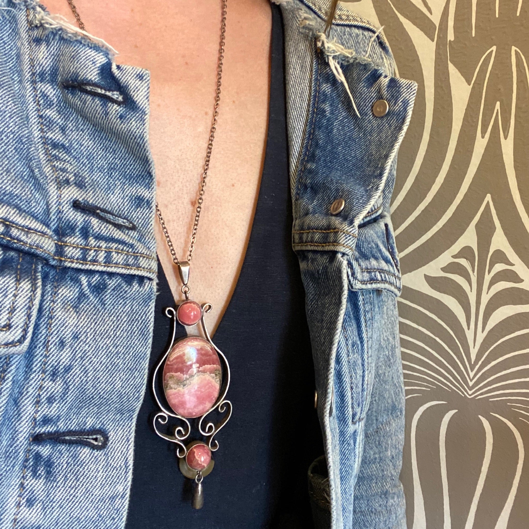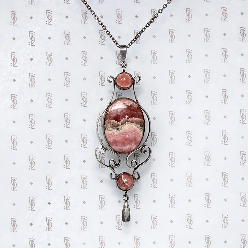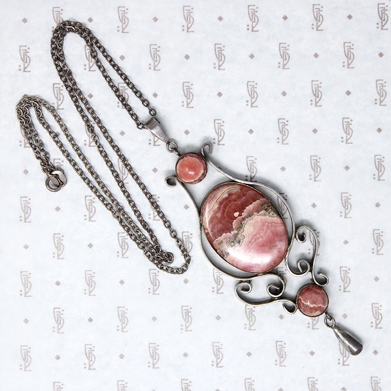 This superb necklace dates to the Mid 20th Century. The pendant is composed of handcrafted sterling silver scrollwork framing three incredible rhodochrosite gemstones and finished with a silver dangle. Dramatic in size and beauty, you won't see another piece like this one. Circa 1950.