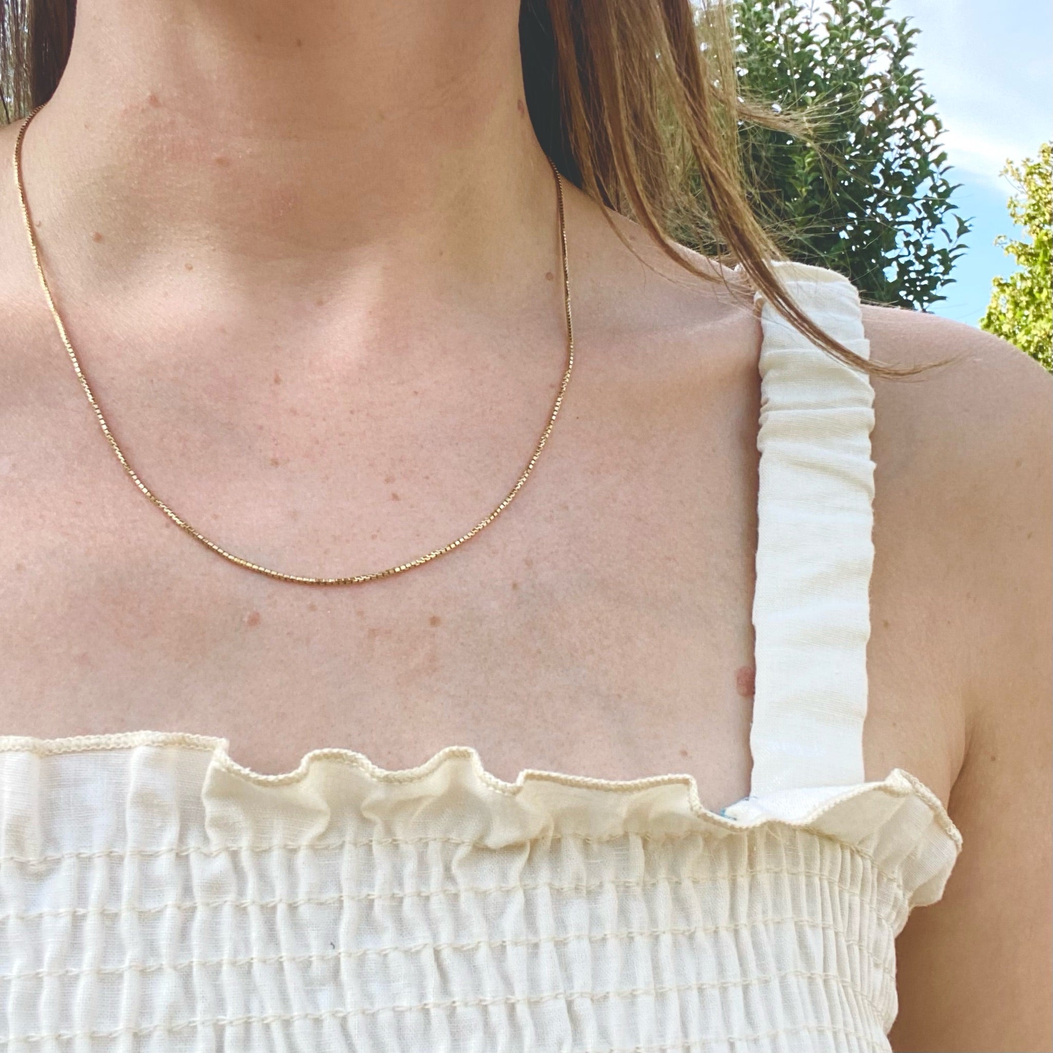A vintage box chain in 14k yellow gold. Supple and versatile with a pleasing weight, this is a perfect chain for all of your favorite pendants and lockets. Circa 1980.
